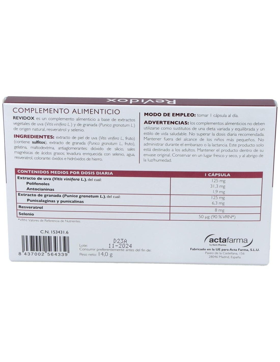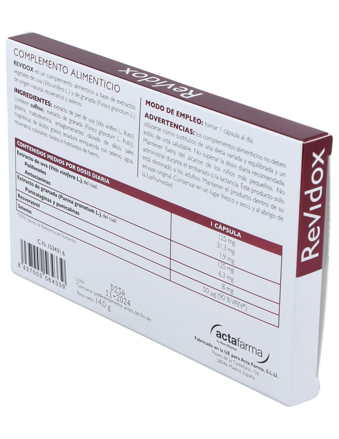 Revidox es un complemento alimenticio que posee una fórmula antiedad desarrollada para la protección celular gracias a la presencia de Selenio y compuesta además por un concentrado de activos de origen natural, como las Antocianinas de Uva, el Resveratrol y el Extracto de Granada.Es importante reforzar nuestras propias barreras antioxidantes, y una de las formas más efectivas de hacerlo es llevando una dieta sana y equilibrada rica en sustancias antioxidantes.Entre los activos de Revidox destaca el resveratrol con reconocidas propiedades antioxidantes y cardiosaludables que contribuye a proteger y mejorar nuestra salud celular. Contiene otros ingredientes como Extractos de Uva y Granada, además de Selenio, un mineral esencial que protege del daño oxidativo.Composición activa por cápsula: