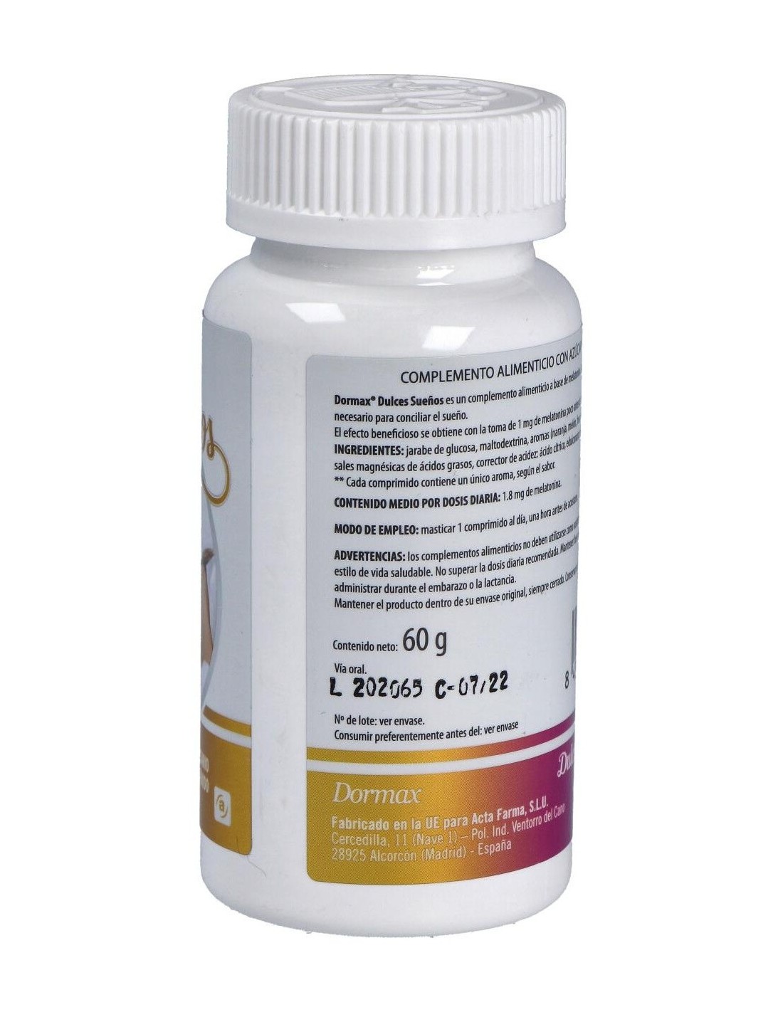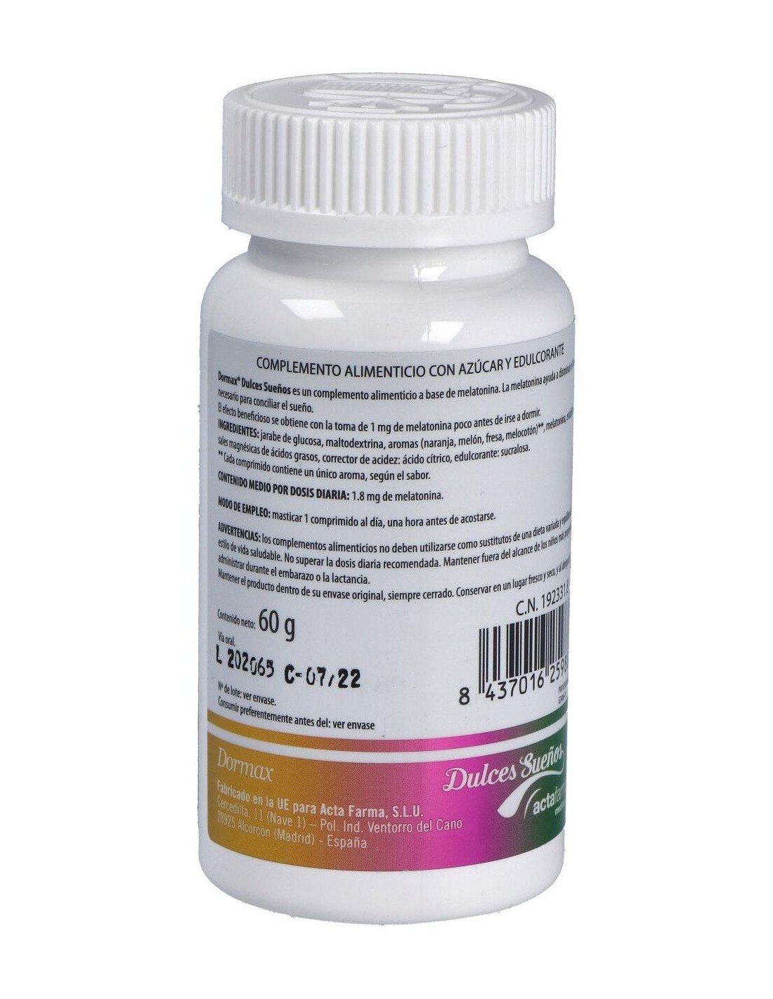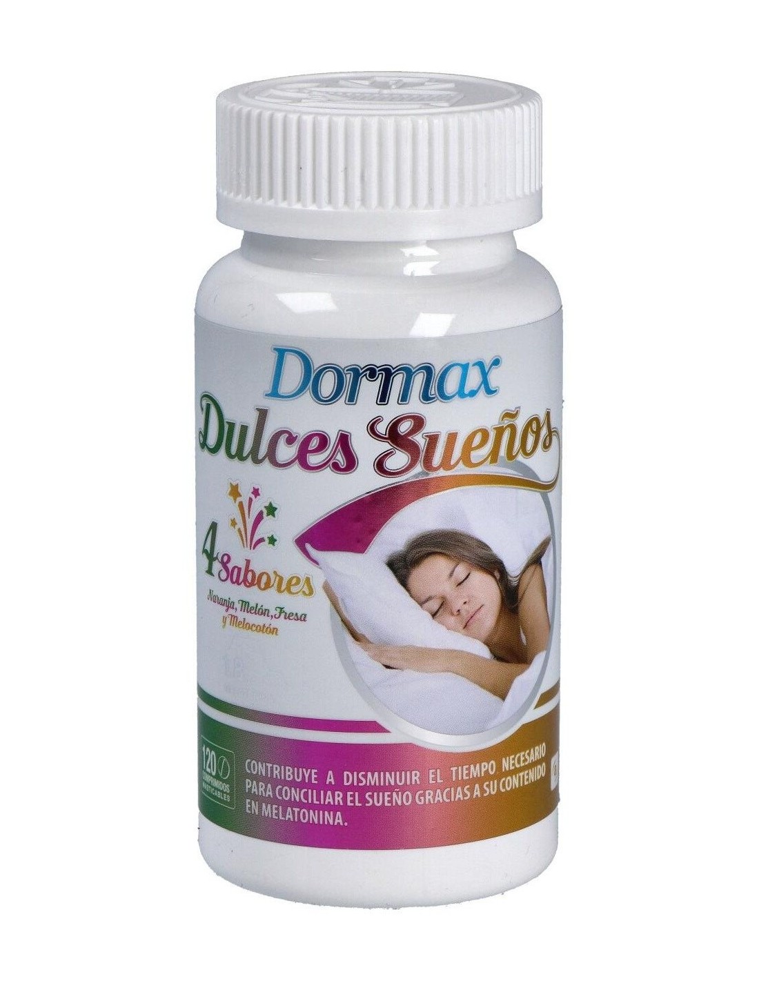 Dormax Dulces sueños de Actafarma es un complemento alimenticio a base de melatonina que ayuda a disminuir el tiempo necesario para conciliar el sueño.Composición activa por comprimido:1,8 mg de melatonina.Ingredientes:Jarabe de glucosa, maltodextrina, aromas (naranja, melón, fresa, melocotón)*, melatonina, estabilizante: sales magnésicas de ácidos grasos, corrector de acidez: ácido cítrico, edulcorante: sucralosa. (*) Cada comprimido contiene un único aroma, según sabor.Modo de empleo:Masticar 1 comprimido al día, una hora antes de acostarse.Presentación:Envase de 120 comprimidos masticables.