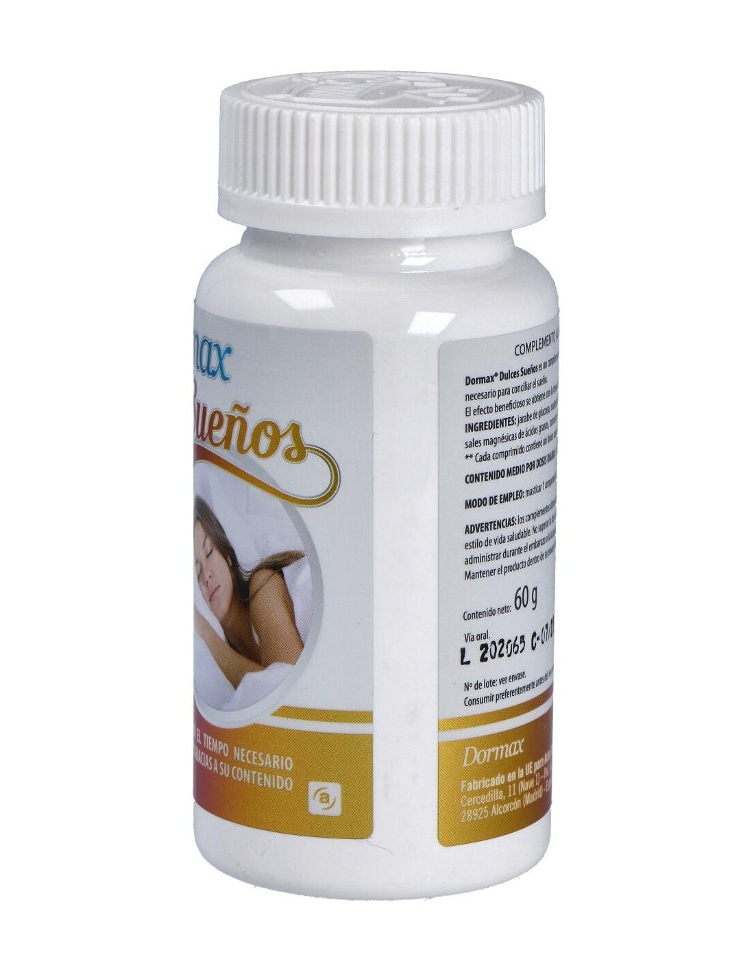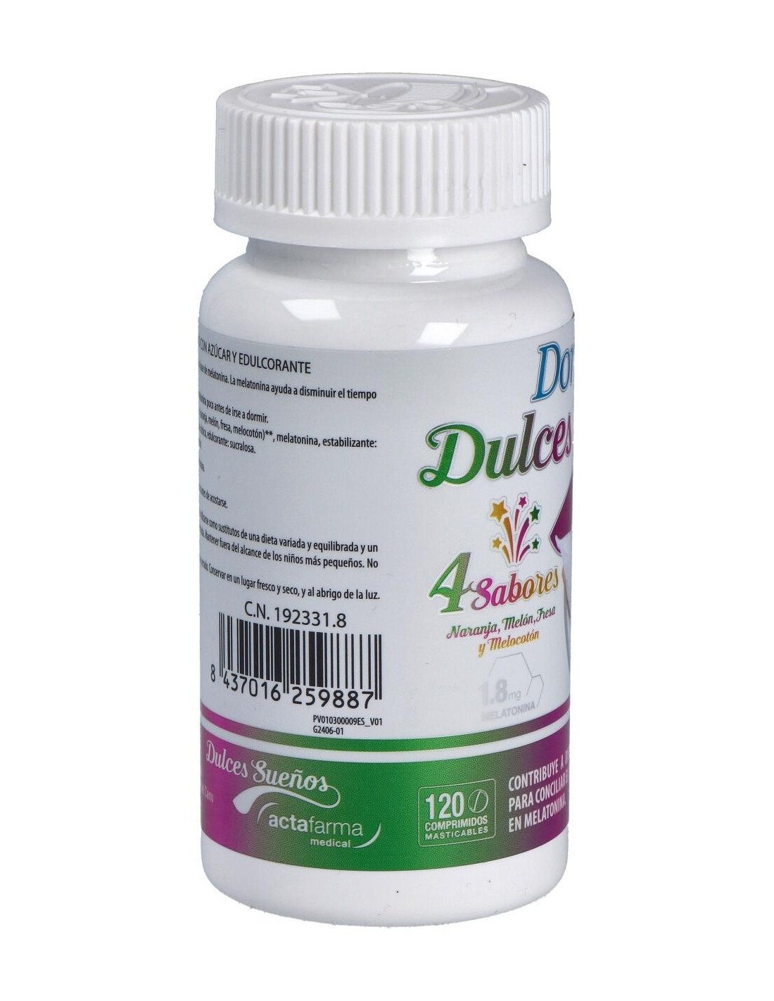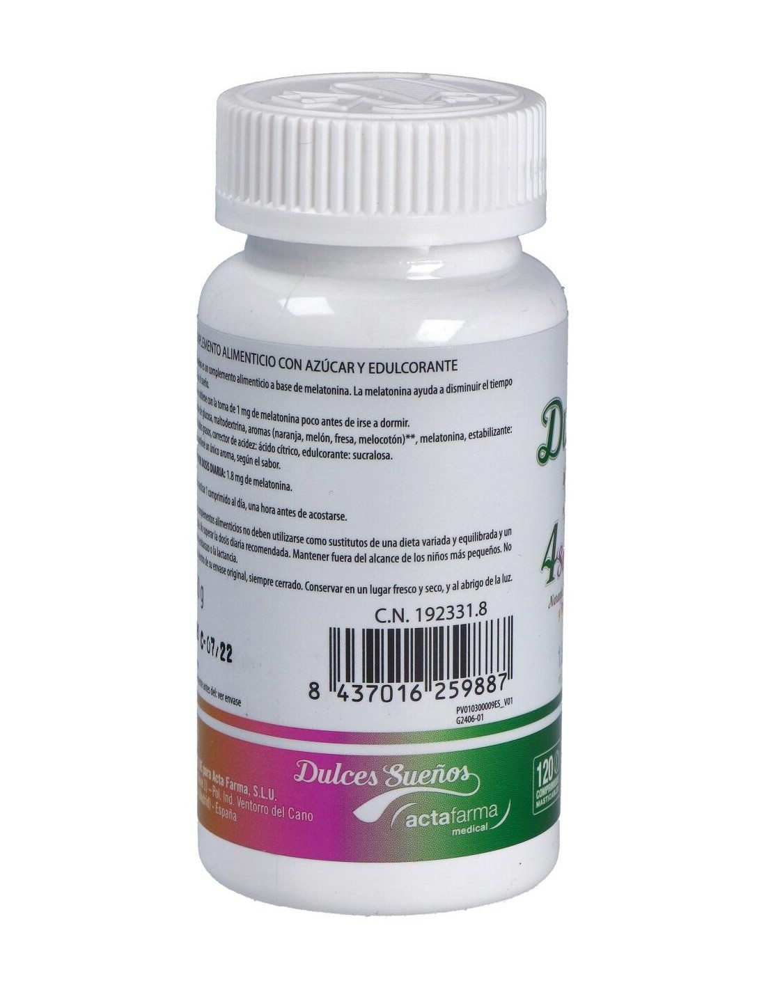 Dormax Dulces sueños de Actafarma es un complemento alimenticio a base de melatonina que ayuda a disminuir el tiempo necesario para conciliar el sueño.Composición activa por comprimido:1,8 mg de melatonina.Ingredientes:Jarabe de glucosa, maltodextrina, aromas (naranja, melón, fresa, melocotón)*, melatonina, estabilizante: sales magnésicas de ácidos grasos, corrector de acidez: ácido cítrico, edulcorante: sucralosa. (*) Cada comprimido contiene un único aroma, según sabor.Modo de empleo:Masticar 1 comprimido al día, una hora antes de acostarse.Presentación:Envase de 120 comprimidos masticables.