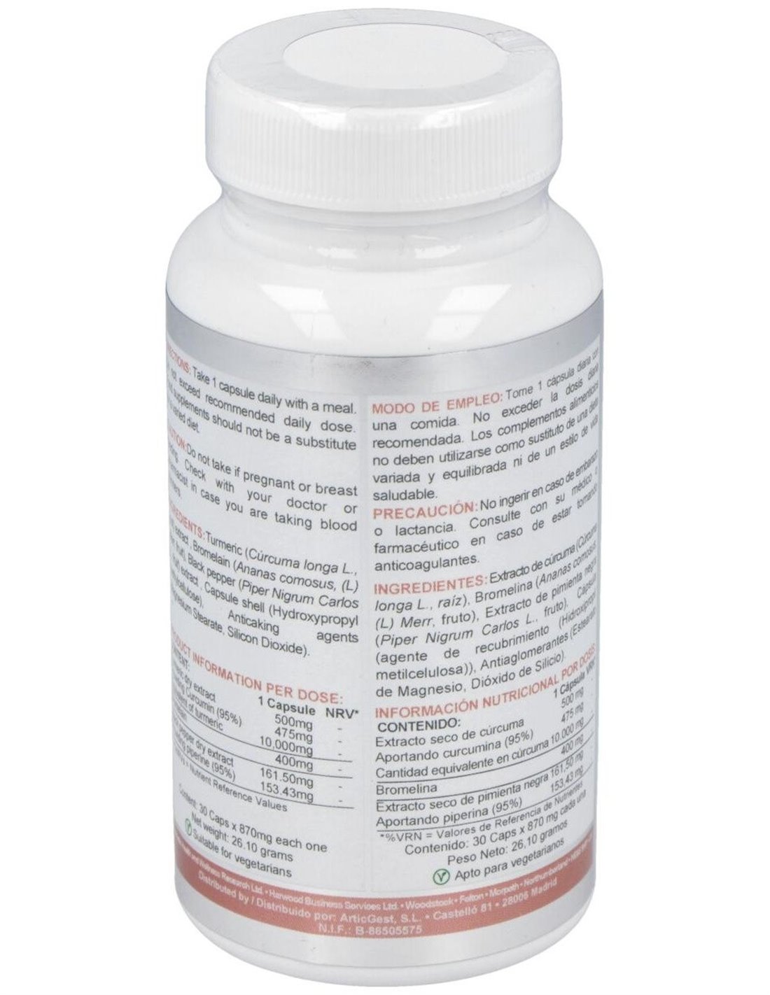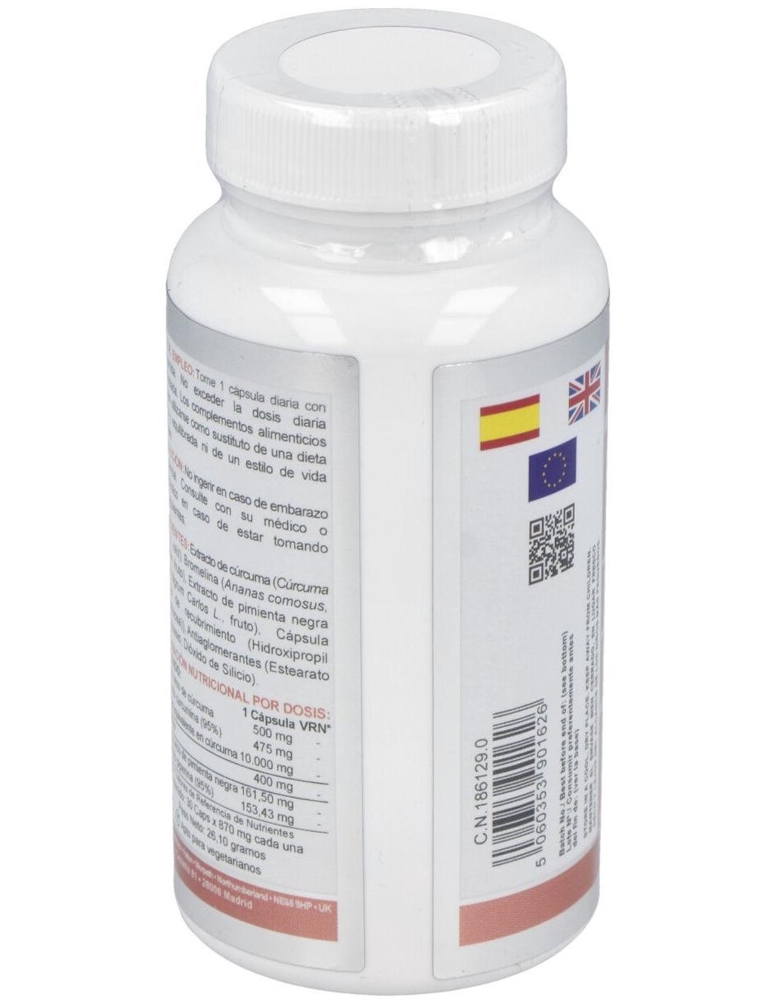 - Cada cápsula contiene 10,000 mg de curcumina, un compuesto derivado de la cúrcuma reconocido por su perfil antioxidante.