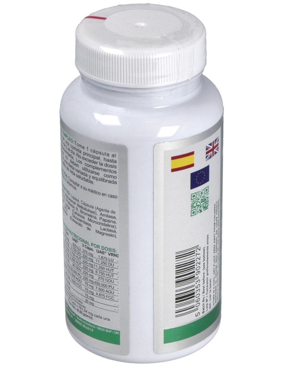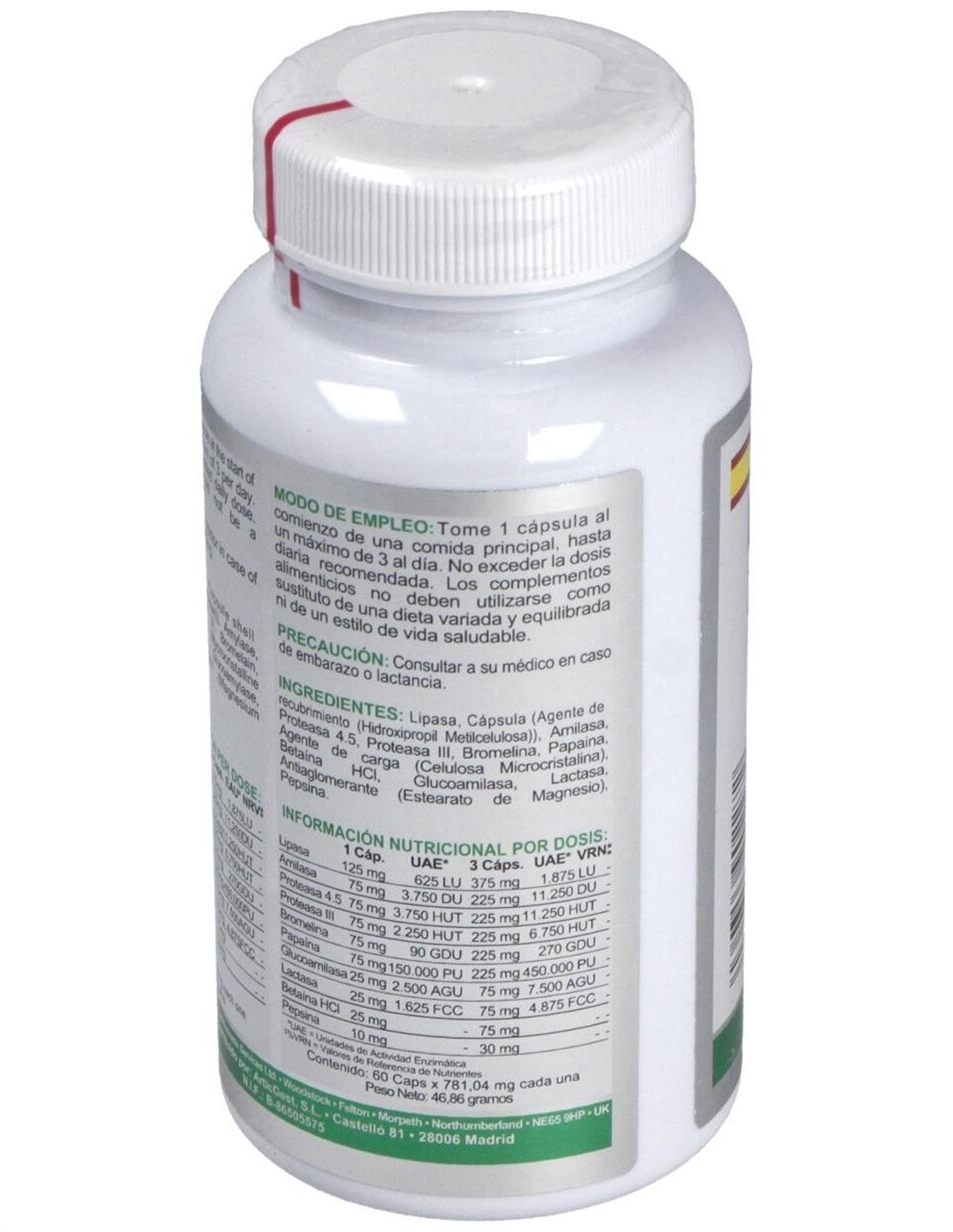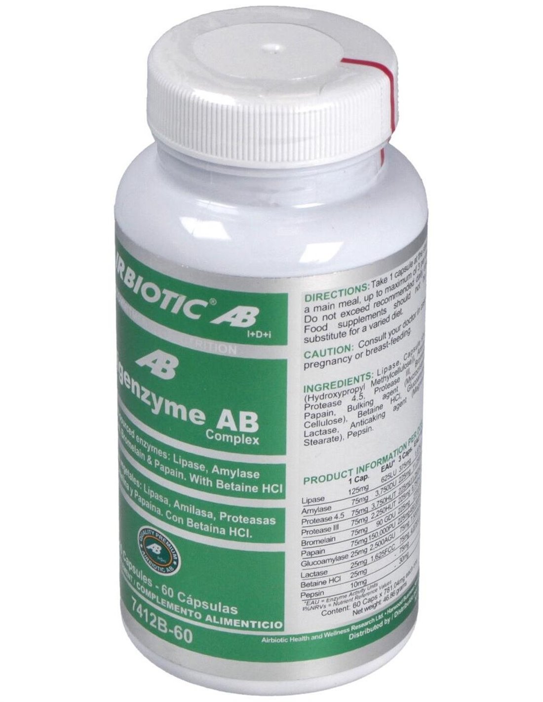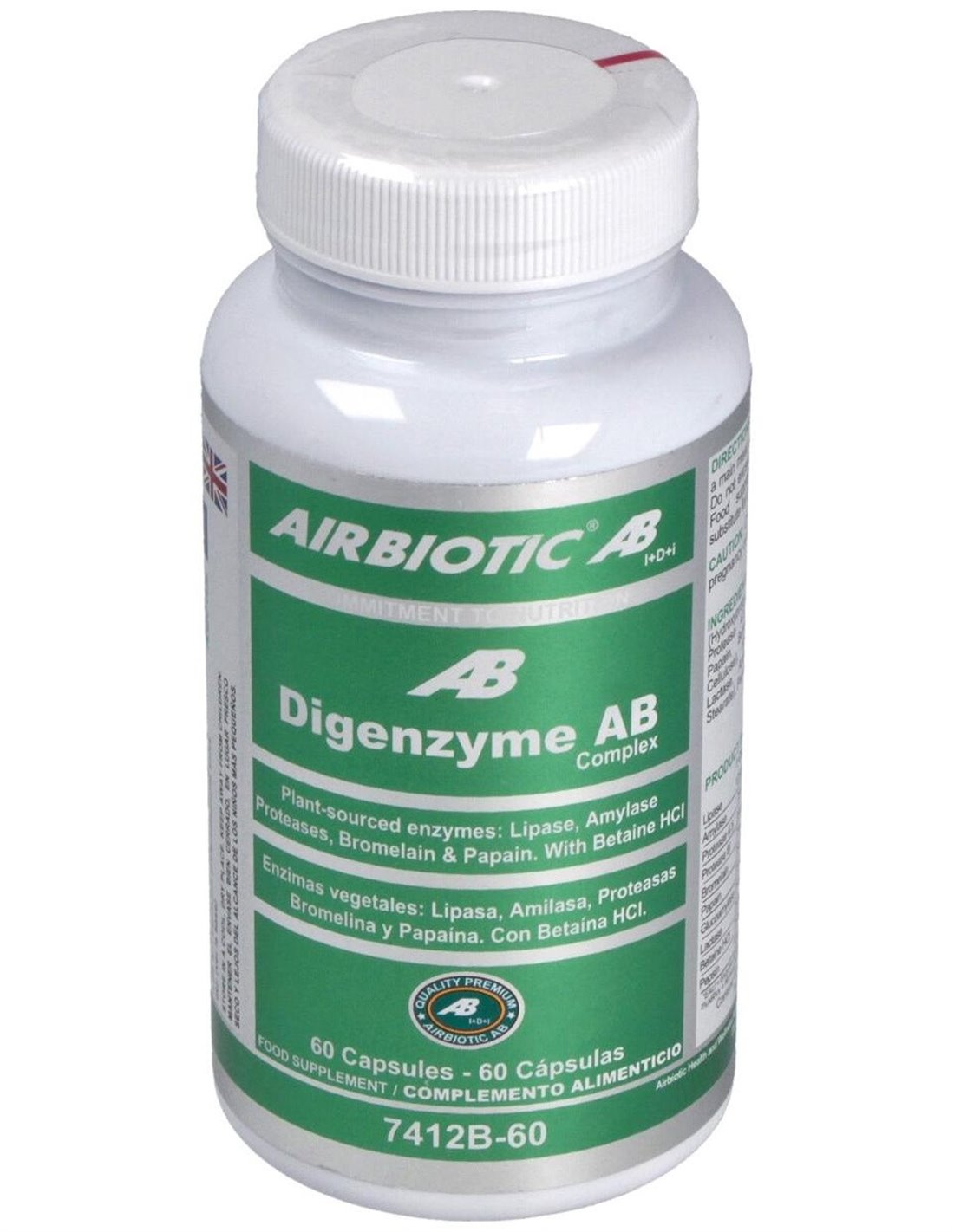 Digenzyme AB Complex proporciona un amplio espectro de enzimas de origen vegetal: bromelina, papaína, lipasa, amilasa, pepsina, proteasas y glucoamilasa. Se ha añadido una cantidad relevante de lactasa para mejorar la digestión de lactosa en personas con problemas de digestión de la misma. También aporta betaína HCl y cloruro que contribuye a la producción de ácido clorhídrico estomacal y, con ello, a una normal digestión.