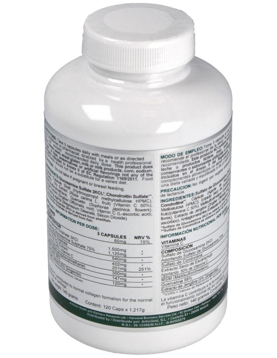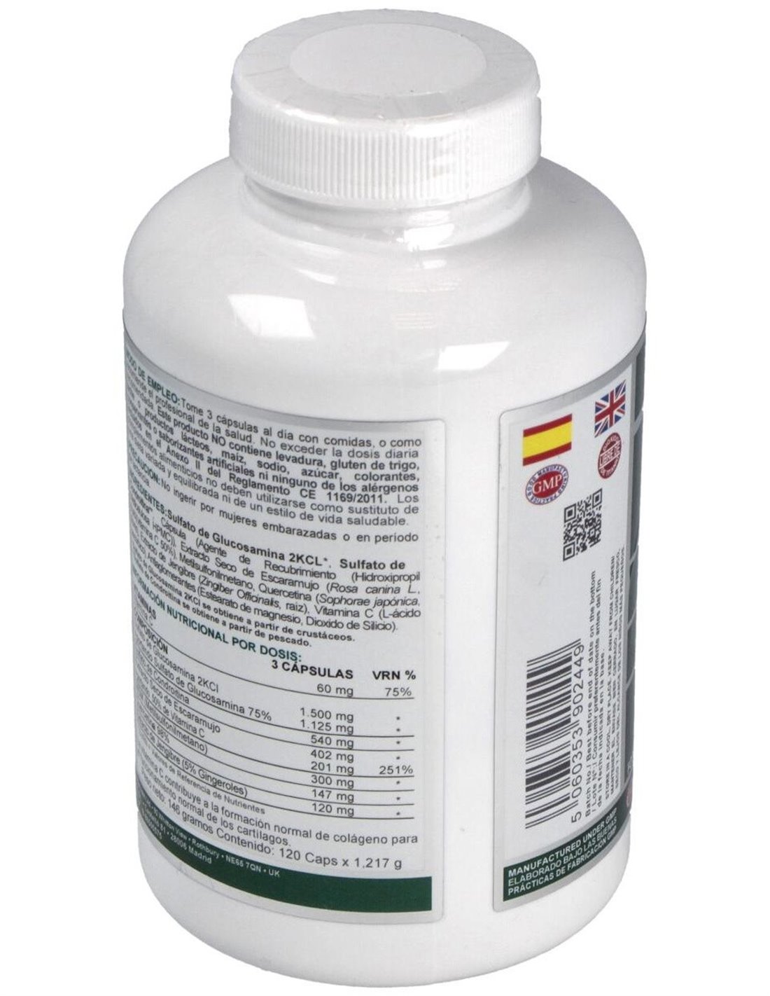 Glucosamine Max es una de las fórmulas articulares preferidas por los consumidores. Tanto la selección de ingredientes como sus cantidades se han analizado cuidadosamente para potenciar al máximo sus sinergias, dando como resultado un producto único y exclusivo. Los dos nutrientes principales de Glucosamine Max son el sulfato de glucosamina y el sulfato de condroitina, de los que se aportan 1.500 mg y 600 mg respectivamente por dosis diaria. Estas cantidades son realmente muy superiores a las que se pueden encontrar en otros complementos similares y es uno de los motivos por los que nuestro productos es tan apreciado por los consumidores. Completan la fórmula MSM (Metilsulfonilmetano), jengibre, quercitina, escaramujo y vitamina C, que contribuye a la formación normal de colágeno para el funcionamiento normal normal de los cartílagos. Ingredientes activos por 3 cápsulas: