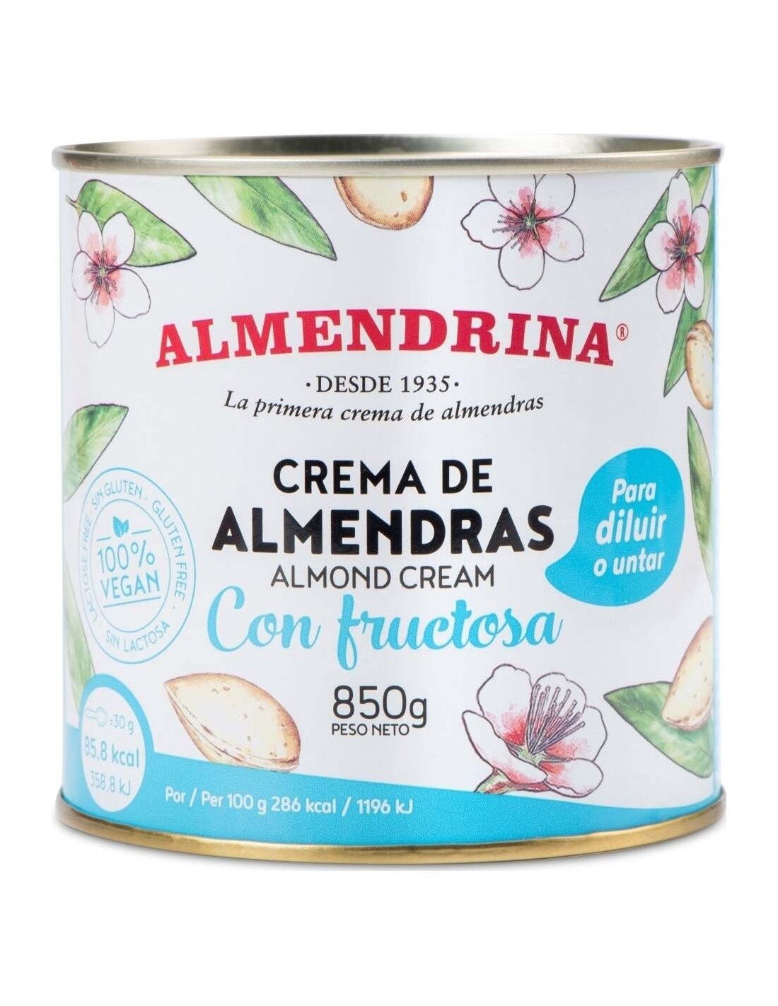 Almendrina Crema Almendras Leche sin Azúcar sin Gluten 850g es una crema de almendras tradicional con valor ecológico añadido. Elaborada con agua y almendras ecológicas, endulzada con fructosa.