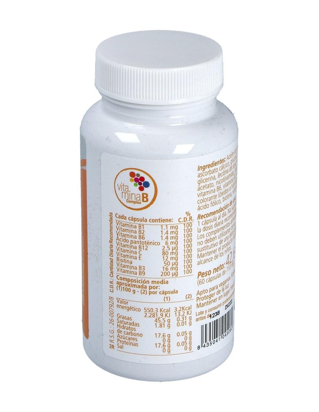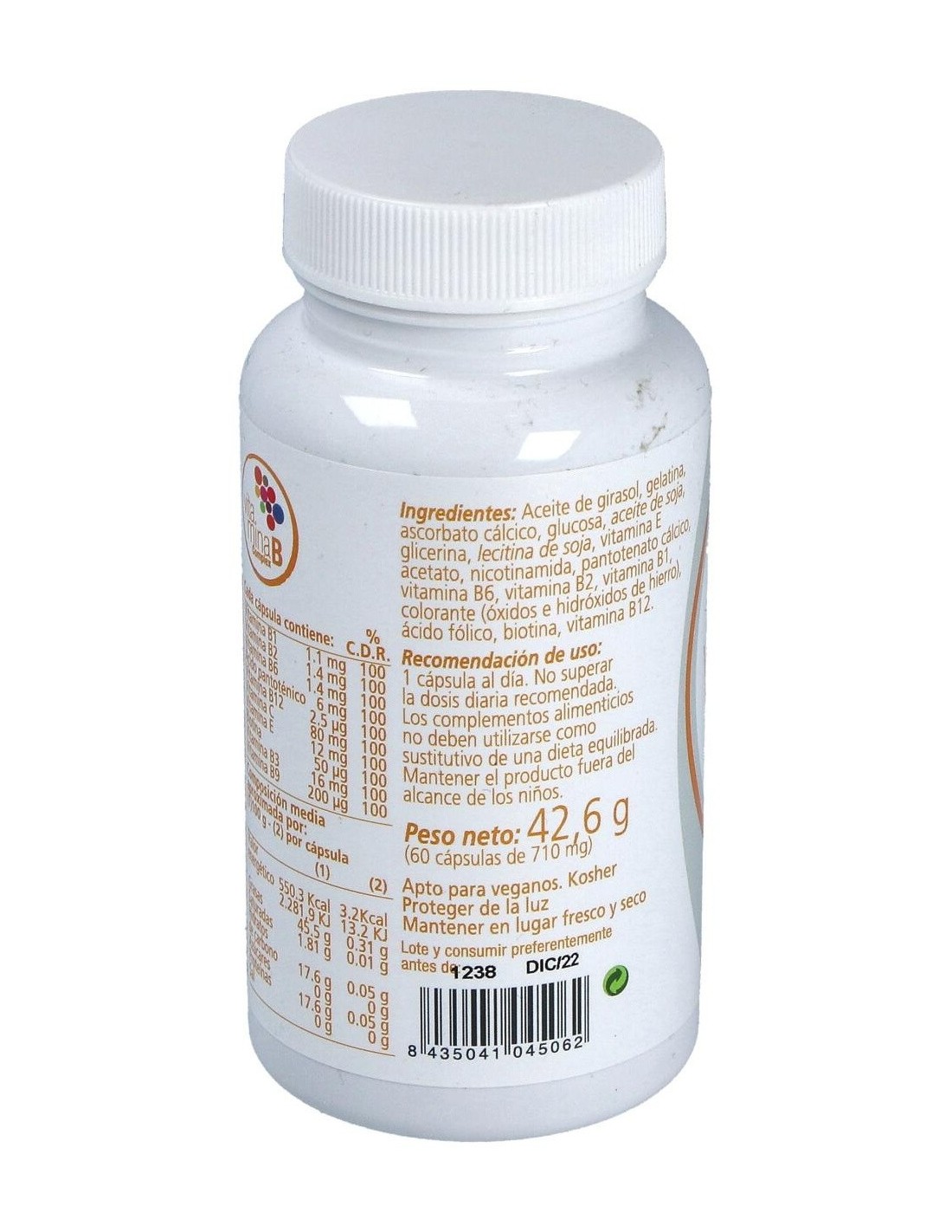 Las vitaminas del grupo B conocidas también con el nombre de complejo vitamínico B, son sustancias frágiles, solubles en agua, varias de las cuales son sobre todo importantes para metabolizar los hidratos de carbono. Cada una de ellas está relacionada con diversos procesos.La tiamina o vitamina B1 actúa como catalizador en el metabolismo de los hidratos de carbono, permitiendo metabolizar el ácido pirúvico y haciendo que los hidratos de carbono liberen su energía.La vitamina B2 o riboflavina actúa como parte de un grupo de enzimas llamadas flavoproteínas, que intervienen en el metabolismo de carbohidratos, grasas y proteínas. La riboflavina es indispensable para el crecimiento normal y la conservación de los tejidos. Si existe un déficit, algunos tejidos quedan más dañados que otros.La nicotinamida o vitamina B3, funciona como coenzima para liberar la energía de los nutrientes. A semejanza de la tiamina y riboflavina, la niacina también hace las veces de coenzima en el metabolismo de energía.La vitamina B6 es un conjunto de tres compuestos químicos semejantes: piridoxina (PN), piridoxal (PL) y piridoxamina (PM). La importancia metabólica de la vitamina B6 depende de su conversión en piridoxal-5-fosfato (PALP), que funciona como enzima en numerosas reacciones bioquímicas, casi todas relacionadas de alguna manera con los aminoácidos.La vitamina B12 también se conoce como cianocobalamina, es necesaria en cantidades ínfimas para la formación de nucleoproteínas, proteínas y glóbulos rojos, y para el funcionamiento del sistema nervioso. Interviene en la síntesis del ADN.El ácido fólico o vitamina B9 es una coenzima necesaria para la formación de proteínas estructurales y hemoglobina. Interviene en la síntesis de bases púricas y pirimidínicas y en la eritropoyesis.El ácido pantótenico interviene en el metabolismo celular como coenzima en la liberación de energía a partir de las grasas, proteínas y carbohidratos.La biotina es un cofactor para la carboxilación enzimática de cuatro sustratos: piruvato, acetil-CoA (CoA), propionil-CoA y b-metilcrotonil-CoA. Como tal tiene importancia en el metabolismo tanto de carbohidratos como de lípidos.El ácido ascórbico o vitamina C es una vitamina hidrosoluble y no se almacena en el cuerpo por un largo período de tiempo, se elimina en pequeñas cantidades a través de la orina.La vitamina E (alfa-tocoferol) actúa como un antioxidante evitando la oxidación de constituyentes celulares esenciales y la formación de productos tóxicos de oxidación, como los productos de peroxidación formados a partir de ácidos grasos insaturados que se han detectado en su ausencia.Composición activa por cápsula: