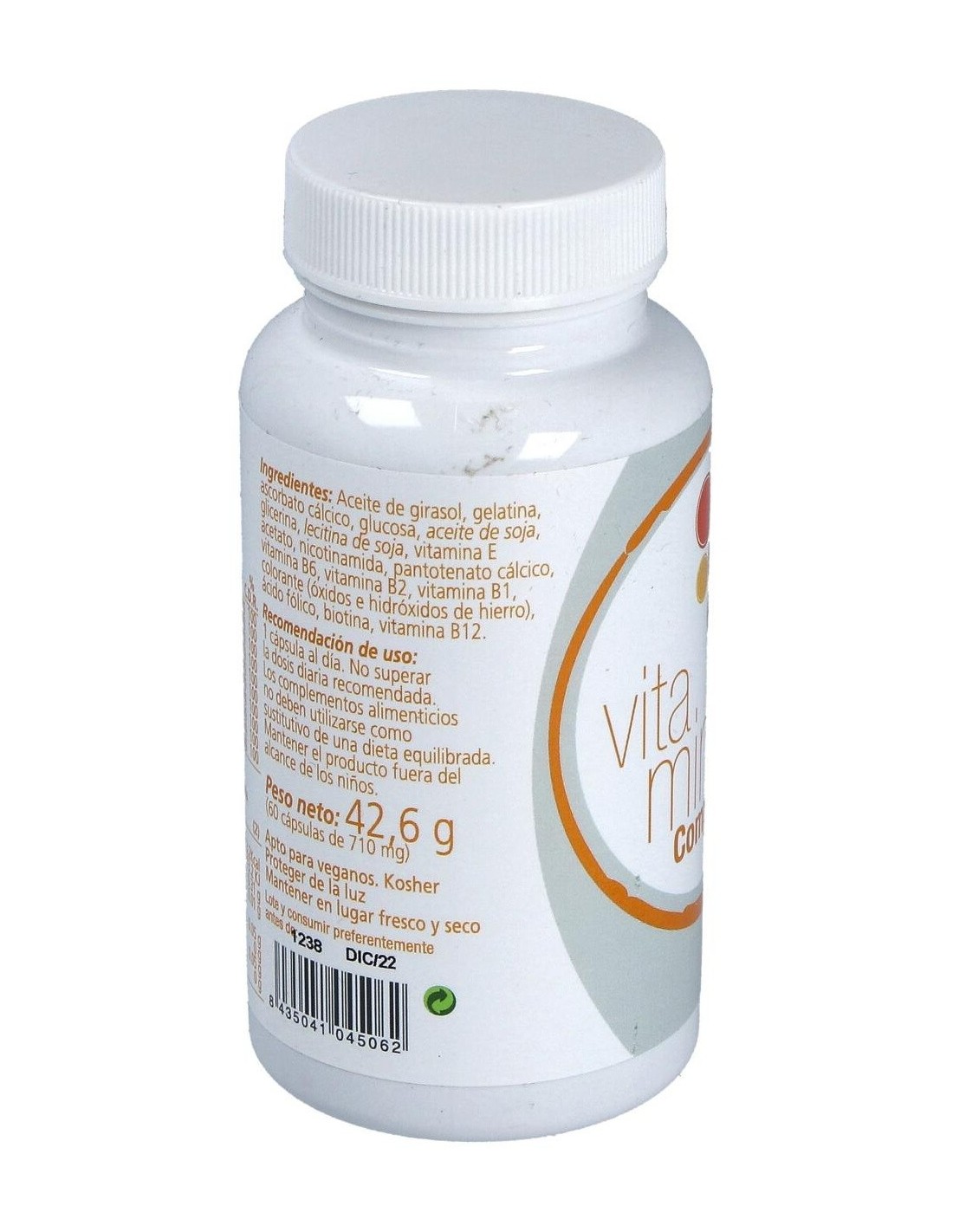 Ingredientes:Aceite de girasol, gelatina comestible, ácido L- ascórbico, glucosa, aceite de soja, glicerina, lecitina de soja, DL-alfa-tocoferol, nicotinamida, D-pantotenato cálcico, colorante (óxidos e hidróxidos de hierro), cianocobalamina, clorhidrato de piridoxina, monohidrato de piridoxina, riboflavina, ácido pteroilmonoglutámico, D- biotina.Modo de empleo:Tomar 1 cápsula al día.Presentación:Envase de 60 cápsulas.