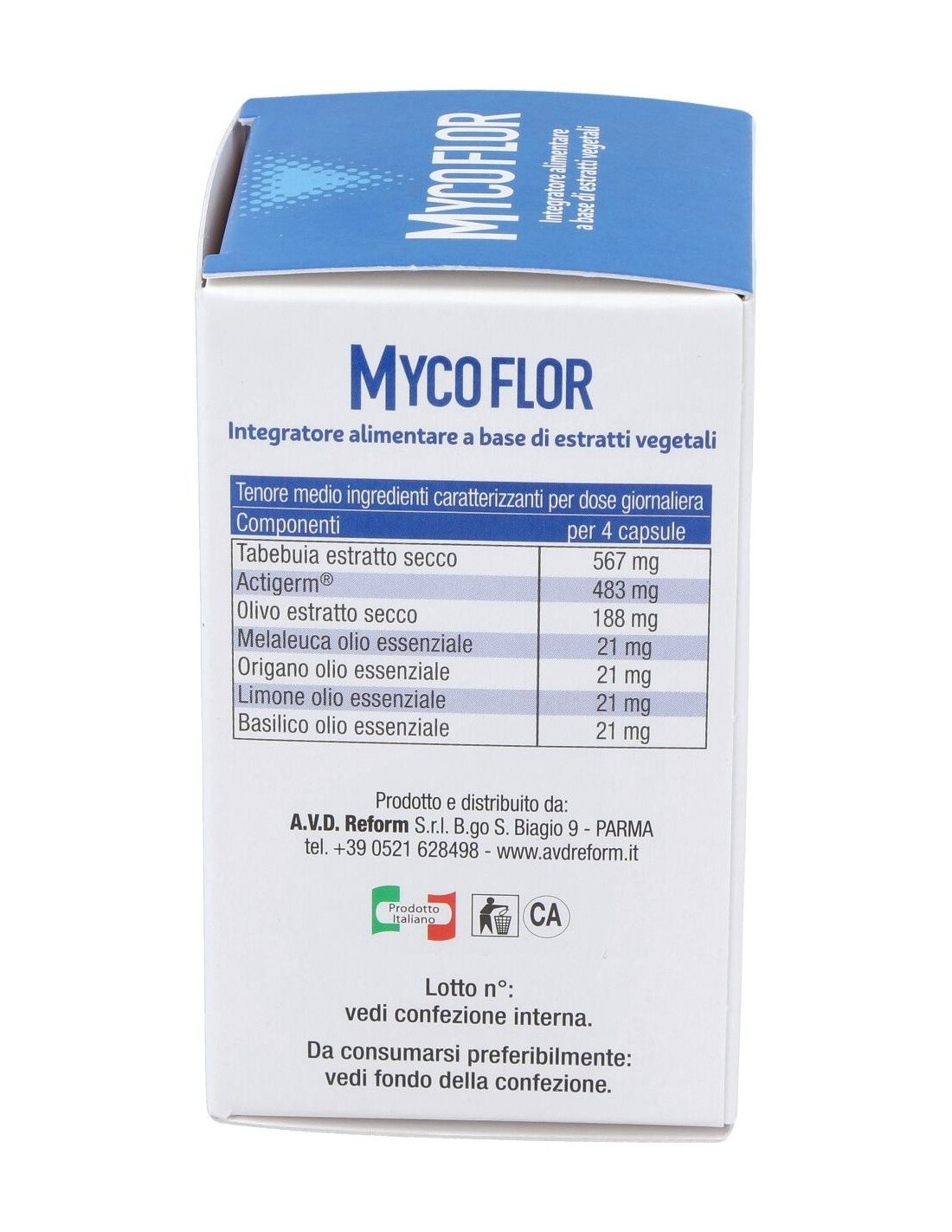 Mycoflor es un complemento alimenticio a base de aceites esenciales y extractos vegetales con acción antibacteriana y antifúngica que actúa favorablemente como protector de las mucosas, contrarrestando el establecimiento de hongos y bacterias nocivos o potencialmente patógenos.Mycoflor actúa en el intestino, también como inmunomodulador, siendo particularmente eficaz en casos de candidiasis intestinal, vulvovaginal, vaginosis bacteriana por flora mixta, síndrome de sobrecrecimiento bacteriano (SIBO), infecciones urinarias recurrentes, tendencia al estreñimiento obstructivo y en preparación para «terreno «al uso de probióticos específicos.En la base de la excelente eficacia de Mycoflor se encuentra su compleja y estudiada formulación, con aceites esenciales de Melaleuca alternifolia, Orégano, Limón y Albahaca, como antimicrobiano, antidermatitis, antibacteriano, antimicótico, anticandida, Actigerm®, un extracto concentrado de Thymus vulgaris, Rosmarinus officinalis, Salvia lavandulifolia, Origanum vulgare, con propiedades antibacterianas, antiinflamatorias y antioxidantes, también útiles en la lucha contra los trastornos que afectan al aparato respiratorio y la cavidad bucal, como es el caso de la candidiasis oral. Adicionalmente están presentes en la formulación Tabebuia impetiginosa, como agente inmunomodulador, Olea europaea ES, con acción inmunoestimulante, antibacteriana y antifúngica.Composición activa por 4 cápsulas: