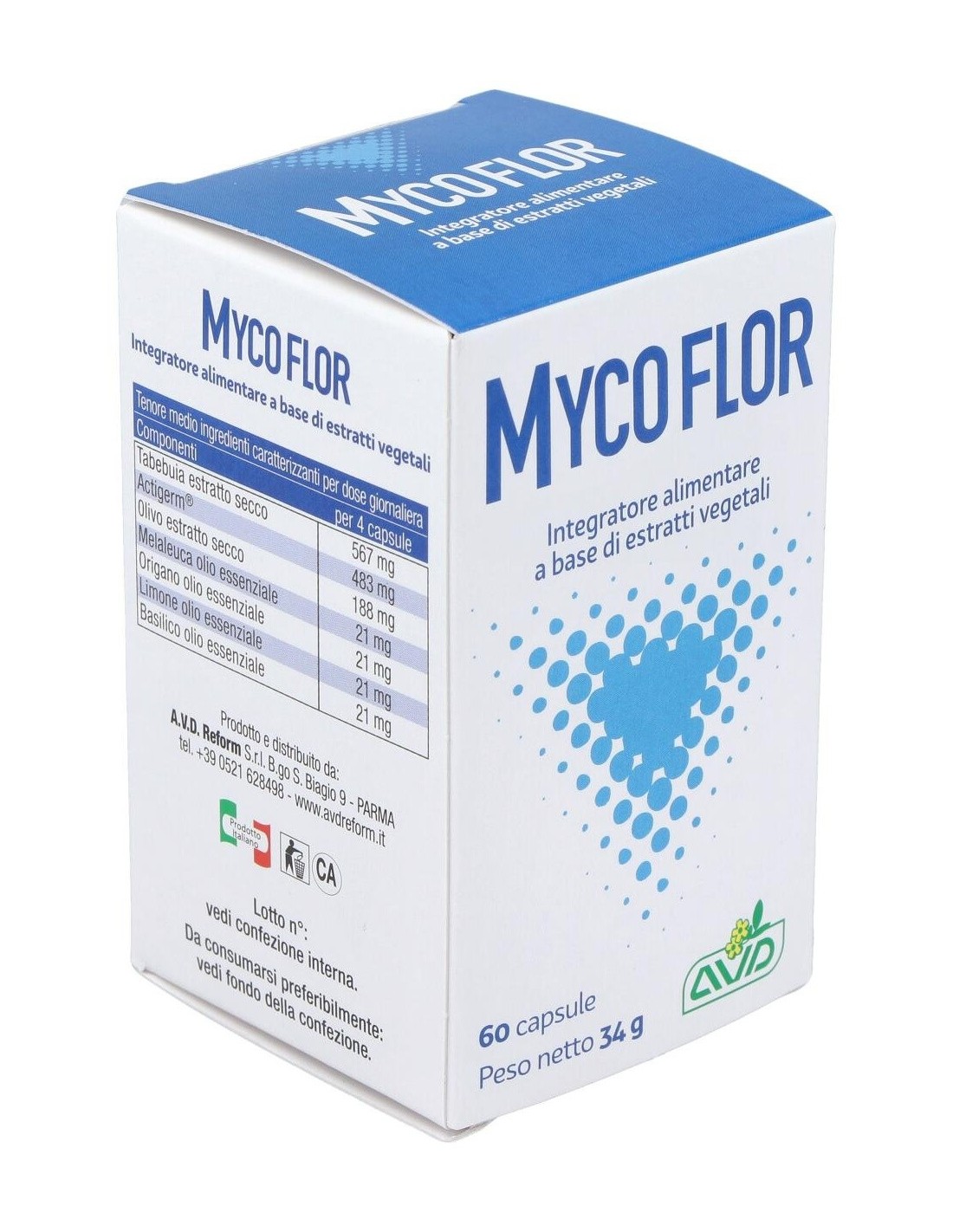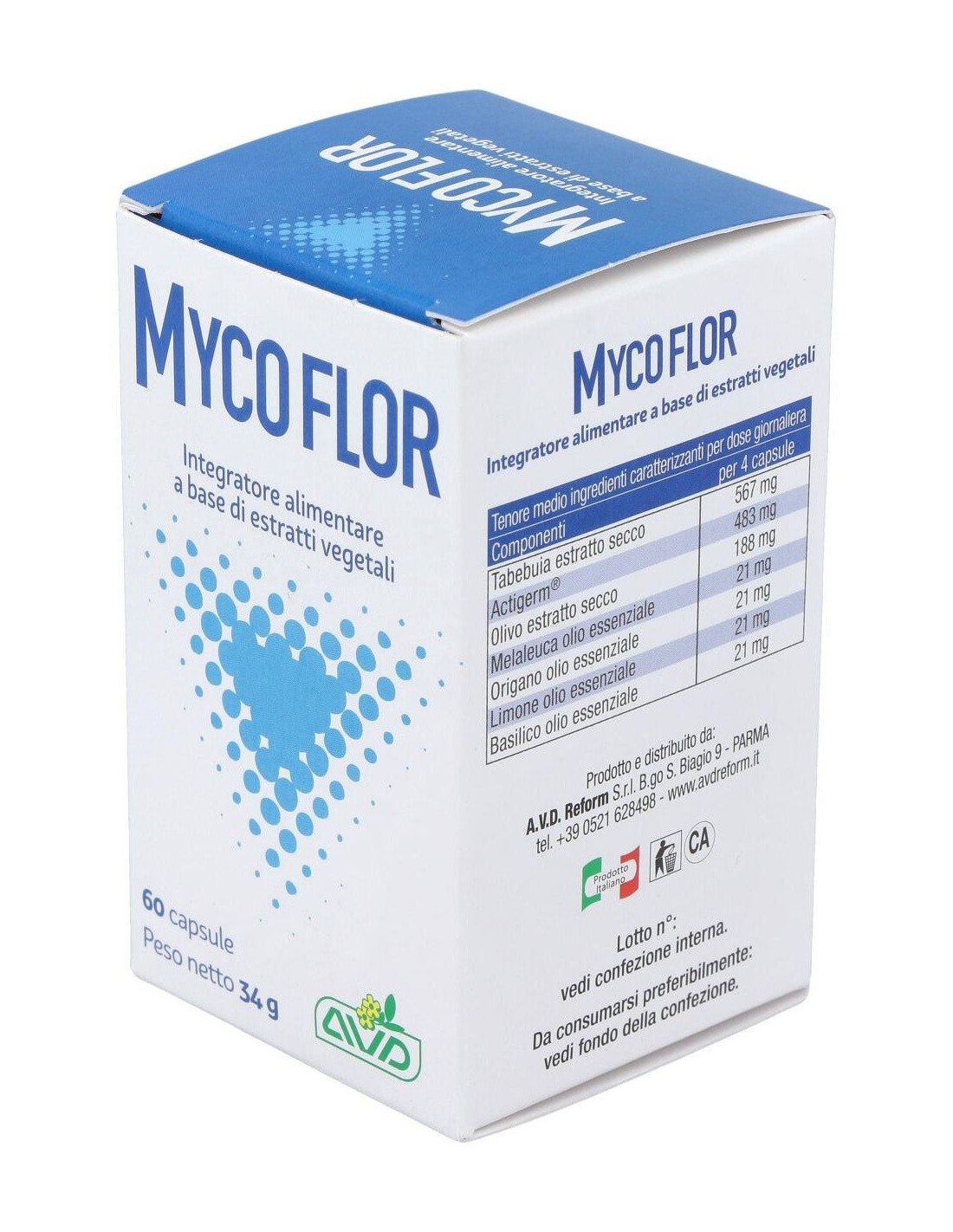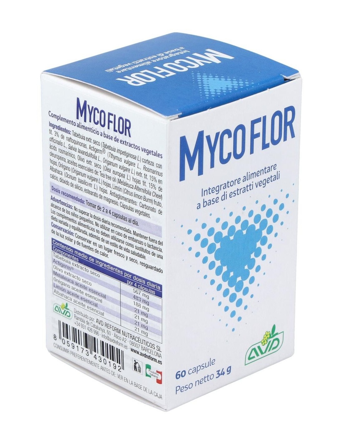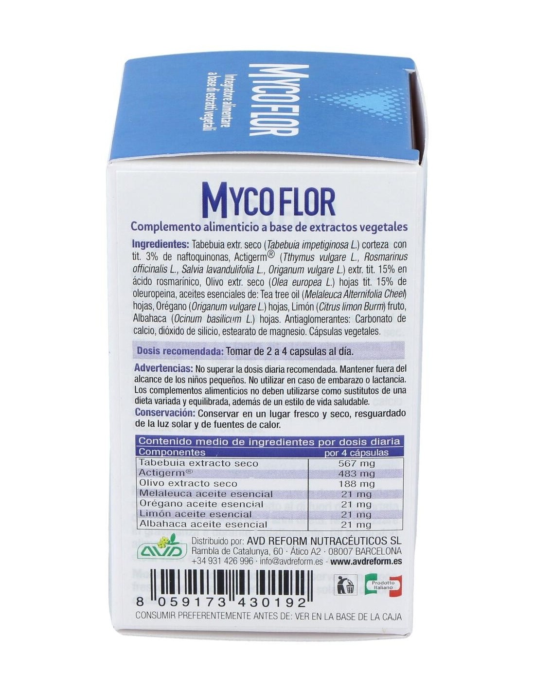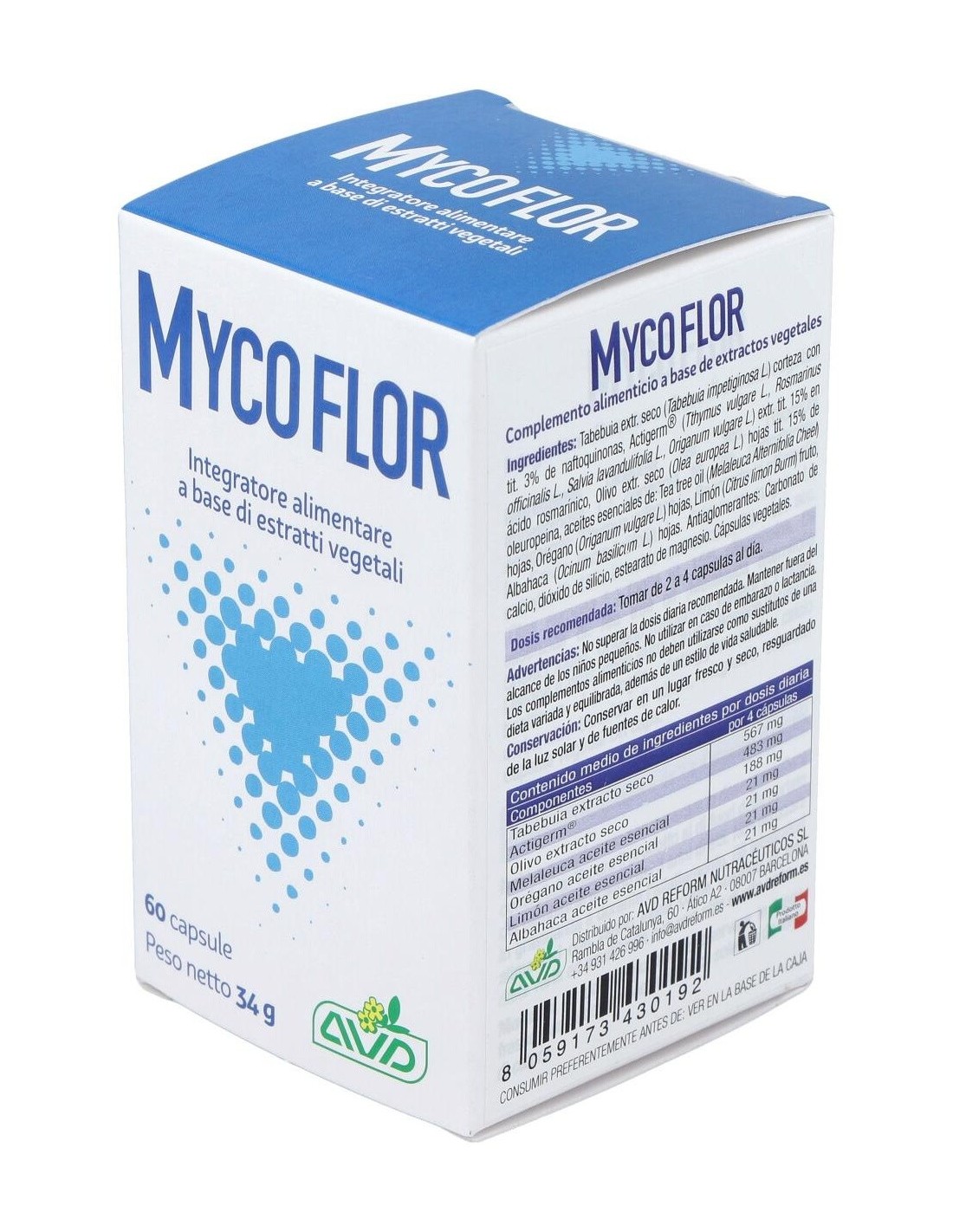 AVD REFORMMycoflor es un complemento alimenticio a base de aceites esenciales y extractos vegetales con acción antibacteriana y antifúngica que actúa favorablem