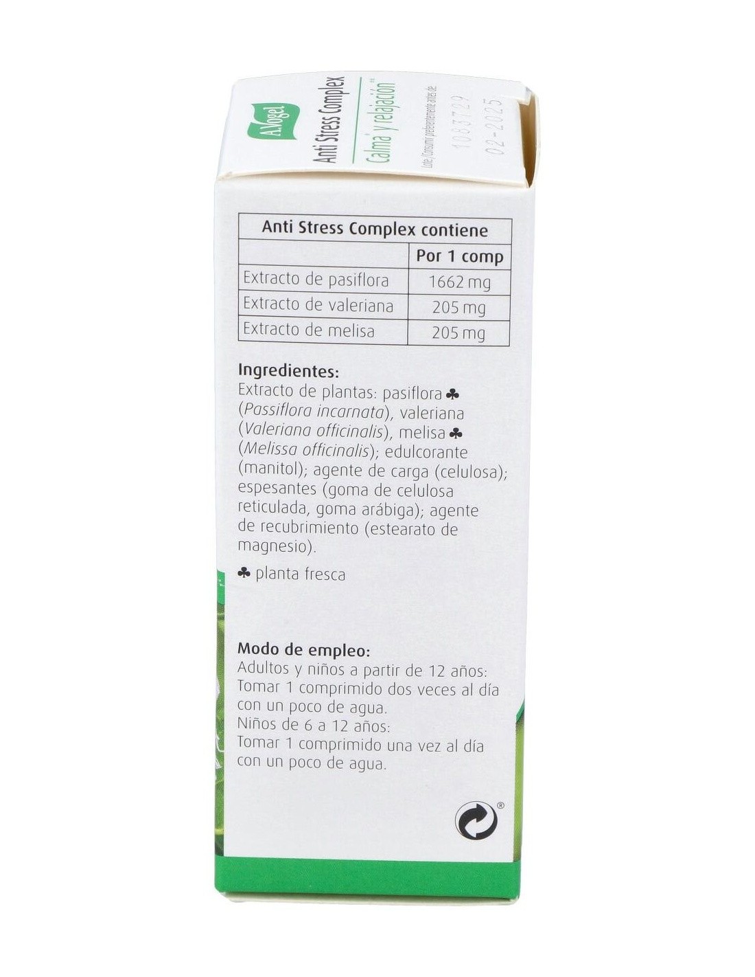 Extracto de plantas: pasiflora (Passiflora incarnata), valeriana (Valeriana officinalis), melisa (Melissa officinalis): edulcorante (manitol): agente de carga (celulosa): espesantes (goma de celulosa reticulada, goma arábiga): agente de recubrimiento (estearato de magnesio), planta fresca.