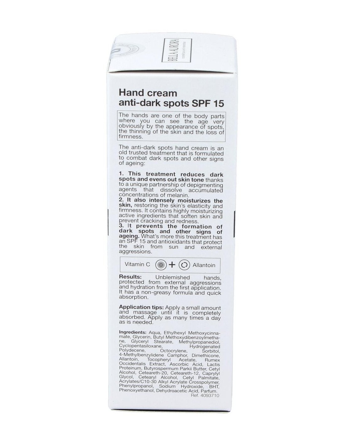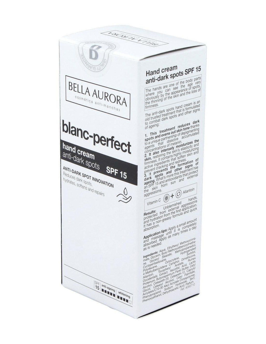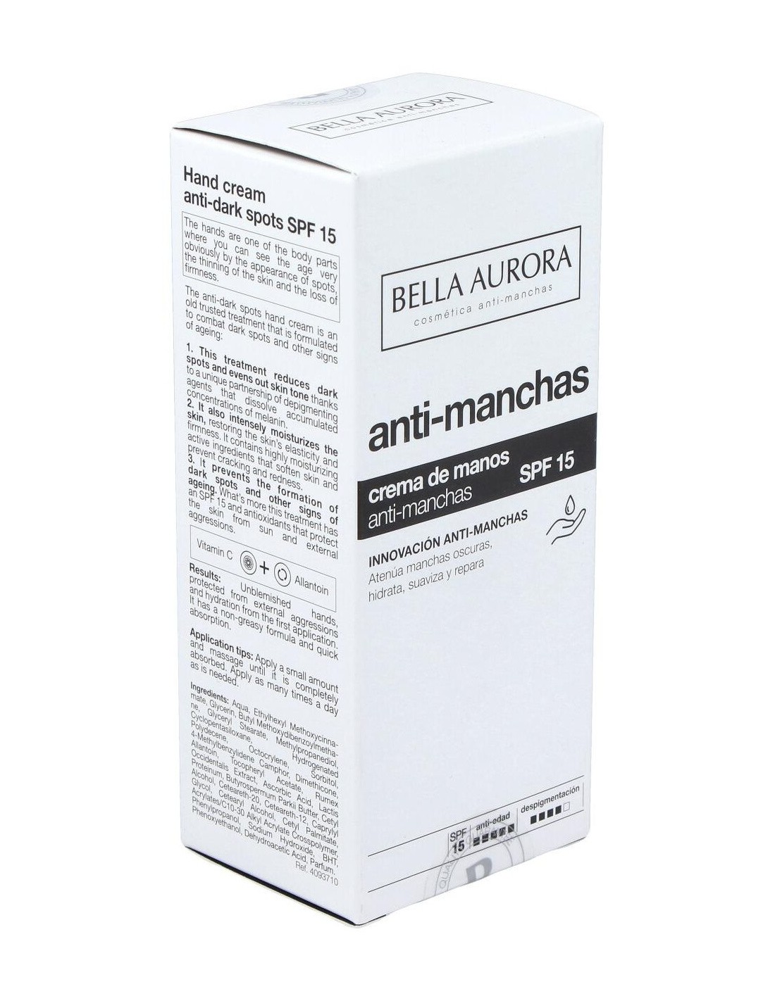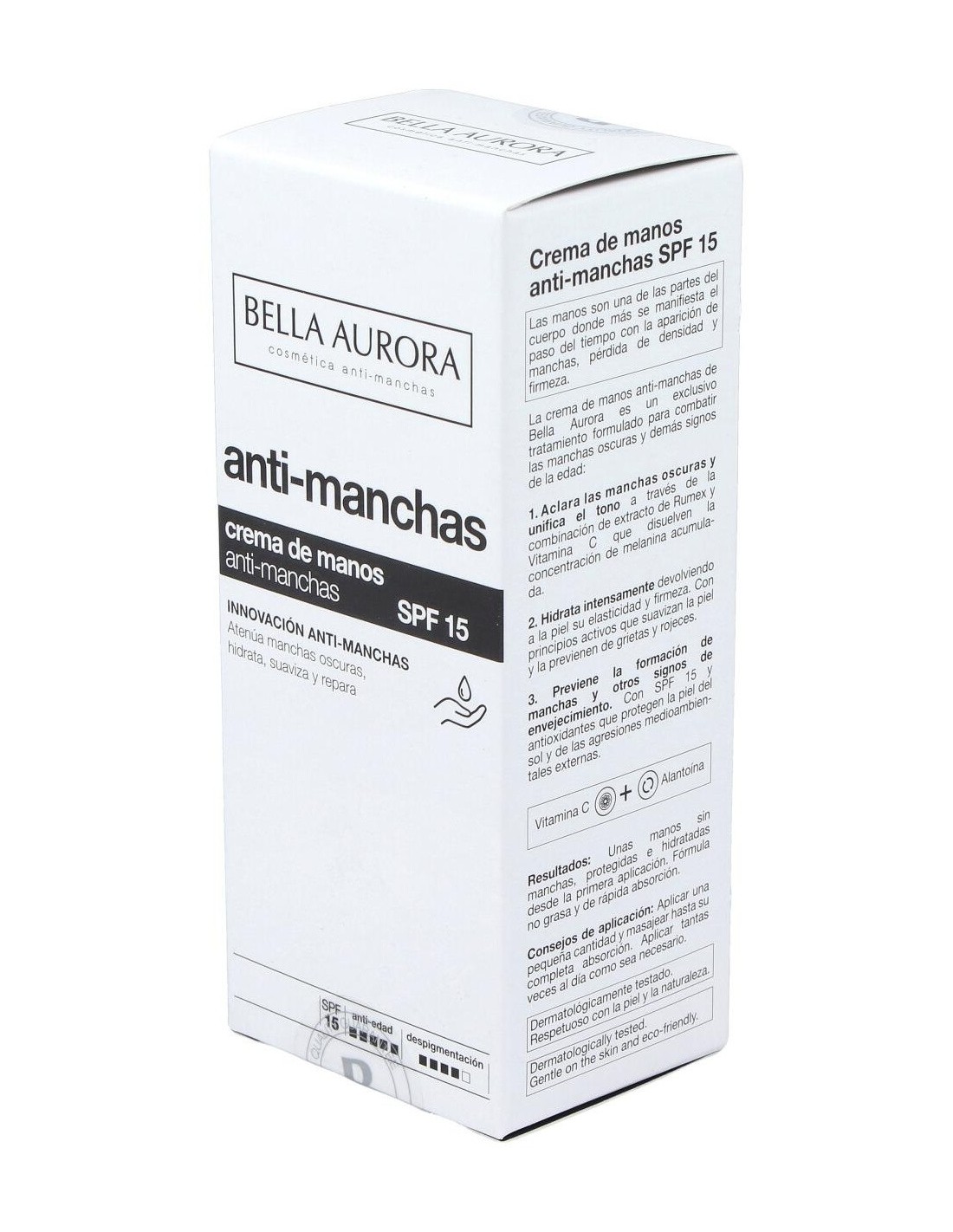 Despigmenta, aclara las manchas y unifica el tono de la piel, gracias a una exclusiva asociación de extracto de rumex, vitamina C y proteínas lácticas. Hidrata intensamente devolviendo a la piel su elasticidad y firmeza. Con principios activos altamente hidratantes que suavizan la piel y la previenen de grietas y rojeces. Previene la formación de manchas y otros signos del envejecimiento. Su factor de protección y anti-radicales libres, protegen la piel del sol y de las agresiones externas. Filtros solares SPF15.