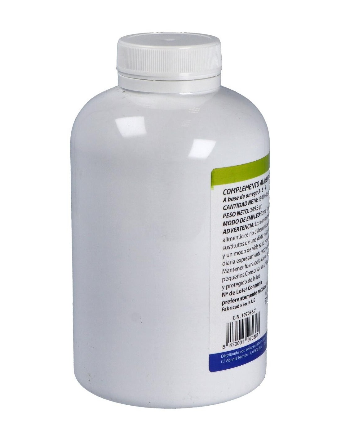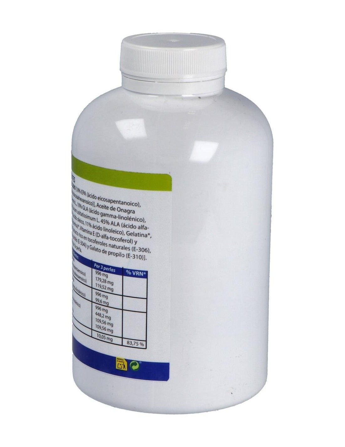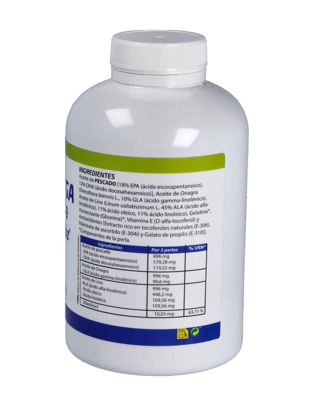 Ingredientes:Aceite de Pescado [18% EPA (ácido eicosapentanoico), 12% DHA (ácido ocosahexanoico)], Aceite de Onagra (Oenothera biennis L., 10% GLA (ácido gamma-linolénico), Aceite de Lino (Linum usitatissimum L. 45% ALA (ácido alfa-linolénico), 11% ácido oleico, 11% ácido linoleico), Gelatina*, Humectante (Glicerina)*, Vitamina E (D-alfa-tocoferol) y Antioxidantes [Extracto rico en tocoferoles naturales (E-306), Palmitato de ascorbilo (E-304i) y Galato de propilo (E-310). (*) Componentes de la perla.Modo de empleo:Tomar 3 perlas al día.Presentación:Envase de 180 perlas.