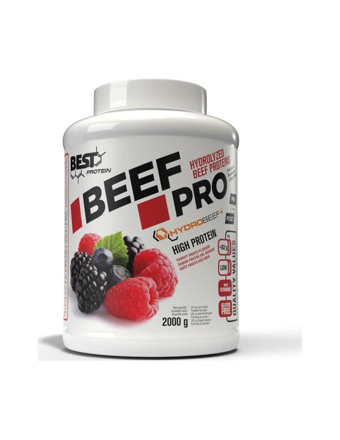 BEST PROTEINComplemento alimenticio de sabor frutos del bosque, a base de proteínas y vitaminas. BEEF PRO aporta hasta un 87% de proteína de origen vacuno de alta cantidad con un perfil óptimo de aminoácidos siendo una proteína de alto valor biológico, alta digestibilidad y rápida absorción. Aporta a los músculos lo necesario para ayudar a mantenerlos y desarrollarlos.
