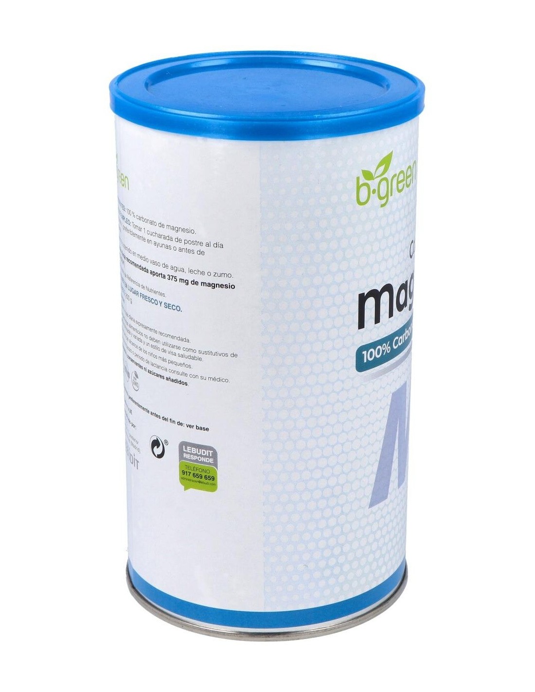 B-green carbonato de magnesio es un complemento alimenticio que ayuda a disminuir el cansancio y la fatiga. Gracias a su formulación reduce el desgaste de los huesos, depurar el organismo, regula la acidez de los alimentos y ayuda a eliminar gases.