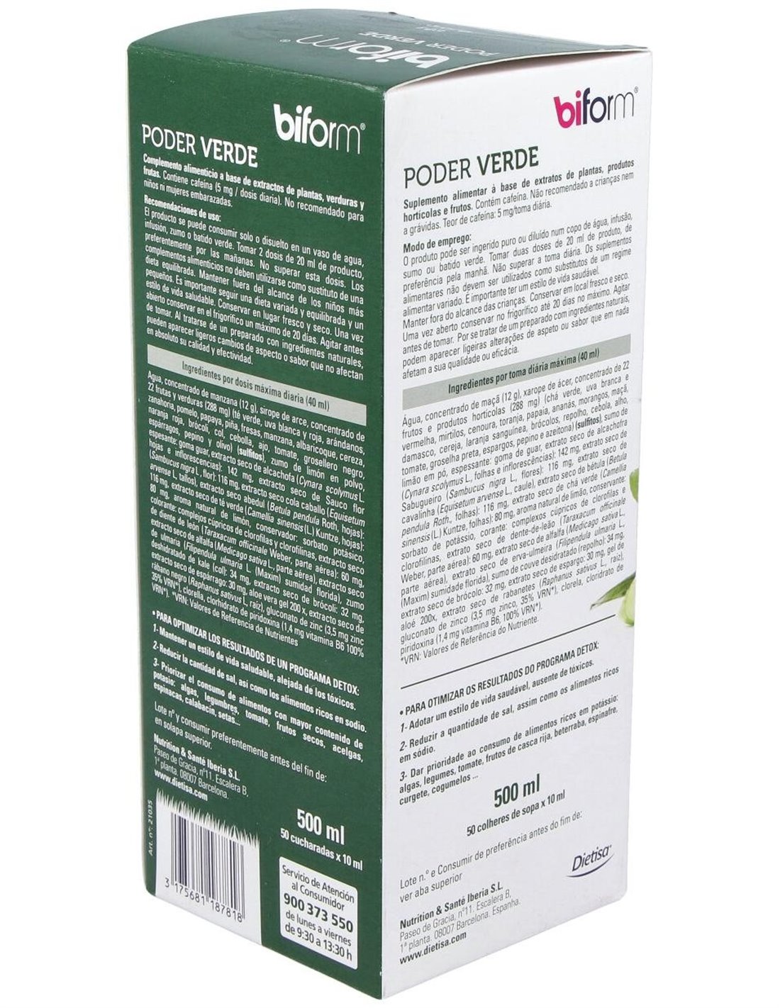 BIFORM®Biform Poder Verde 500ml es un complemento alimenticio que contribuye a adelgazar y eliminar los líquidos retenidos en el cuerpo.Sirve de ayuda en dietas de adelgazamiento y para depurar el organismo, sobre todo para personas que necesitan realizar dietas hipocalóricas.