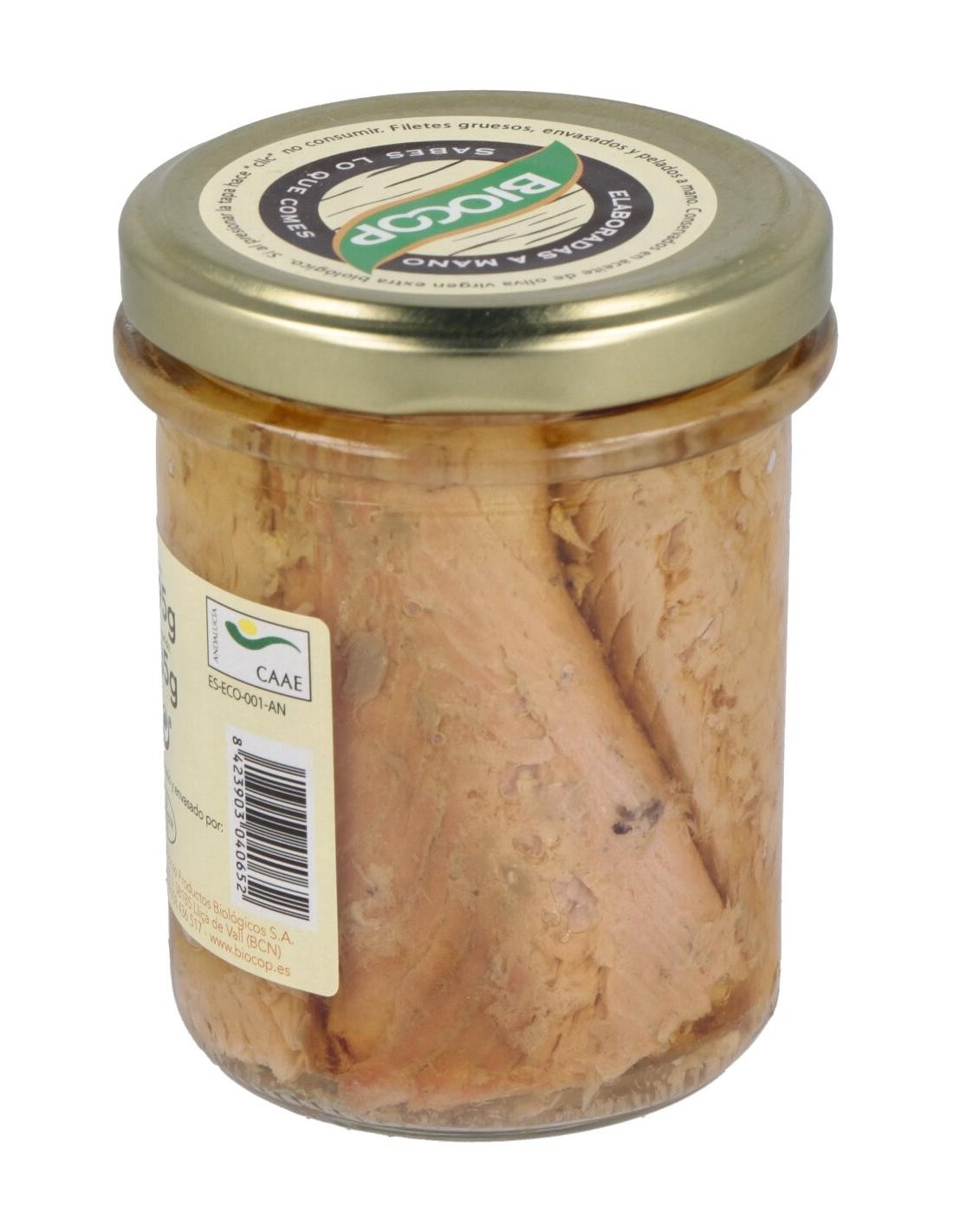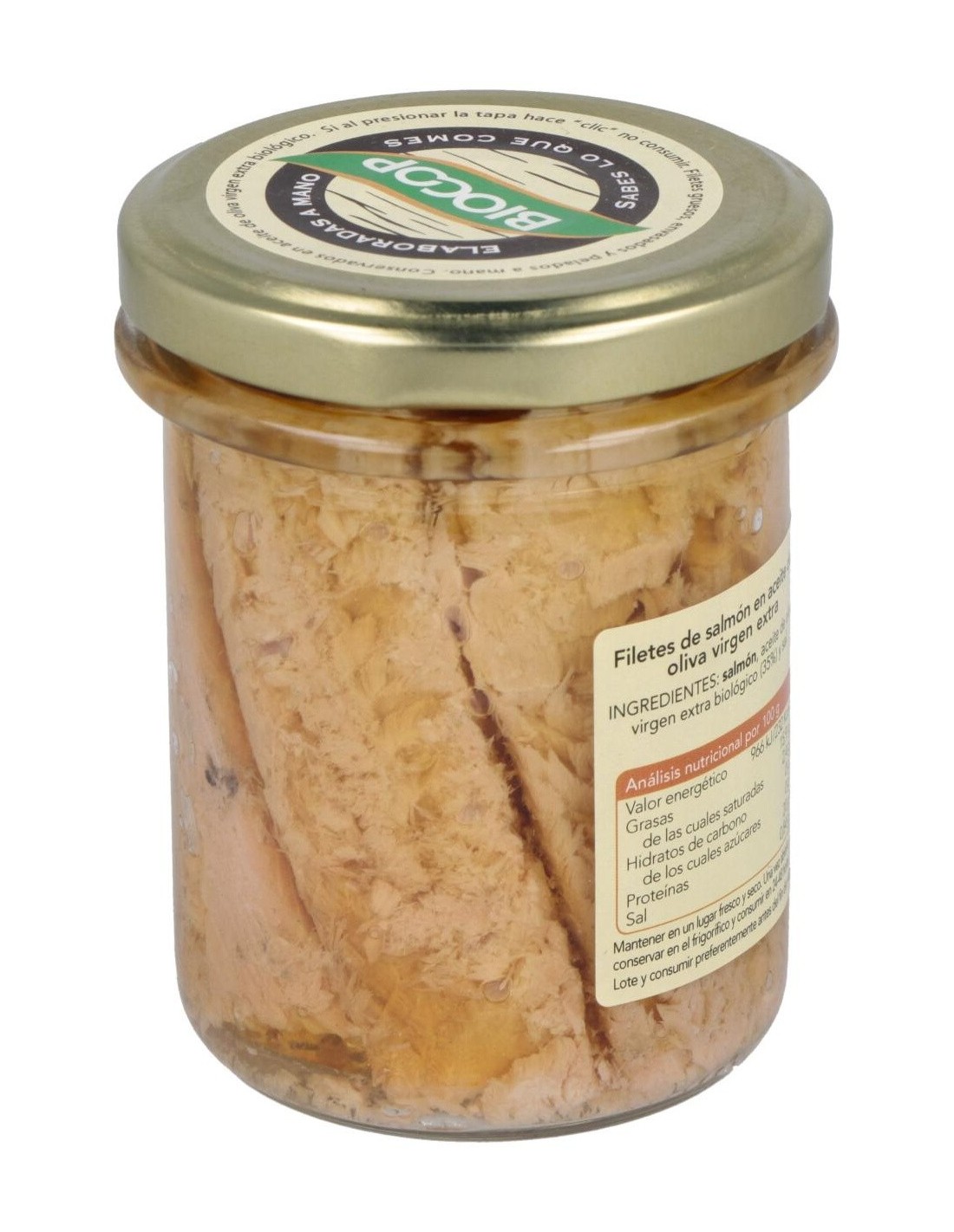 BIOCOPIngredientes:Salmón, aceite de oliva virgen extra*, sal marina. (*) De cultivo ecológico.Valor nutricional por 100 gramos: