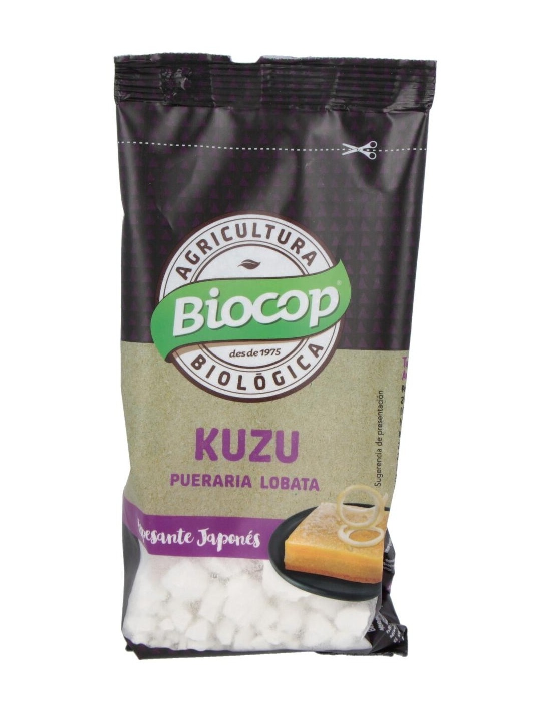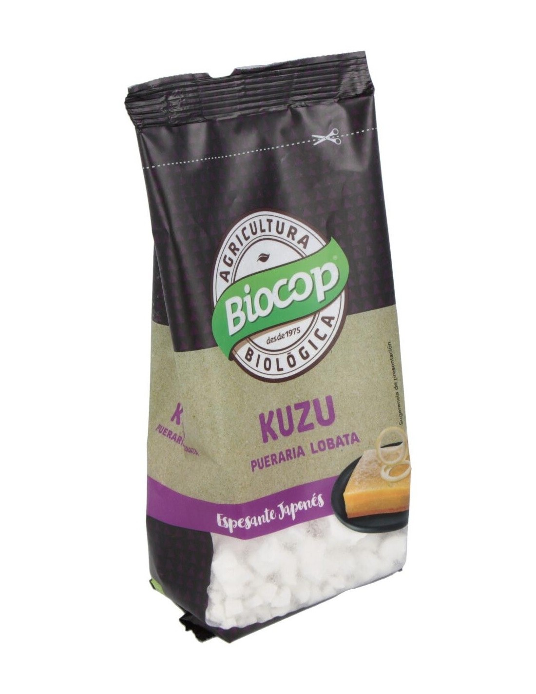 Modo de empleo:Disolver 1-2 cucharadas de postre de kuzu por taza de líquido frío. Añadirlo a sopas, cremas o natillas y cocinar a fuego suave hasta que se vuelva translúcido. Agitar lentamente y de forma constante.Presentación:Envase de 100 gramos.Recomendaciones y advertencias:Puede contener trazas de altramuces, cacahuetes, frutos secos con cáscara, gluten, sésamo, soja y derivados.