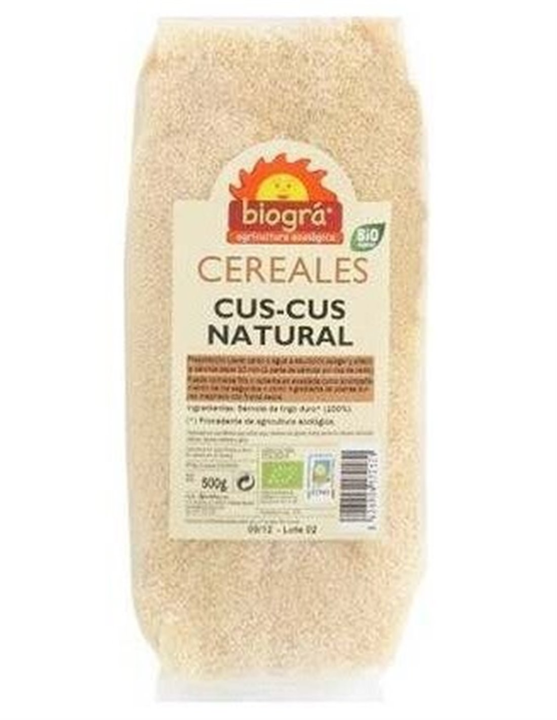 Cereal de cuscús natural, desarrollado por Biográ para otorgar un alimento saludable y orgánico. Emplea la sémola de trigo como materia prima, la cual procede de cultivo ecológico, donde no se usan químicos o insecticidas. Está empaquetado y elaborado en una fábrica que maneja otros productos. Puede llegar a contener derivados lácteos, huevo, soja, gluten, sésamo, apio y frutos secos. Envasado en un empaque de plástico biodegradable transparente. Ayuda a conseguir nutrientes y proteína en un régimen alimenticio. Aporta calorías, hidratos de carbono con lenta digestión, fibra alimenticia y proteína vegetal. Recomendado para preparaciones árabes y dietas veganas o vegetarianas. Almacenar en un sitio fresco y seco, lejos de la humedad y la luz solar. Evitar su consumo si se padece de alergia a la sémola de trigo o alguno de los ingredientes que se manejan en la fábrica.