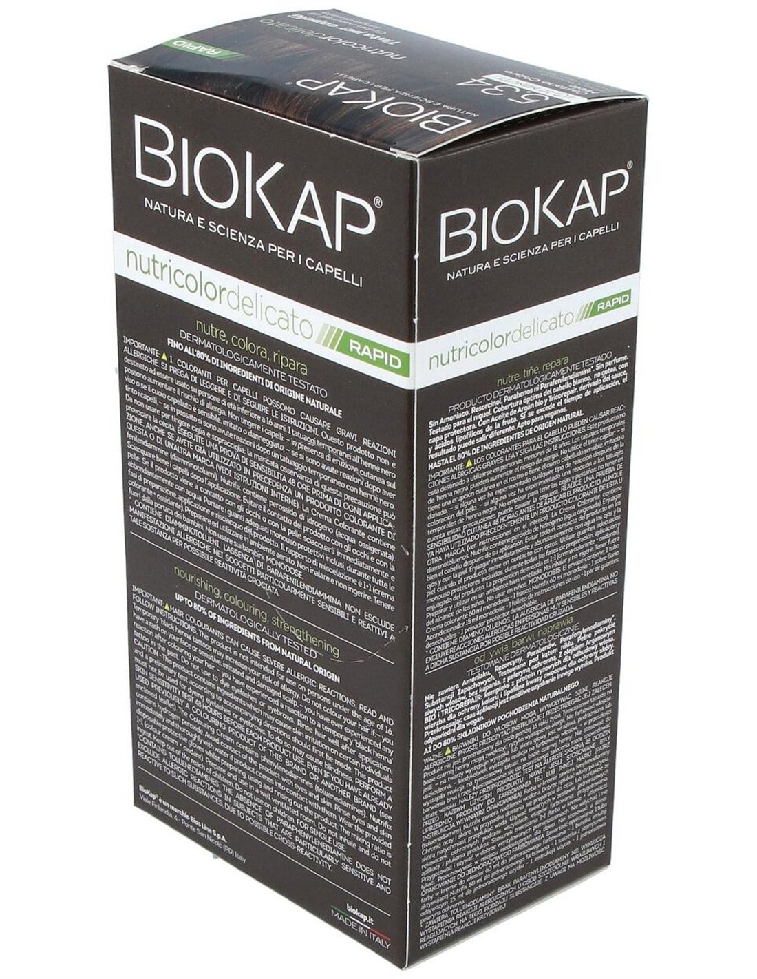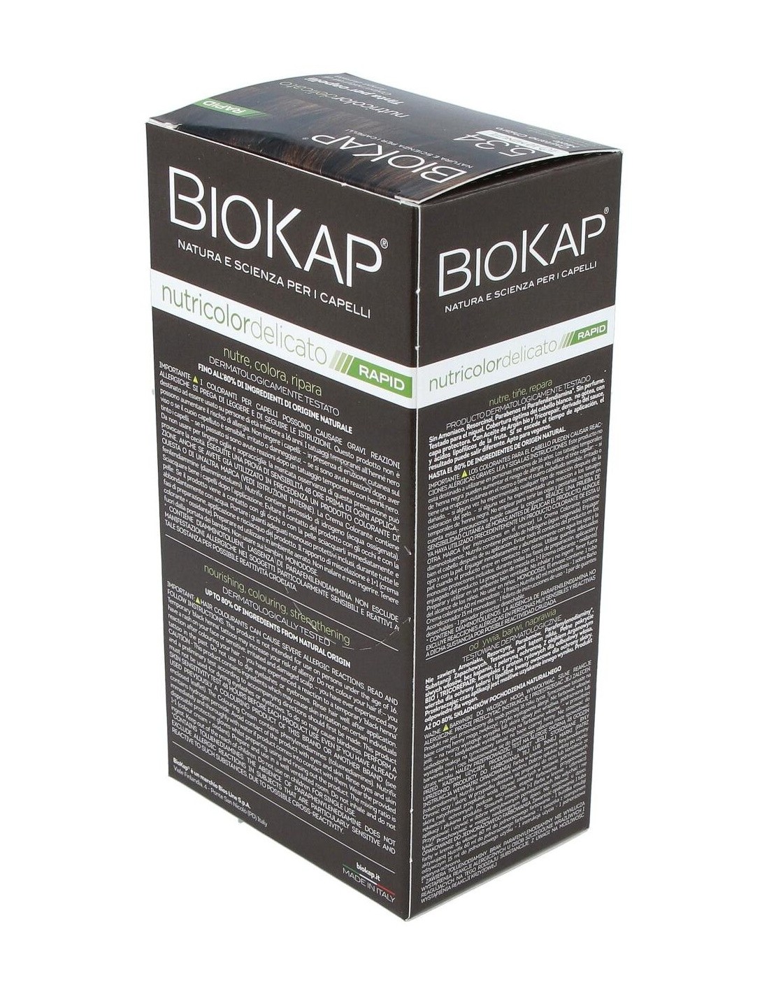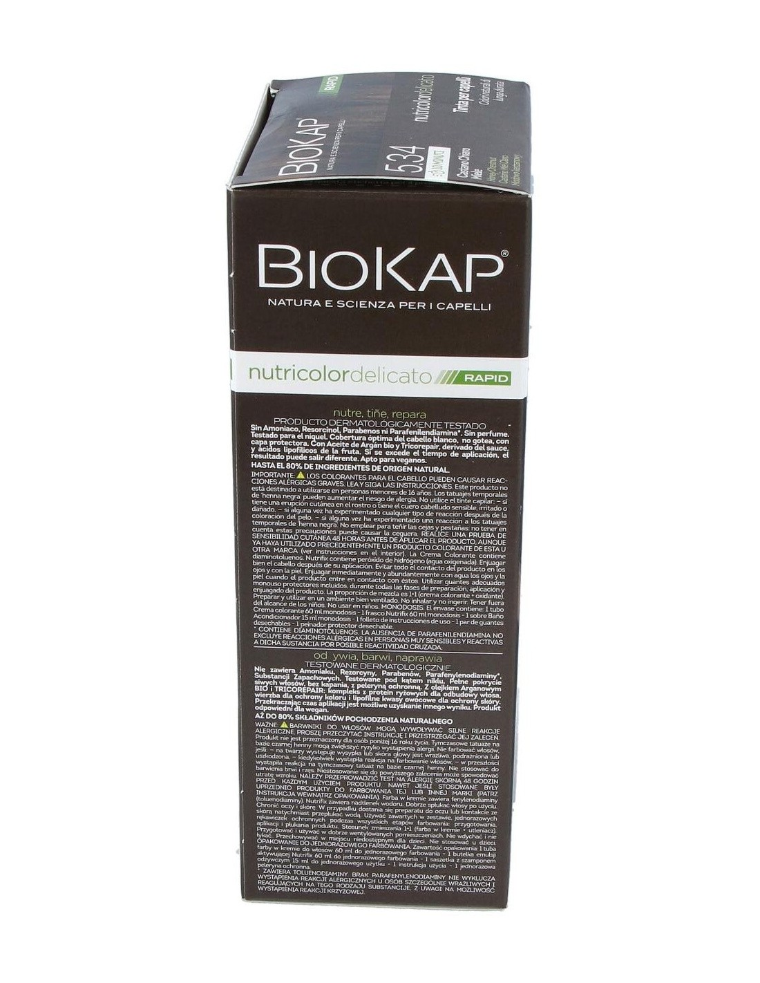 BIOKAPEl Rapid delicato 5,34 Castaño Miel de Biokap es un tinte capilar para quienes buscan un color castaño miel natural, formulado con ingredientes que cuidan el cabello durante el proceso de coloración.