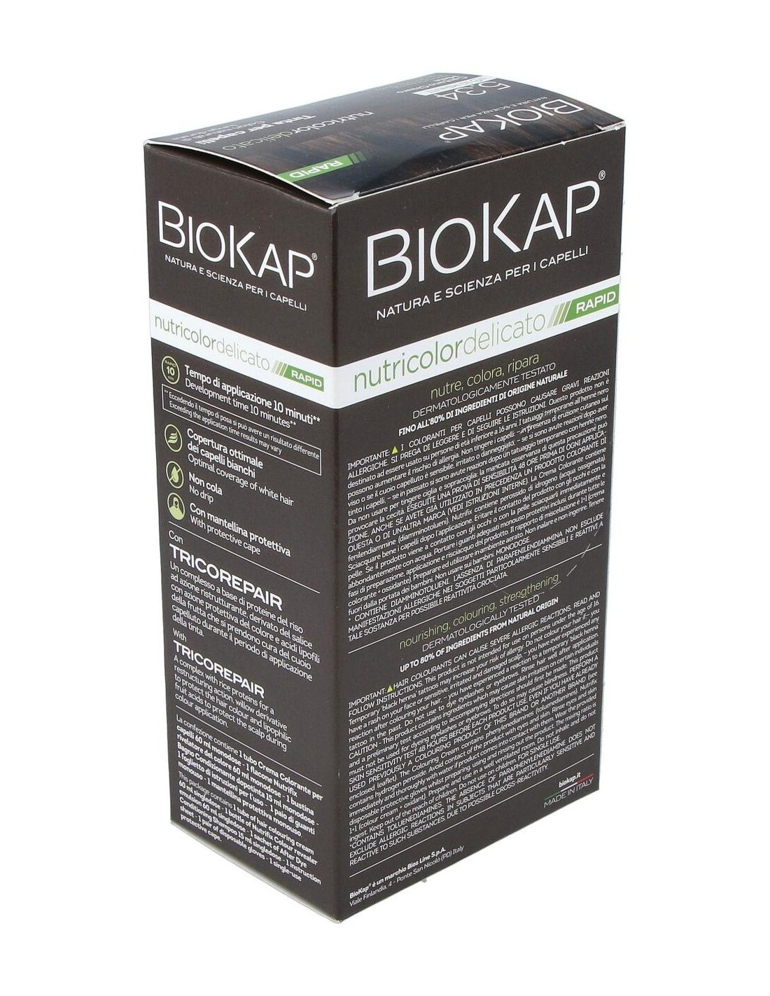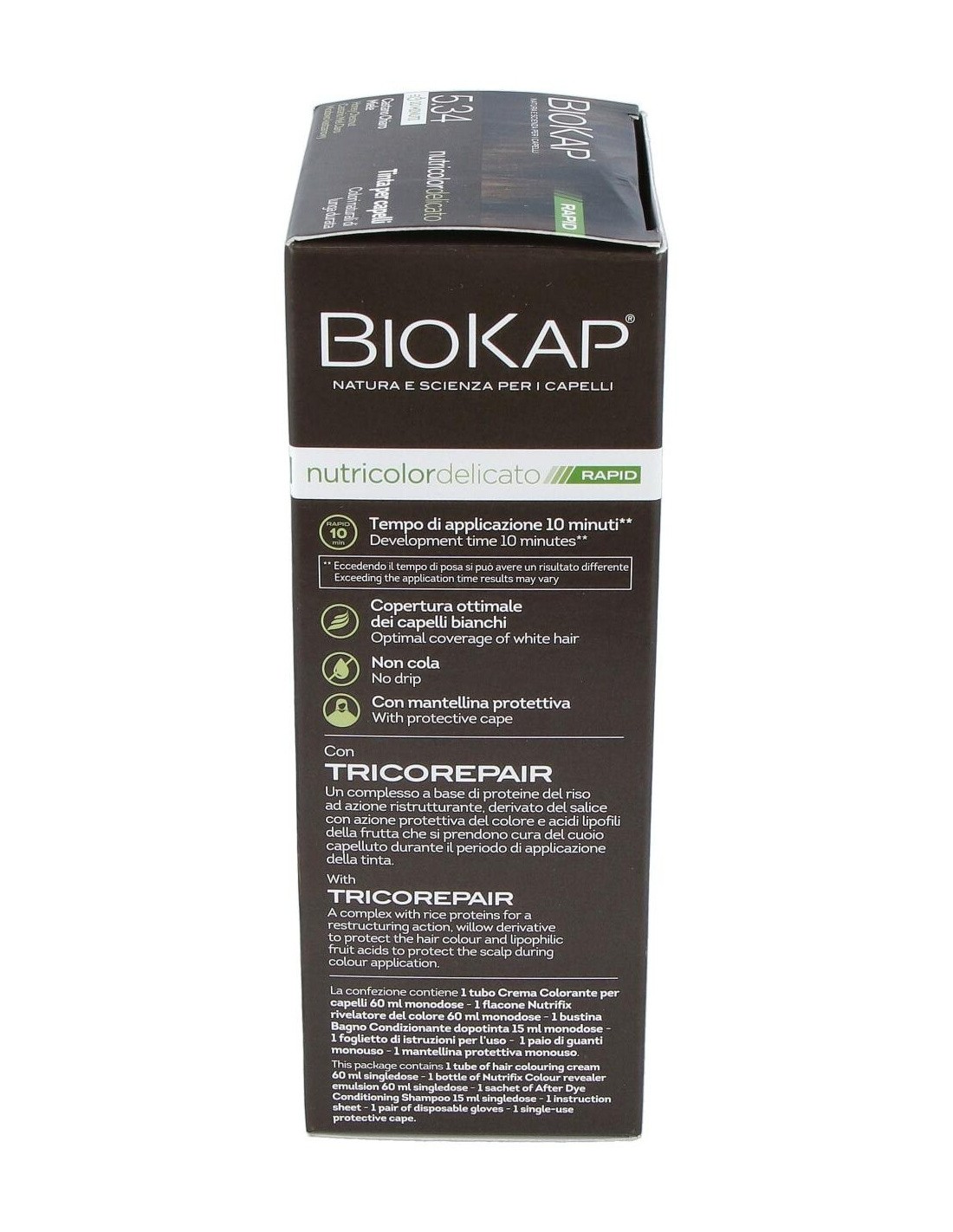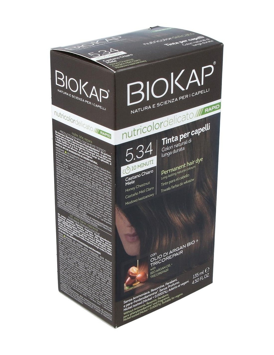 BIOKAPEl Rapid delicato 5,34 Castaño Miel de Biokap es un tinte capilar para quienes buscan un color castaño miel natural, formulado con ingredientes que cuidan el cabello durante el proceso de coloración.