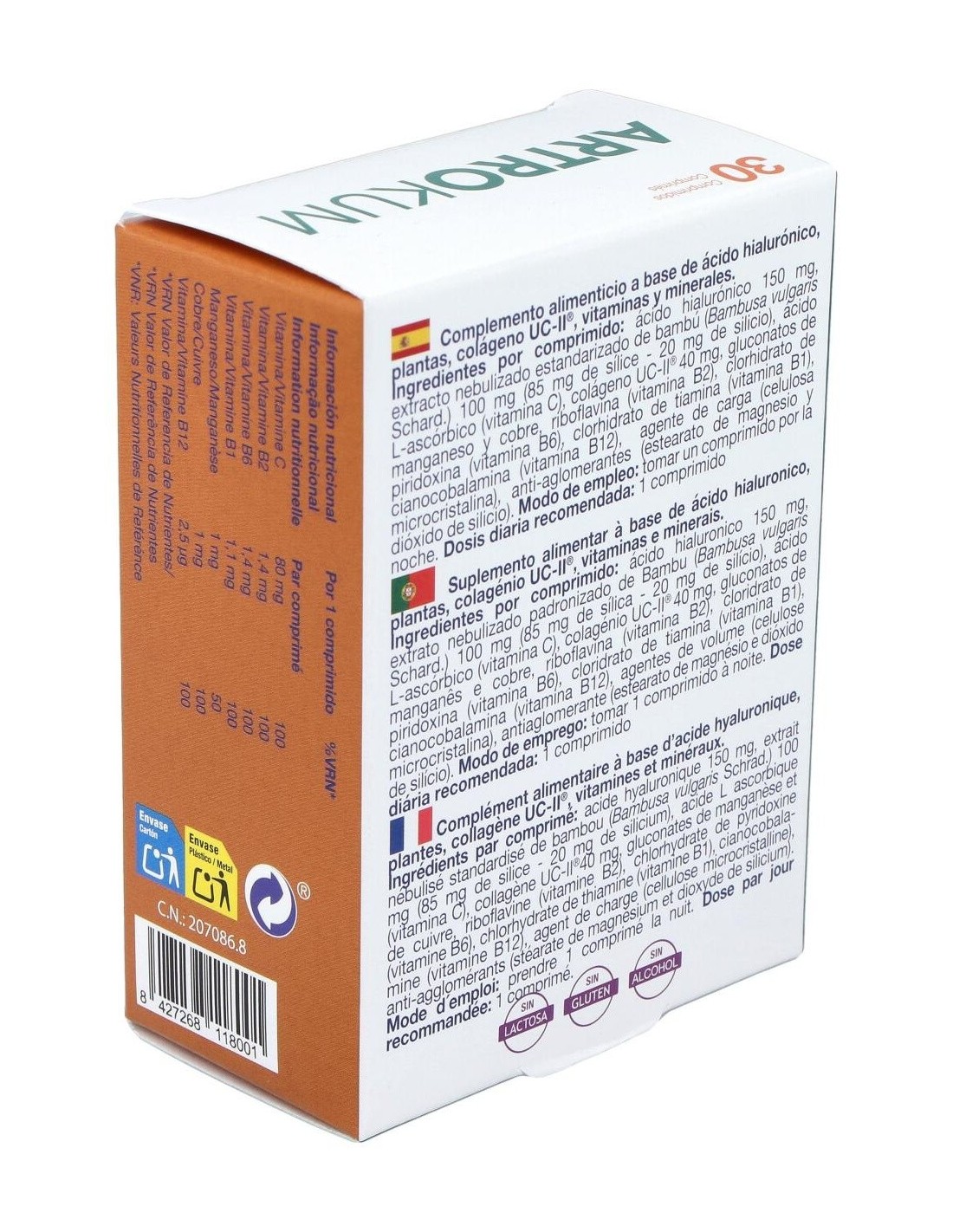 Ácido hialurónico 150 mg, extracto nebulizado estandarizado de bambú (Bambusa vulgaris Schard.) 100 mg (85 mg de sílice, 20 mg de silicio), ácido L- ascórbico (vitamina C), colágeno UCII® 40 mg, gluconatos de manganeso y cobre, riboflavina (vitamina B2), clorhidrato de piridoxina (vitamina B6), clorhidrato de tiamina (vitamina B1), agente de carga (celulosa microcristalina), antiaglomerantes (estearato de magnesio y dióxido de silicio).