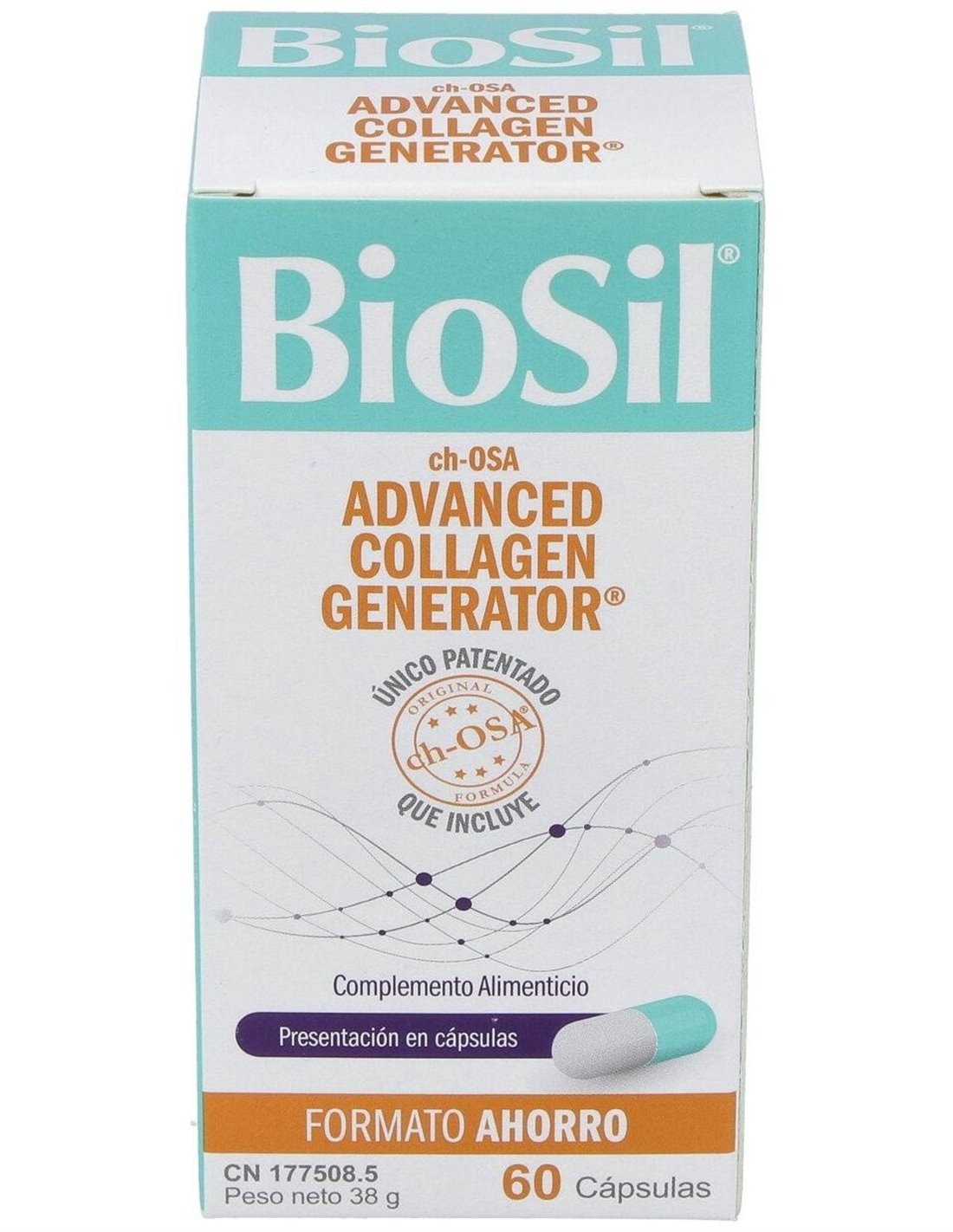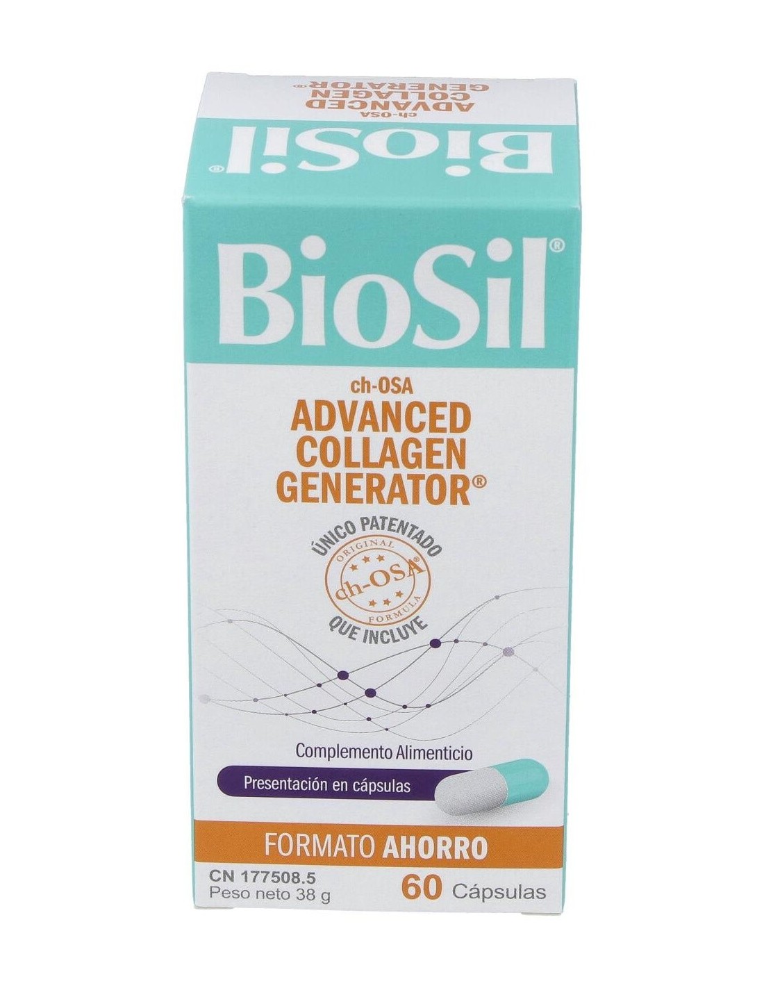 BIOSILBIOSIL | BioSil 60cápsEl colágeno es una proteína que genera fibras muy resistentes y flexibles, las cuales forman parte de muchos tejidos de nuestro cuerpo: articulaciones, huesos, piel, músculos y tendones.Nuestro organismo produce colágeno, pero a partir de los 30 años pierde capacidad para generar esta proteína, por lo que las zonas que contienen colágeno empezarán a envejecer y se puede perder movilidad en las articulaciones o tersura en la piel.