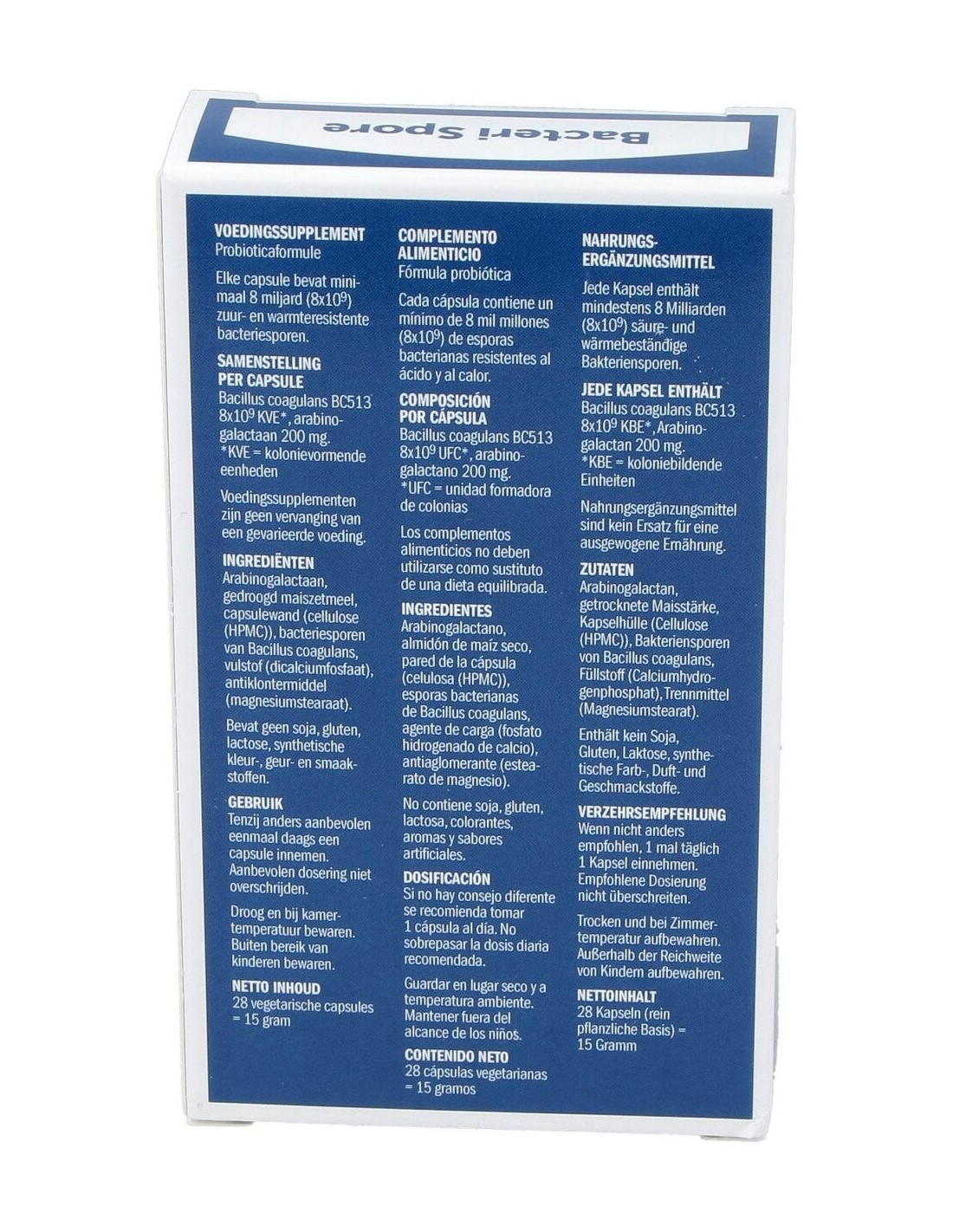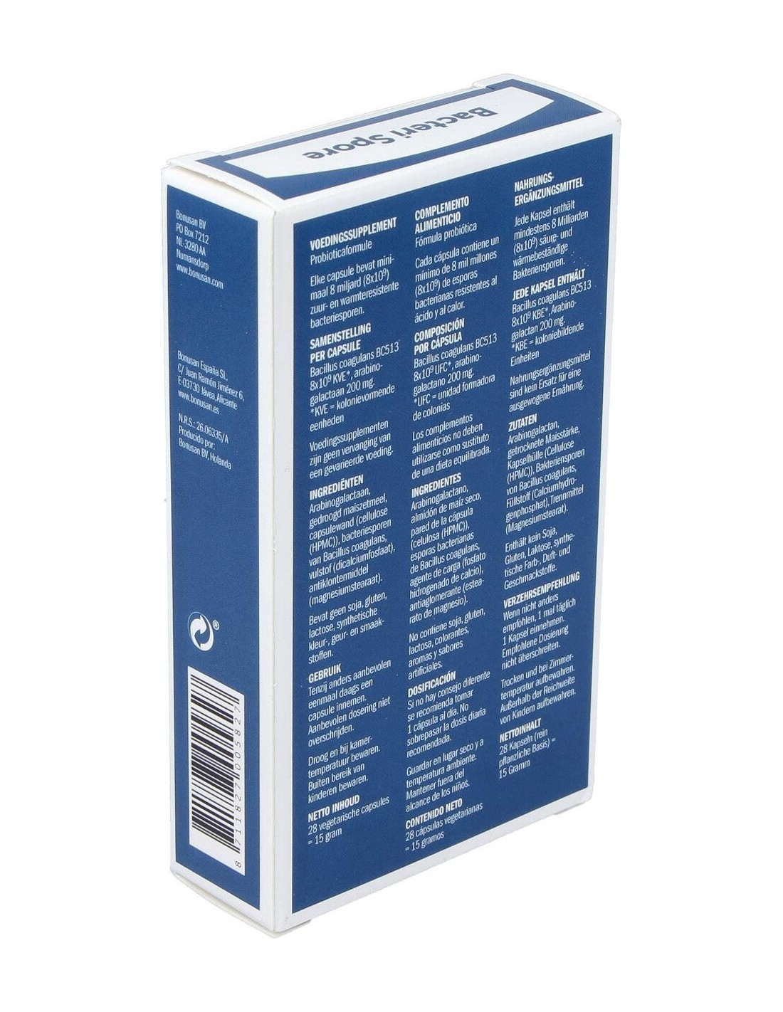 Las cápsulas de Bacteri Spore de Bonusan vienen bien en todo tipo de situaciones. Por ejemplo, al comer fuera de casa o de viaje, cuando no sepamos cómo vamos a reaccionar ante nuevos alimentos. Gracias a su capacidad de formar esporas, las bacterias tienen una vida útil extra larga y, tras ingerirlas, resisten a los ácidos gástricos y a la bilis. Esto garantiza que lleguen al intestino sin daños.¿Por qué bacterias que forman esporas?La característica distintiva de la cepa Bacillus coagulans es que la bacteria puede formar esporas. Pero, ¿por qué utilizar esporas bacterianas? Las esporas bacterianas son resistentes a las influencias ambientales desfavorables, como el ácido estomacal y la bilis. Debido a este mecanismo especial de protección, su viabilidad es alta y las esporas germinan al llegar a su destino en cuanto las condiciones son más favorables, como es el caso del intestino. Gracias a la formación de esporas, las bacterias también están mejor protegidas contra la sequía y el calor, lo que alarga su vida útil.El Bacillus coagulans, formador de esporas, fue inicialmente clasificado también en el grupo de los Lactobacillus (Lactobacillus esporógenos ). Hoy sabemos que esta cepa de bacterias pertenece a la especie Bacillus. Se trata de una bacteria formadora de ácido láctico, por lo que también se la denomina «bacteria formadora de esporas de ácido láctico».¿Por qué son útiles las bacterias? Las bacterias no siempre tienen buena fama, ya que pueden provocar muchas enfermedades desagradables. A estas bacterias que causan enfermedades también se las llama bacterias patógenas. Pero no todas las bacterias son patógenas y causan enfermedades; también existen bacterias que son útiles y beneficiosas. Las barreras naturales de nuestro cuerpo, como el intestino, albergan todo tipo de bacterias diferentes. Lo importante es mantener un buen equilibrio entre las distintas cepas bacterianas.Las ventajas de Bacteri Spore de BonusanLas cápsulas de Bacteri Spore contienen cada una 8.000 millones de bacterias productoras de ácido láctico y formadoras de esporas de la cepa Bacillus coagulans. Esto les permite sobrevivir incluso en un entorno extremo como el ácido del estómago y llegar intactas al intestino. Además de la potente cepa de bacterias, la Bacteri Spore contiene 200 mg de la fibra dietética fermentable arabinogalactan. Esta fibra dietética procede del alerce.Las cápsulas de Bacteri Spore no contienen sabores ni edulcorantes. Las cápsulas están envasadas en un blíster fácil de llevar y están concebidas para el uso diario. Las cápsulas pueden almacenarse a temperatura ambiente sin que ello afecte negativamente a la calidad y viabilidad de las bacterias. Esto hace que Bacteri Spore sea un producto interesante para viajar, entre otras cosas.Bacteri Spore de Bonusan también puede utilizarse como enjuague bucal. Para ello, abra la cápsula y disuelva el contenido en agua, tras lo cual el enjuague bucal estará listo. Cuanto más tiempo permanezca la solución bacteriana en contacto con la boca, mejor.Alta calidad gracias a una cepa bacteriana muy robustaHay muchas maneras de llevar las bacterias a su destino. Las cápsulas Bacteri Spore contienen 8000 millones de bacterias de la cepa Bacillus coagulans. Esta bacteria es formadora de esporas. ¿Qué es una bacteria formadora de esporas? Se trata de un tipo especial de cepa bacteriana que se encapsula, por así decirlo, y es capaz de sobrevivir en condiciones extremas y adversas. Aunque el nombre sugiera lo contrario, una espora no es una semilla o descendencia de un organismo. Una espora está formada por una capa de queratina (que también se encuentra en el pelo y las uñas) que la protege del mundo exterior. En el núcleo de la espora hay orgánulos y partes celulares que están inactivos. Sin embargo, una vez que la espora llega al intestino, el entorno es tan favorable para este microorganismo que la bacteria germina y se vuelve de nuevo activa.Adecuado para complementar bacterias productoras de ácido lácticoGracias a su cepa de bacterias formadoras de esporas, Bacteri Spore de Bonusan es un valioso suplemento a base de bacterias intestinales que puede utilizarse en cualquier lugar con diversas aplicaciones. Gracias a la función protectora de las esporas, las bacterias sólo se activan en el intestino.Añadiendo el contenido de las cápsulas a agua se crea un eficaz enjuague bucal. Cuando tome un suplemento Bacteri, asegúrese de que no lo toma simultáneamente, sino al menos 2 horas después de un medicamento destinado específicamente a eliminar bacterias, como un antibiótico.Bacteri Spore de Bonusan es adecuado para: