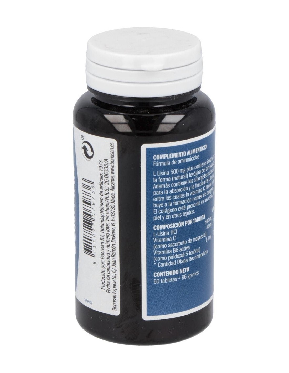 Complemento alimenticio que ayuda en el buen funcionamiento del organismo gracias a las vitaminas y minerales como L-Lisina Plus. Bonusan elabora L-Lisina Plus de forma que su absorción sea mejor para que su efecto sea mayor. L-Lisina de Bonusan es un aminoácido esencial, especialmente para profesionales del deporte y vegetarianos. L-Lisina es una sustancia importante para la producción de colágeno. Los vasos sanguíneos, la piel y otros tejidos contienen colágeno. Elaborado con L-Lisina-HCI, vitamina C (como ascorbato de magnesio), vitamina B6 (piridoxina HCl), magnesio (como ascorbato).