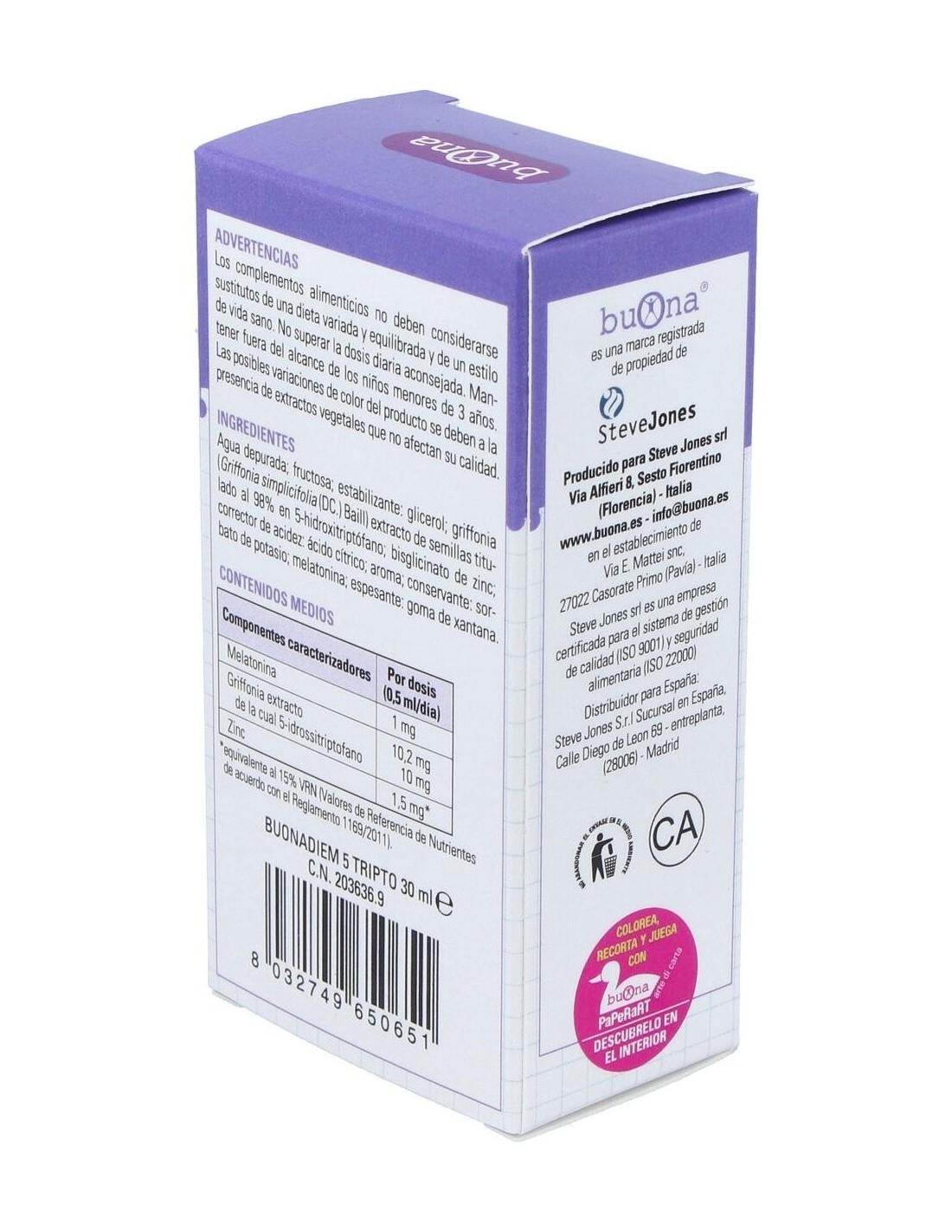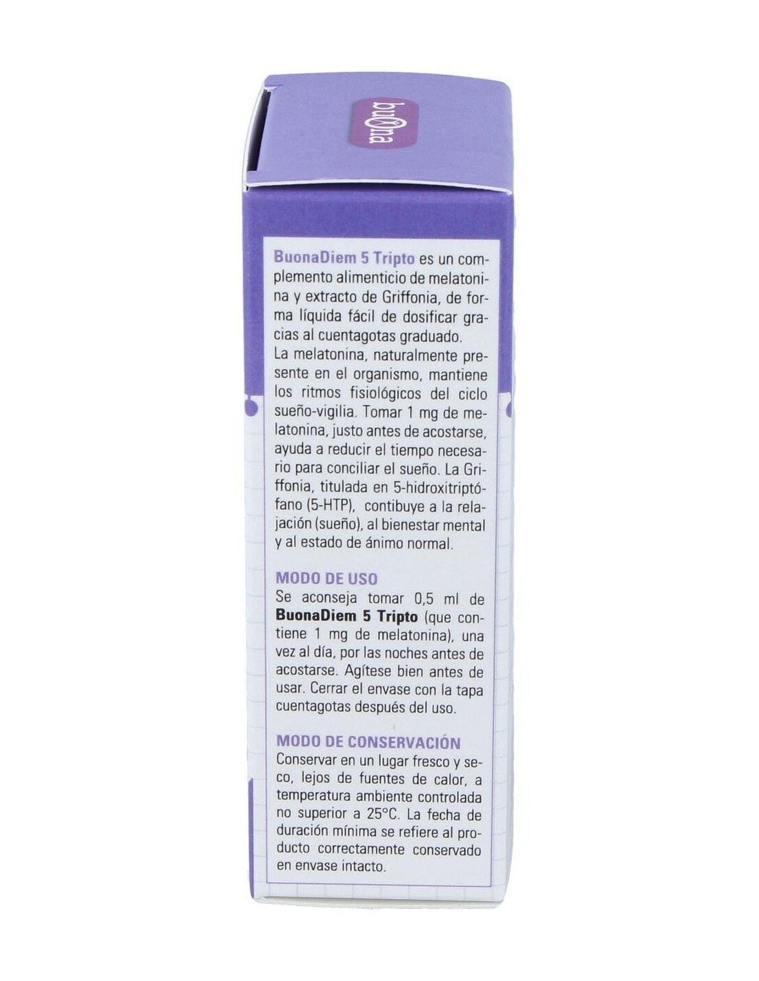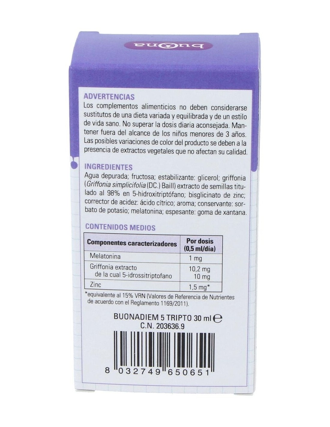BUONAEl Buonadiem 5 Tripto 30Ml. de Buona es un suplemento diseñado para personas que buscan apoyo en la regulación del estado de ánimo, formulado con triptófano para contribuir al bienestar emocional.