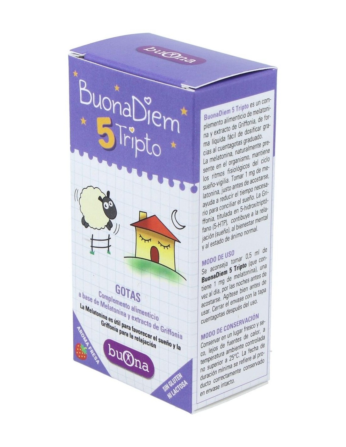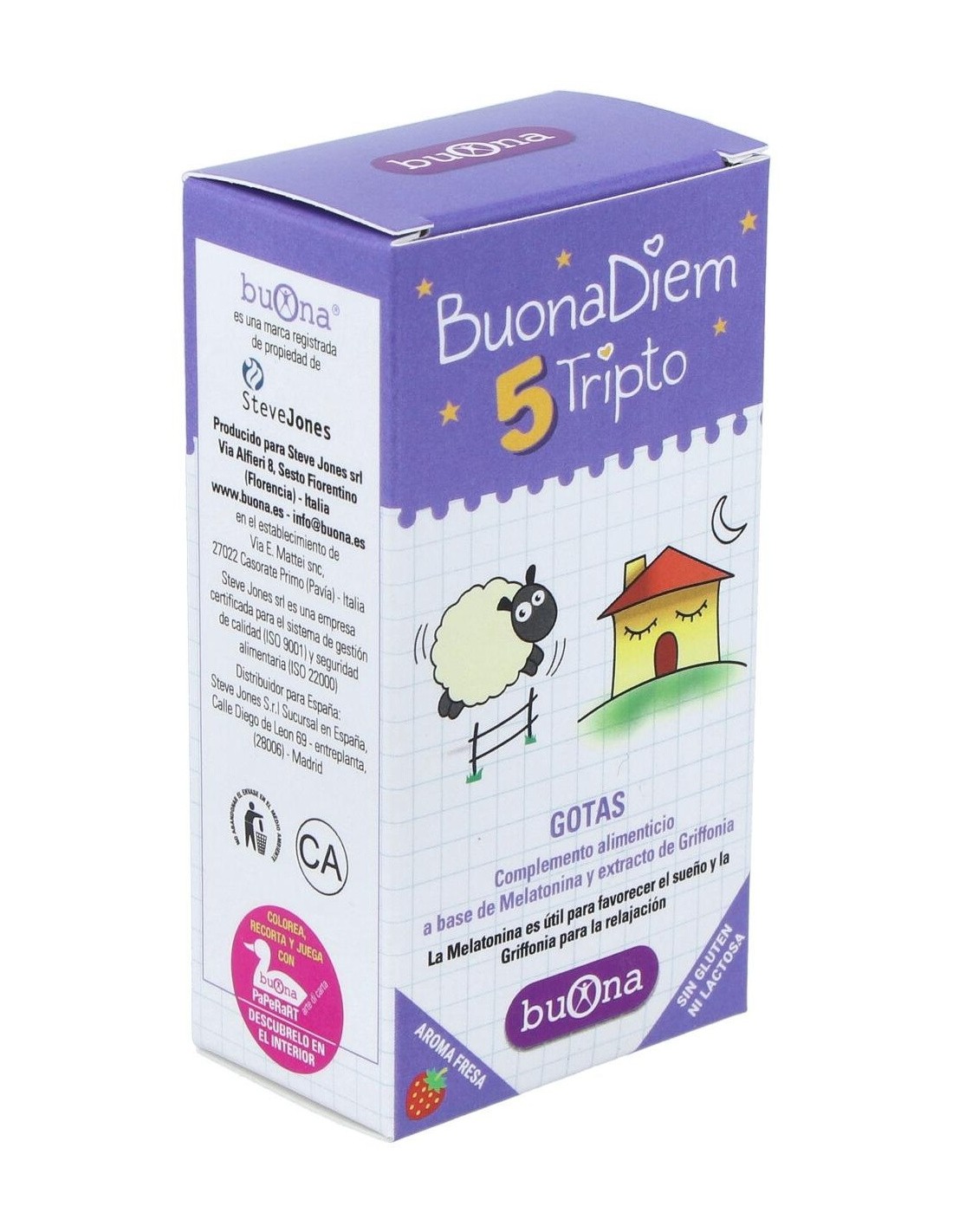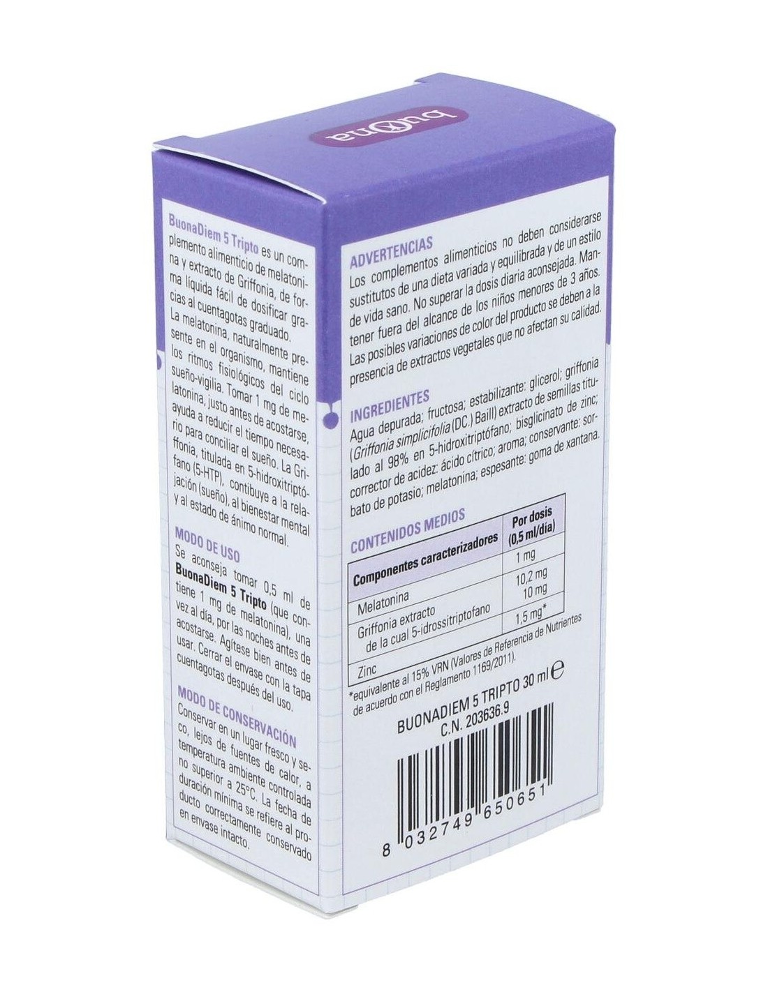 BUONAEl Buonadiem 5 Tripto 30Ml. de Buona es un suplemento diseñado para personas que buscan apoyo en la regulación del estado de ánimo, formulado con triptófano para contribuir al bienestar emocional.
