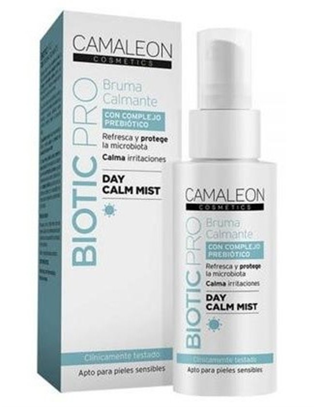 CAMALEONBruma calmante en spray con complejo prebiótico que, aplicada sobre el rostro durante el día, alivia el malestar y la sequedad mientras refresca y protege la barrera cutánea frente a la deshidratación y las irritaciones. Producto vegano.