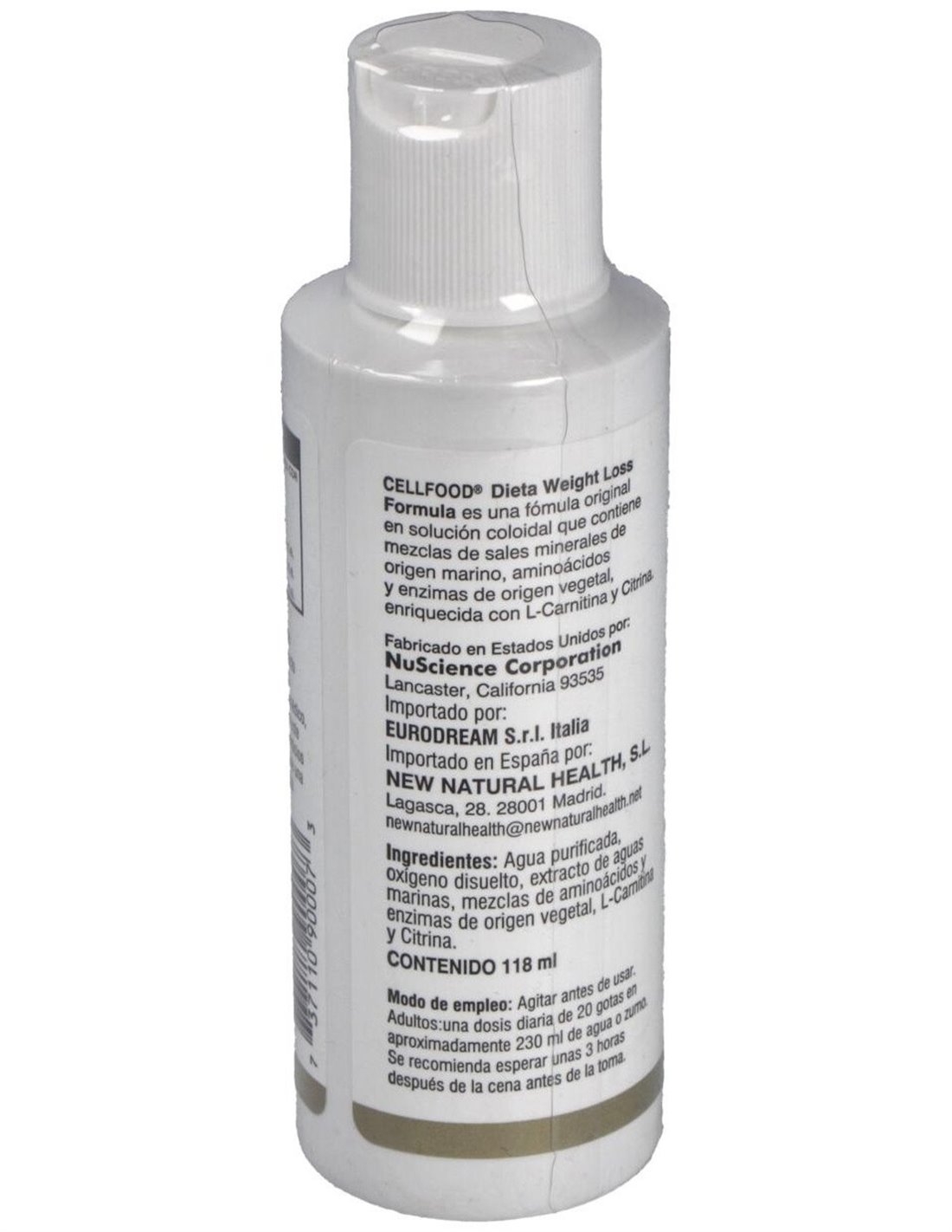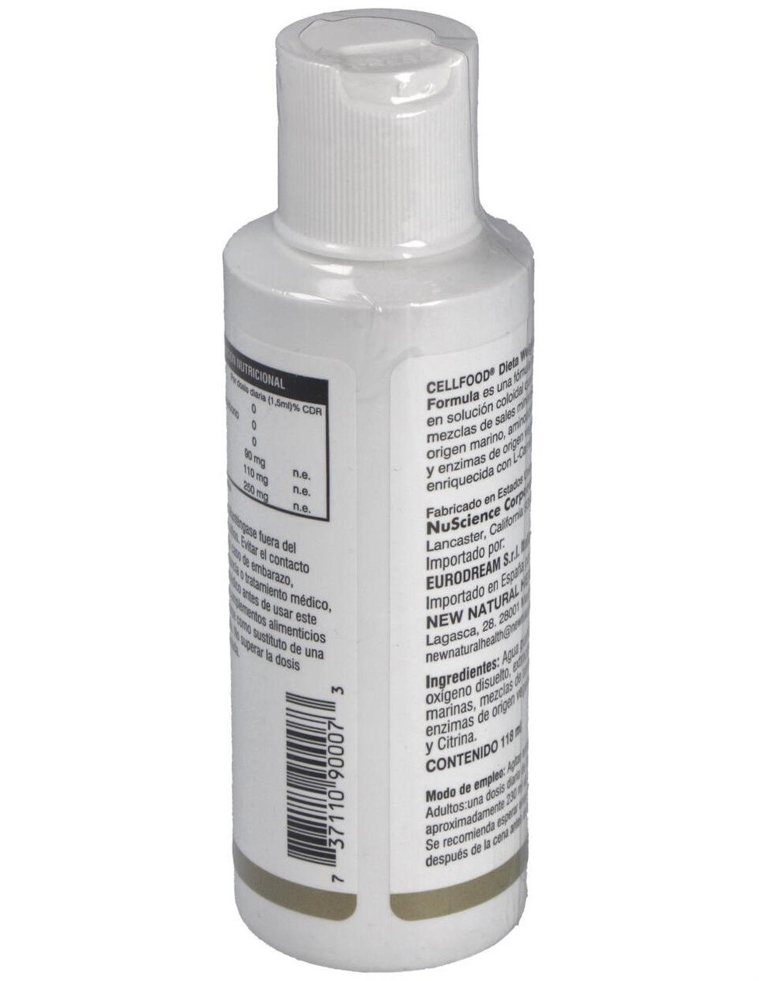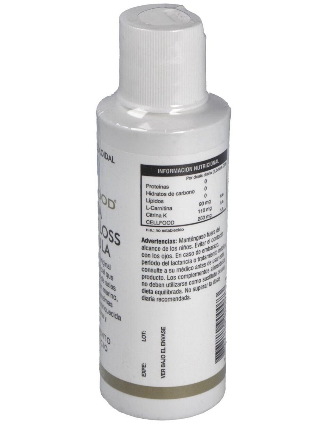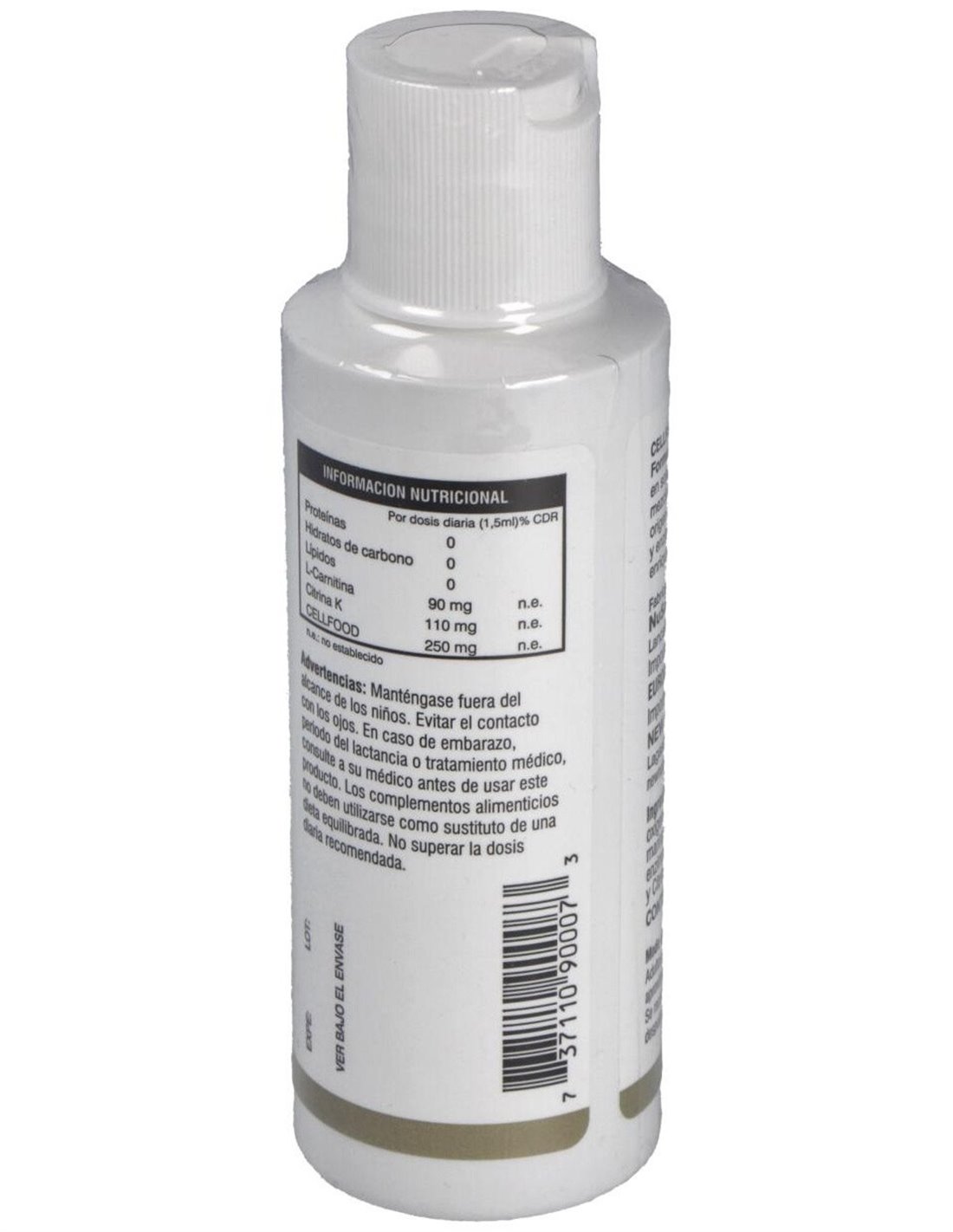 Por 20 gotas: Agua CellFood. L-Carnitina .... 90 mg. Citrin-K ........ 110 mg.