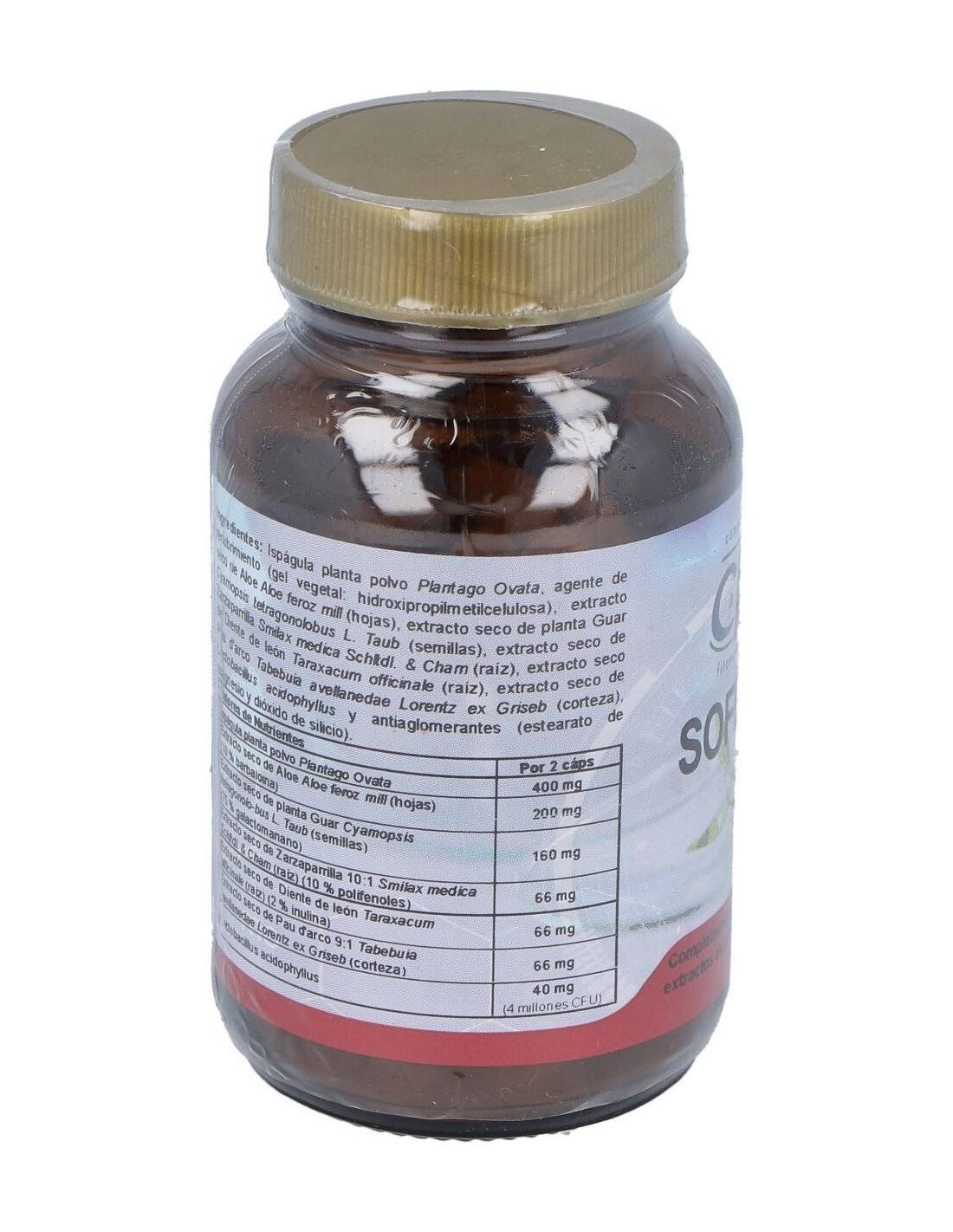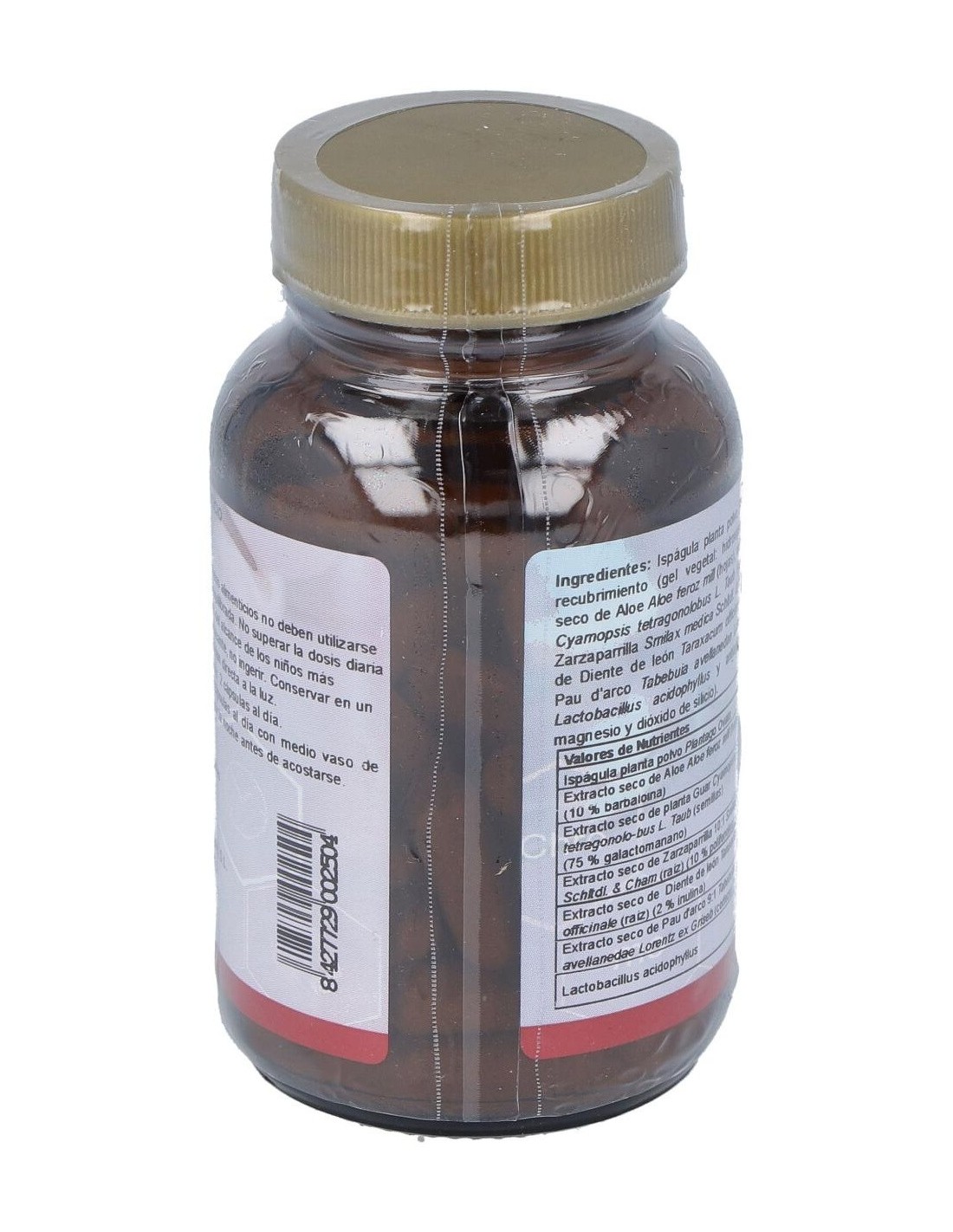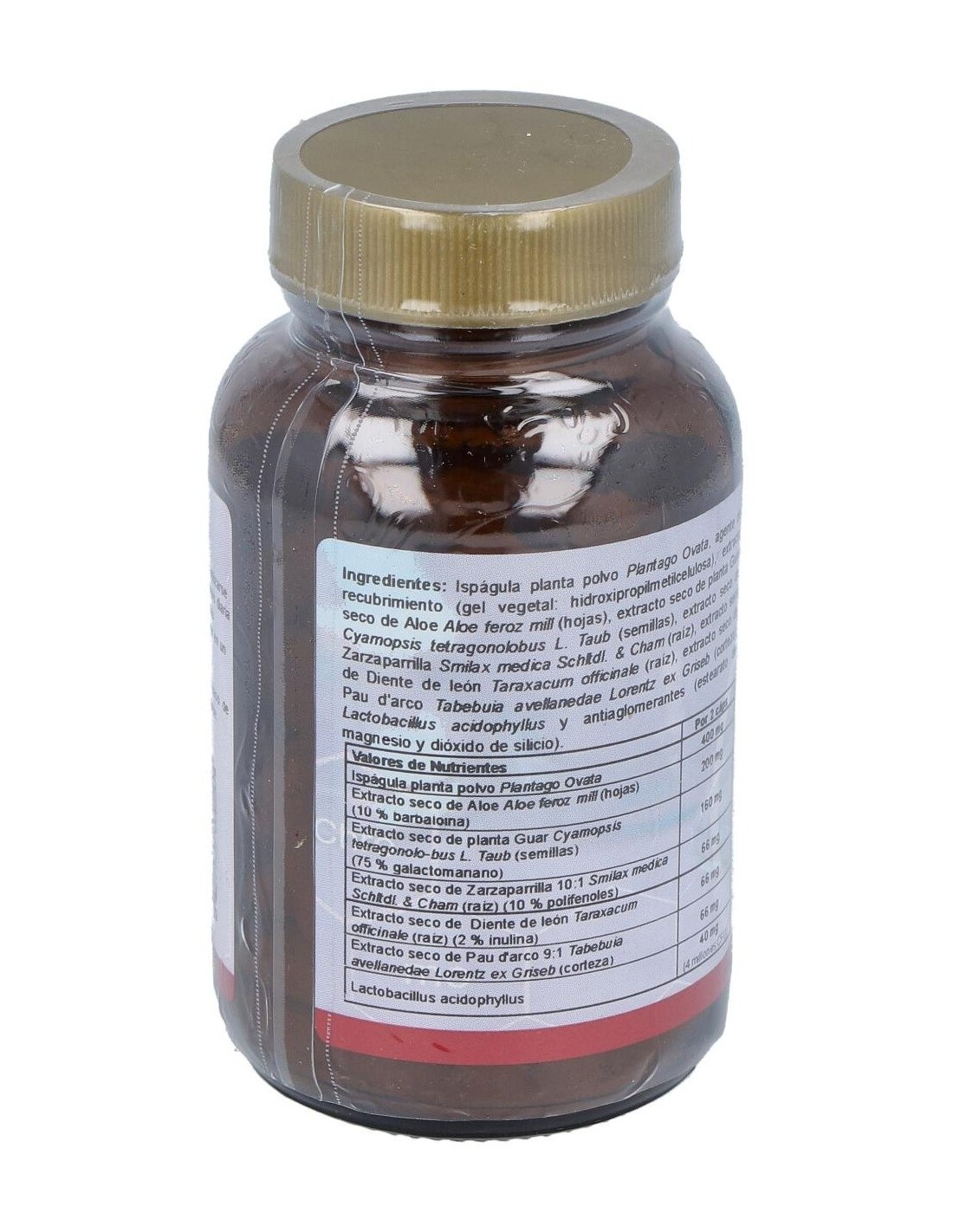 Plantago Polvo, Extracto Seco De Aloe (10% Barbaloina), Semillas De Goma Guar (75% Galactomanano), Extracto Seco De Zarzaparrilla (10% Polifenoles), Extracto Seco De Diente De León (2% Inulina), Extracto Seco De Pau D´arco (Tabebuia Heptaphylla) 5:1, (Aporte 2 Millones Cepas Vivas) Lactobacillus Acidophilus.