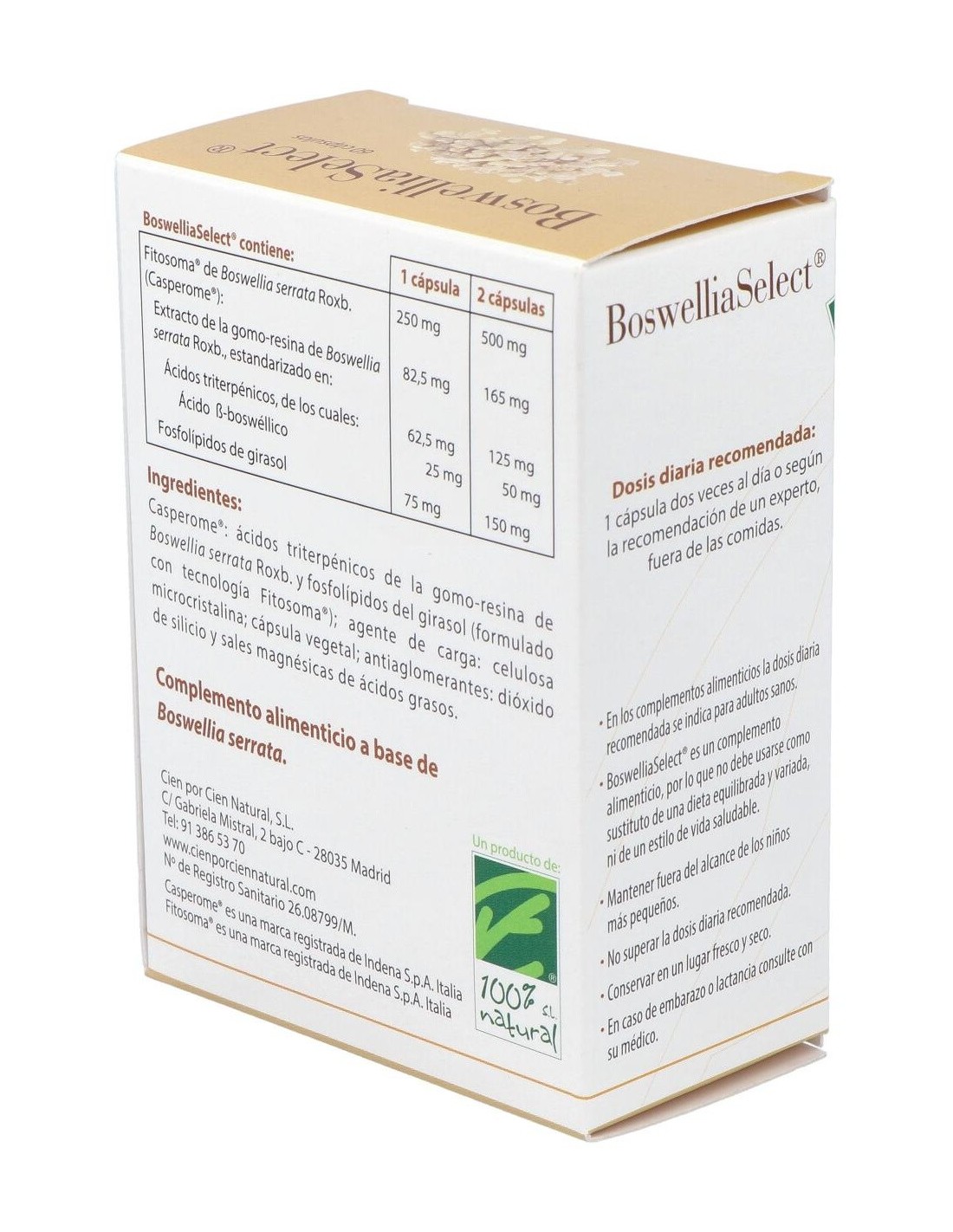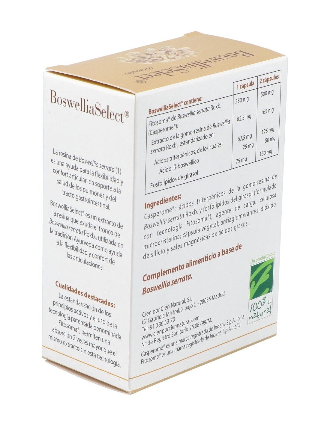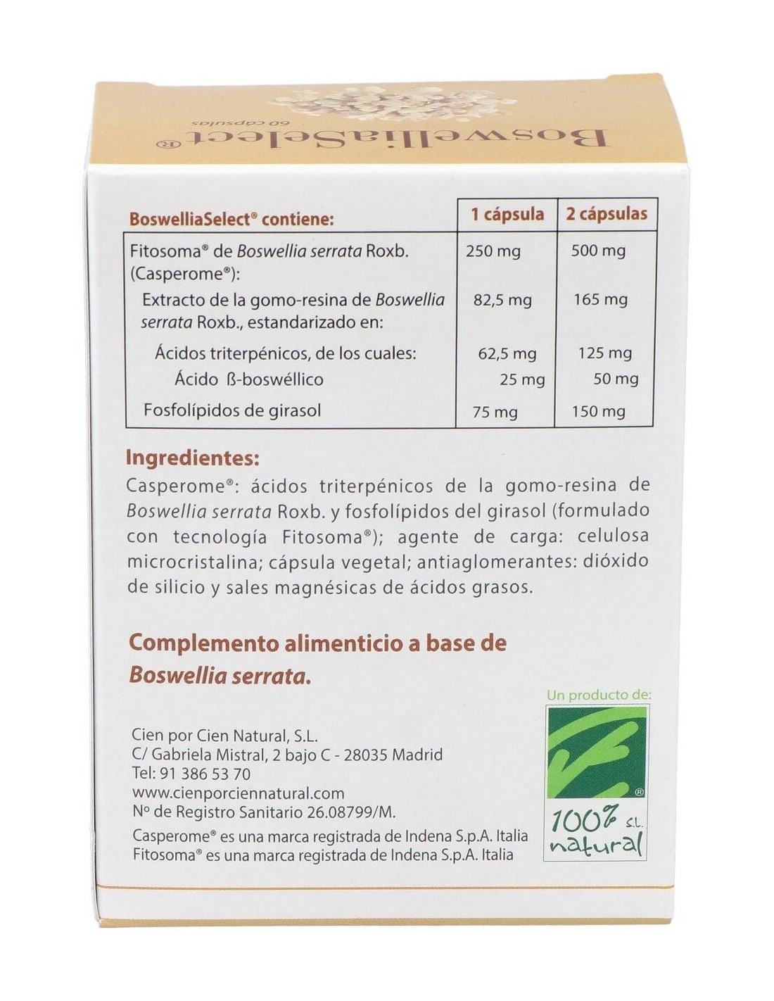 CIEN POR CIEN NATURALBoswellia Select es una formulación a base de un extracto de resina de Boswellia serrata Roxb. y fosfolípidos de girasol en proporción 1:1. El extract