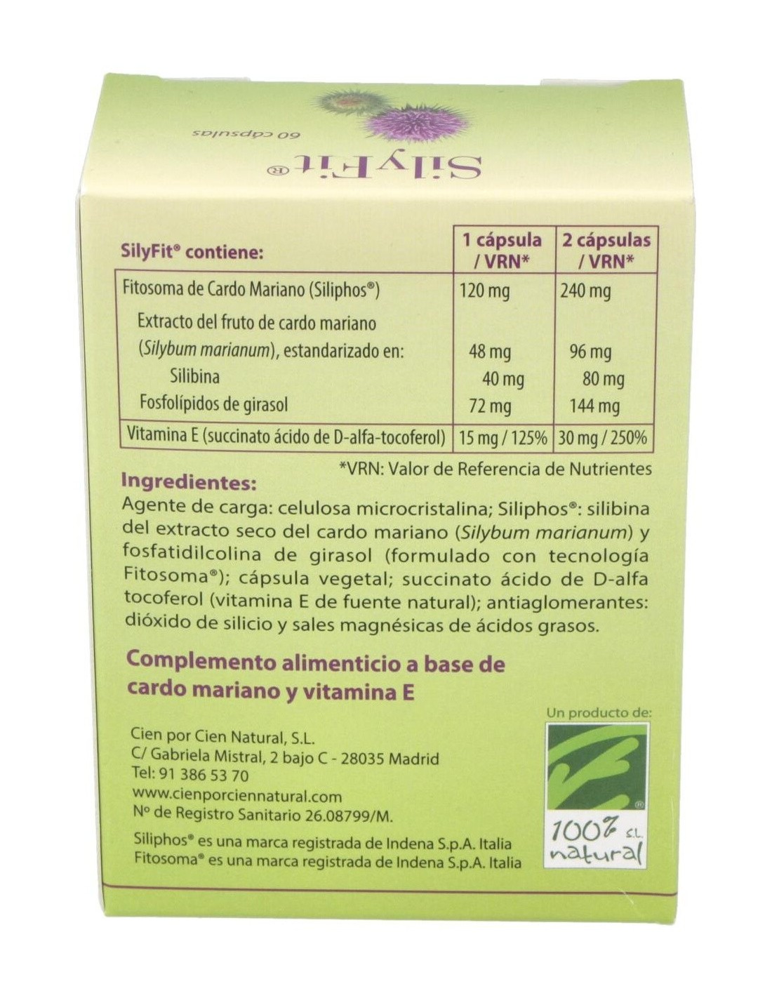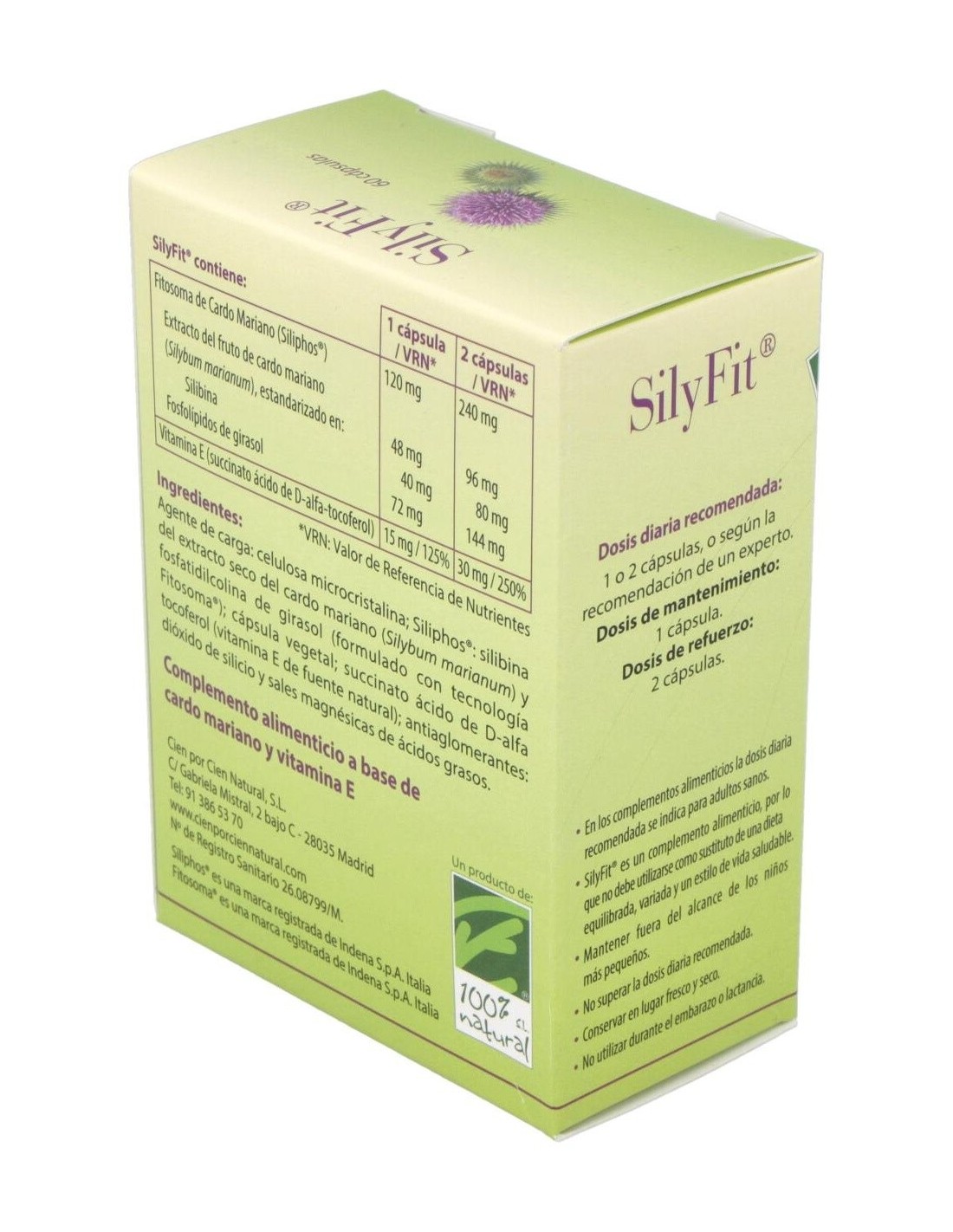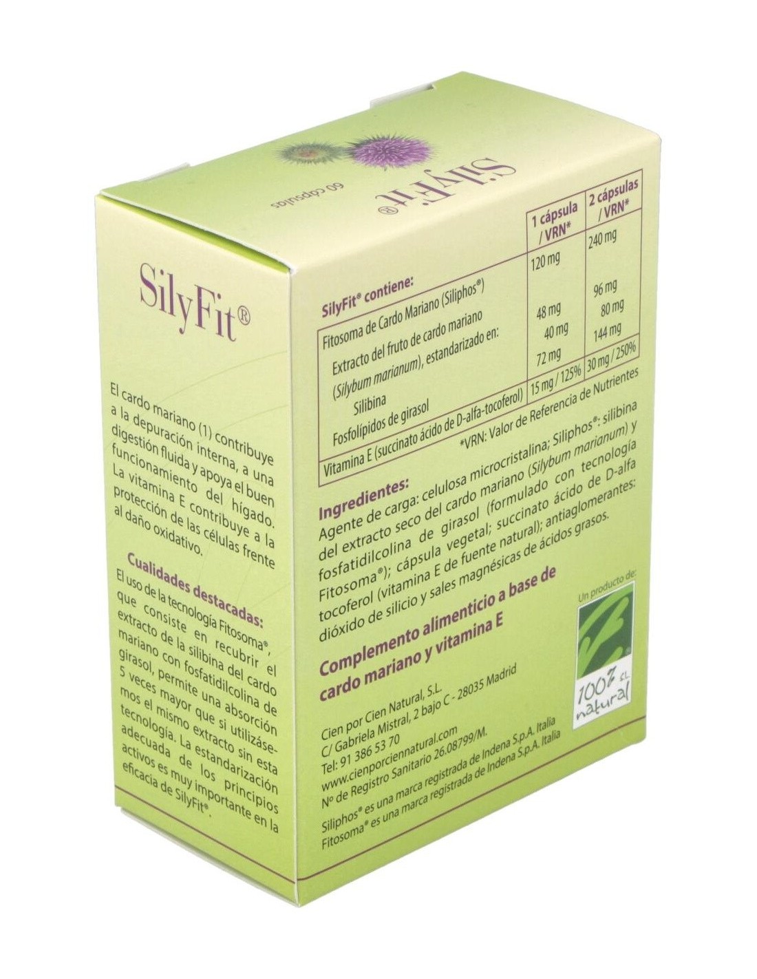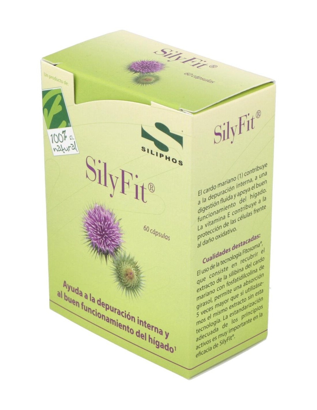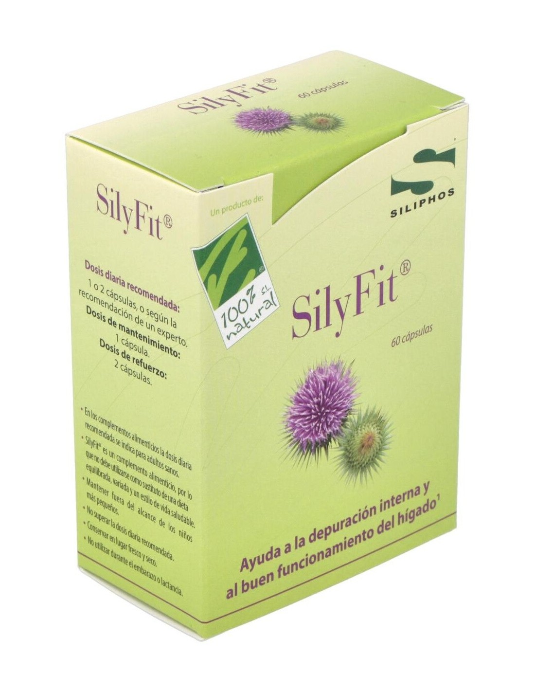 CIEN POR CIEN NATURALSilyFit® es un complemento alimenticio que contiene un extracto patentado de silibina (Siliphos®), procedente de las semillas y frutos del cardo maria