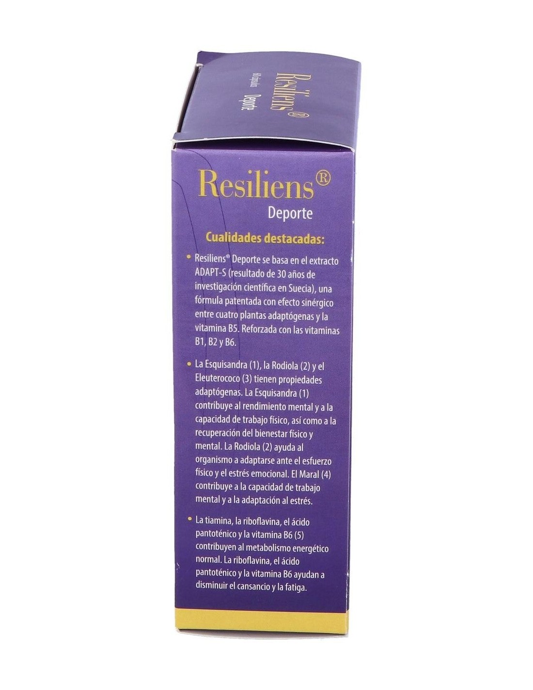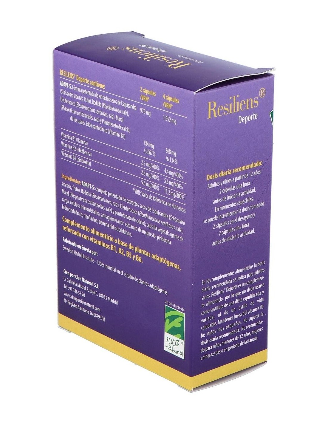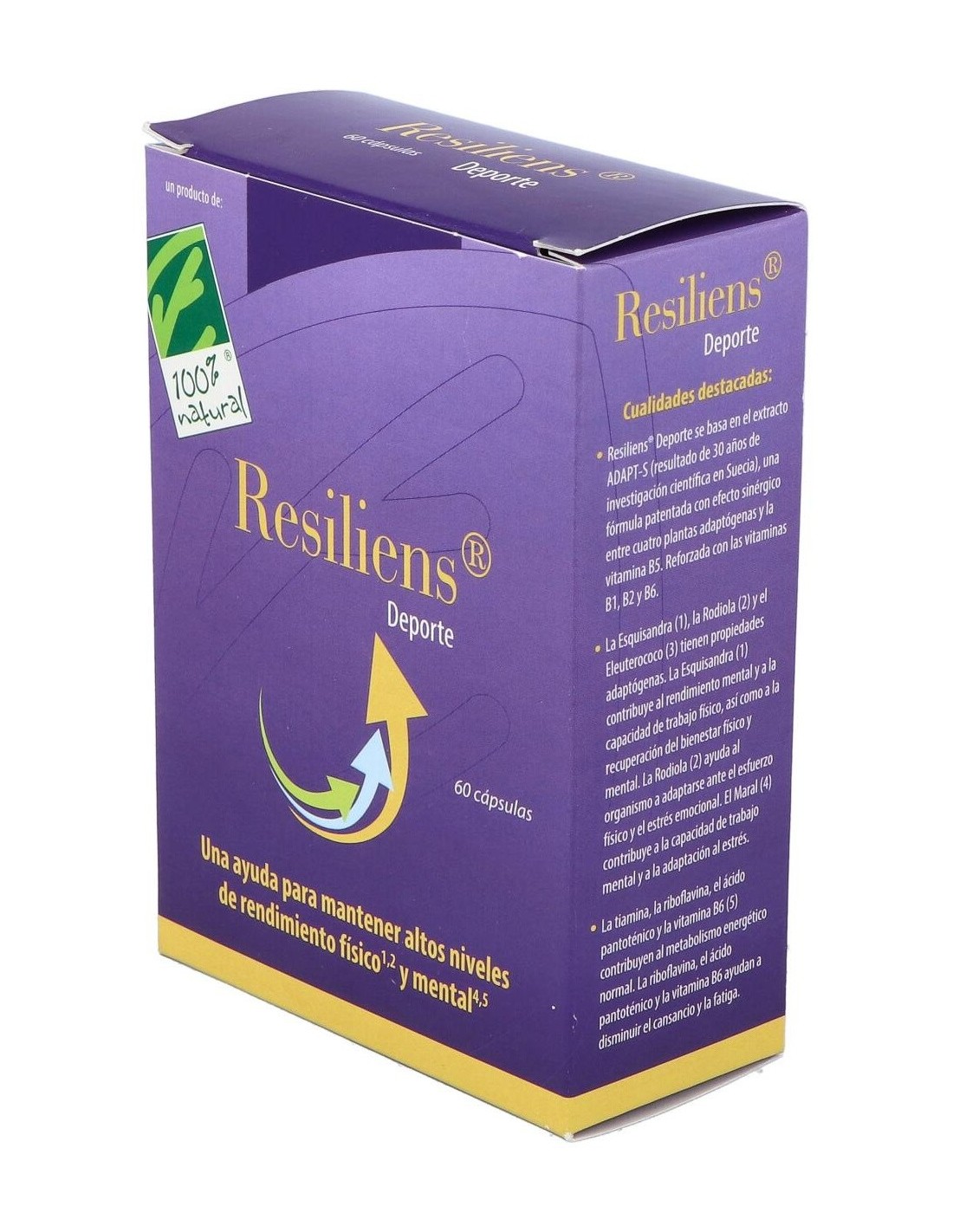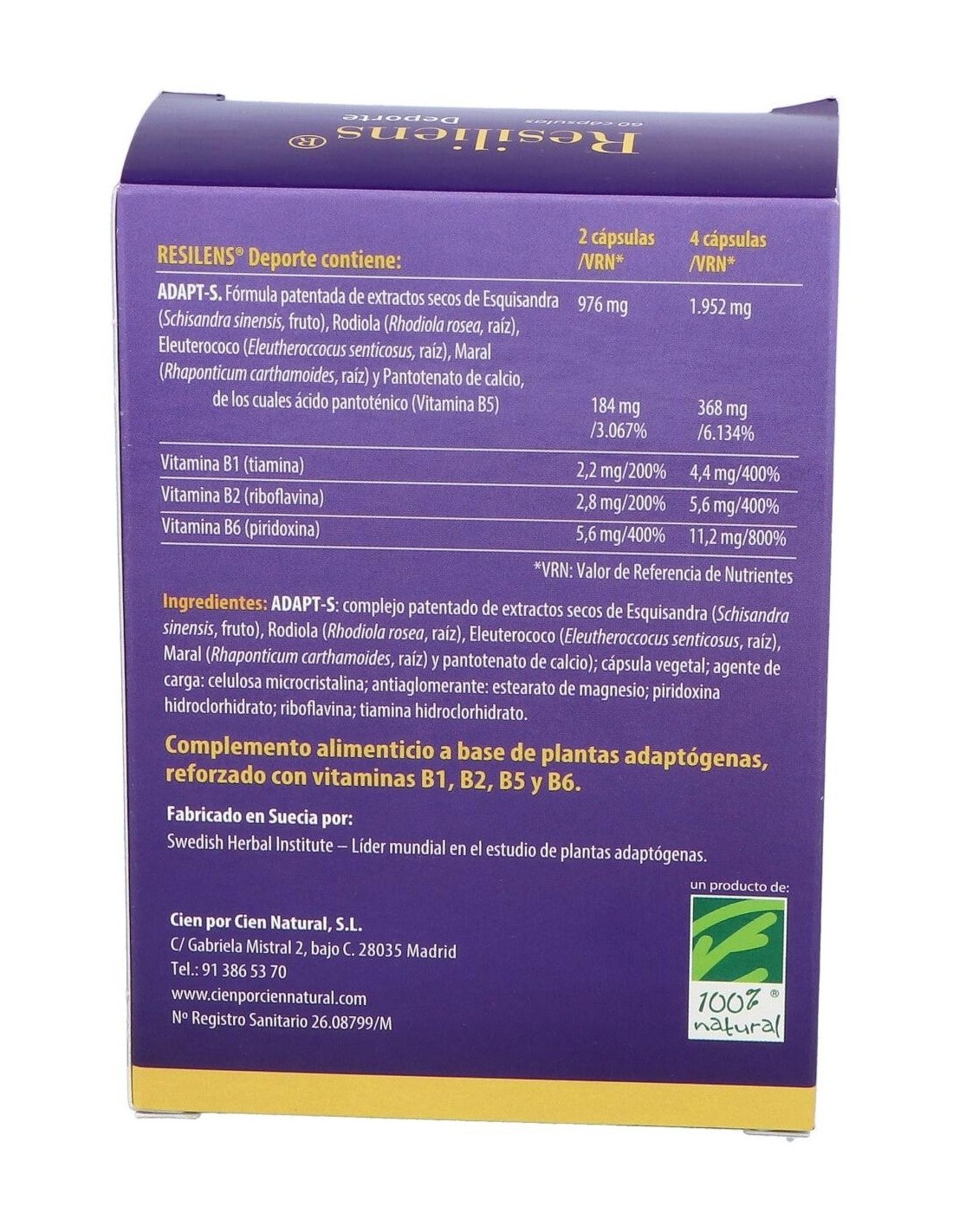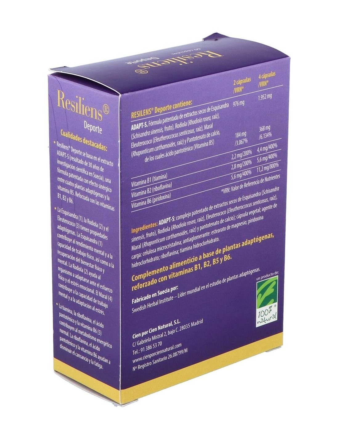 CIEN POR CIEN NATURALFórmula patentada que contiene el complejo ADAPT-S con efecto sinérgico entre tres plantas adaptógenas la Esquisandra, la Rodiola y el Eleuterococo, más otra interesante planta, el Maral, y la vitamina B5. La fórmula se refuerza con las vitaminas B1, B2 y B6, que ayudan a mantener altos niveles de rendimiento físico y mental.