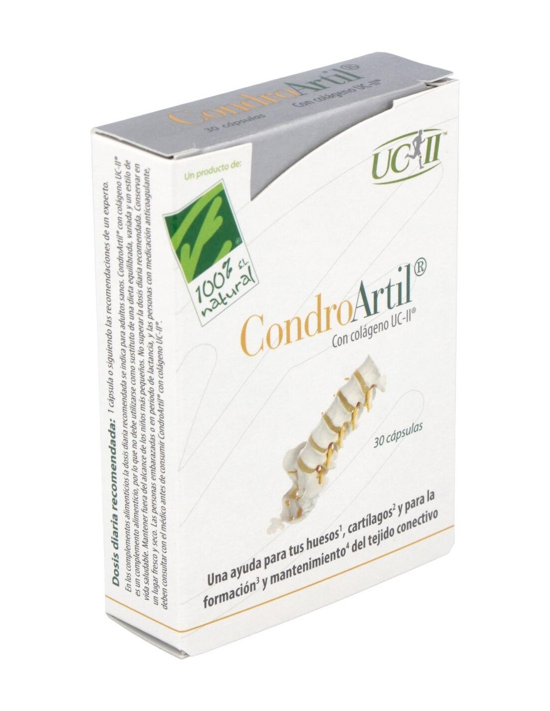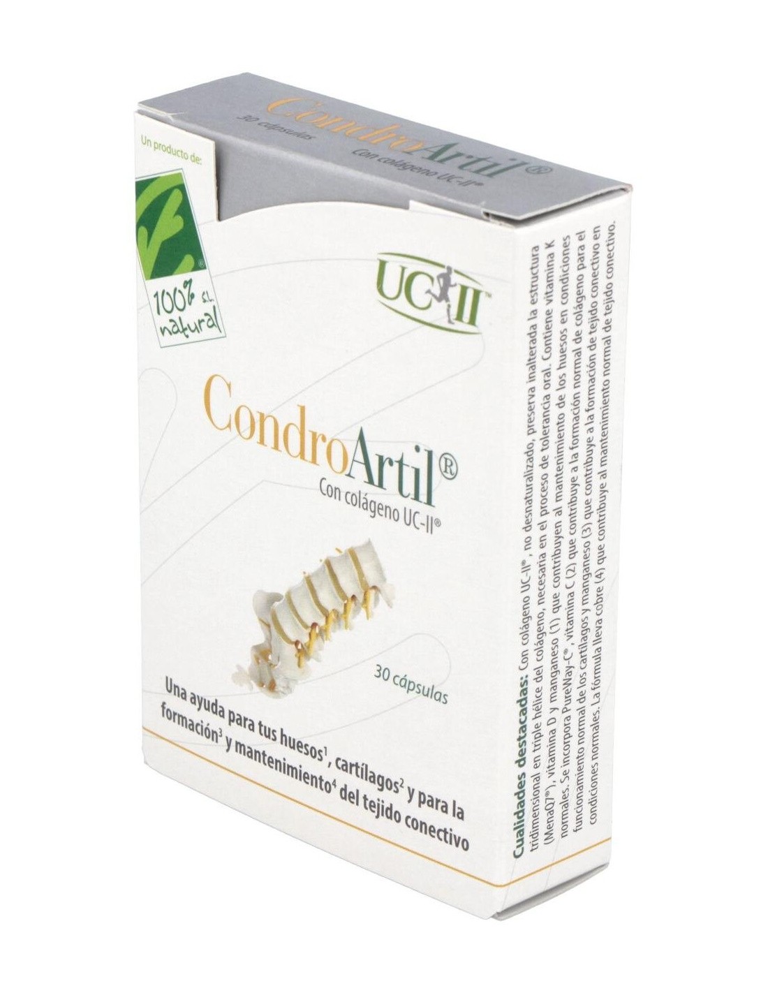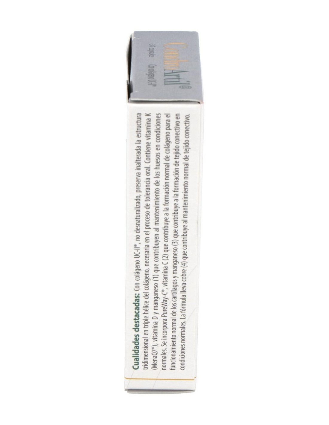 Ingredientes:Ácido L-ascórbico; agente de carga: celulosa microcristalina; cápsula vegetal; UC-II® (colágeno tipo II no desnaturalizado); bisglicinato de cobre; citrato de manganeso; colecalciferol. Modo de empleo: Tomar 1 cápsula al día. Presentación:Envase de 30 cápsulas.