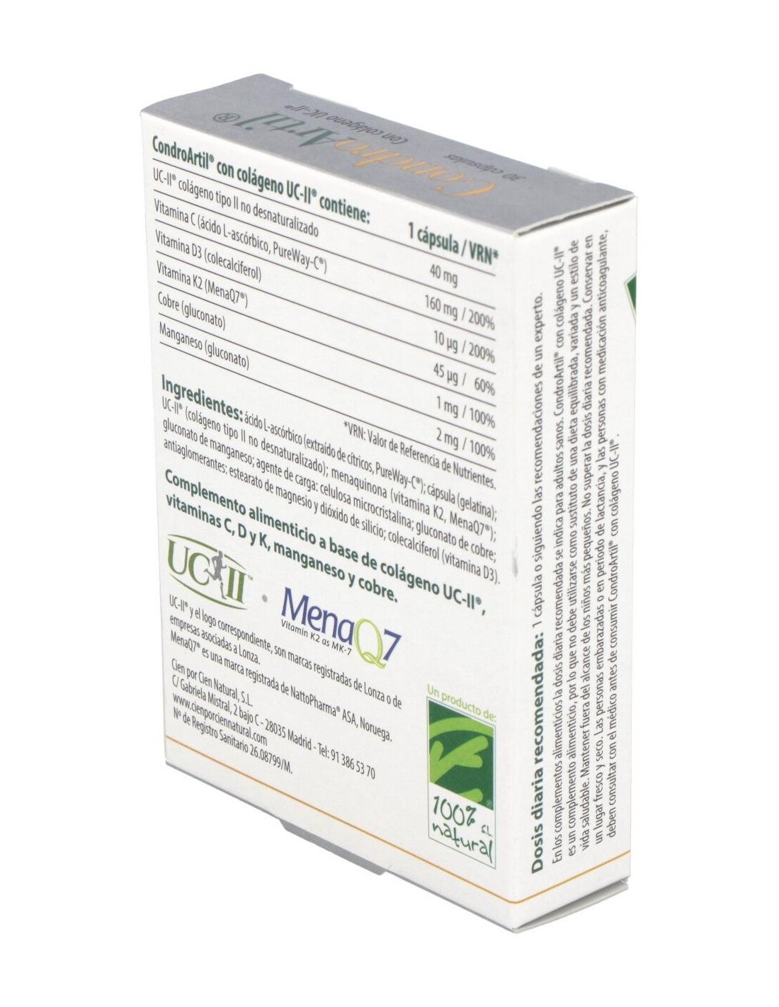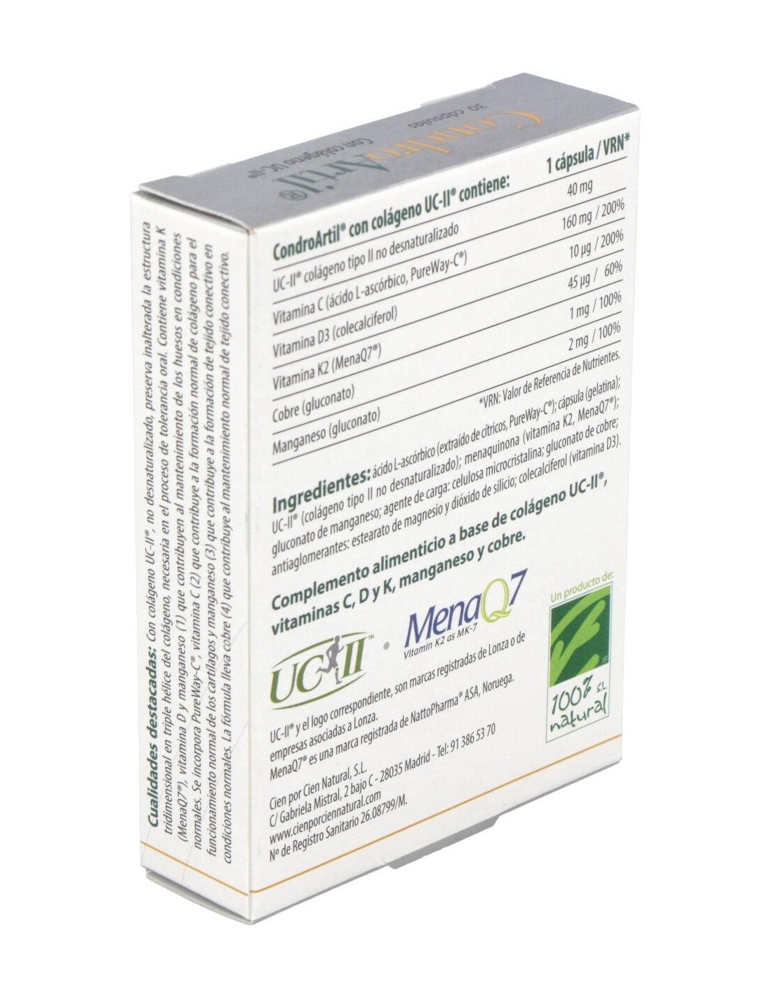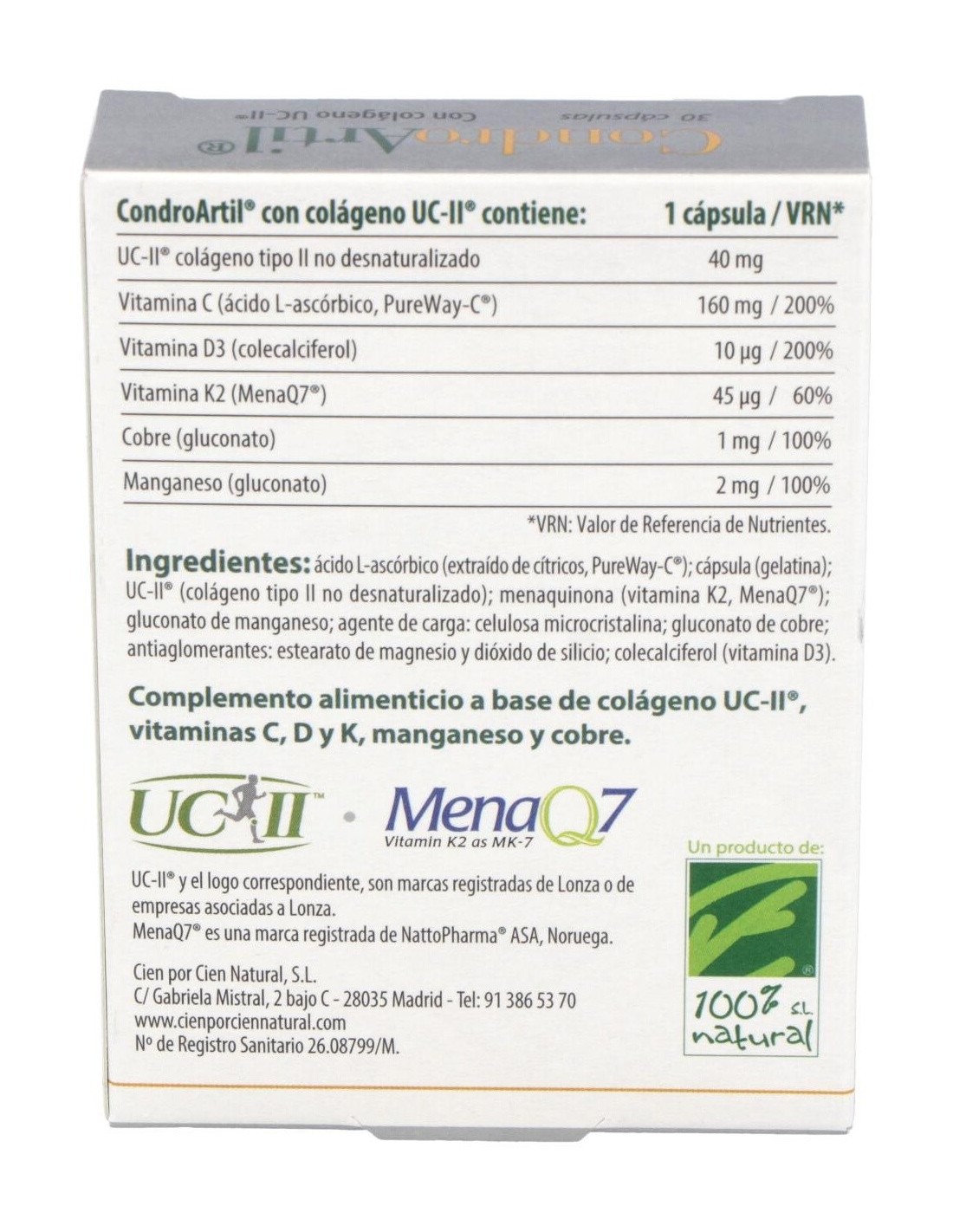 Ingredientes:Ácido L-ascórbico; agente de carga: celulosa microcristalina; cápsula vegetal; UC-II® (colágeno tipo II no desnaturalizado); bisglicinato de cobre; citrato de manganeso; colecalciferol. Modo de empleo: Tomar 1 cápsula al día. Presentación:Envase de 30 cápsulas.
