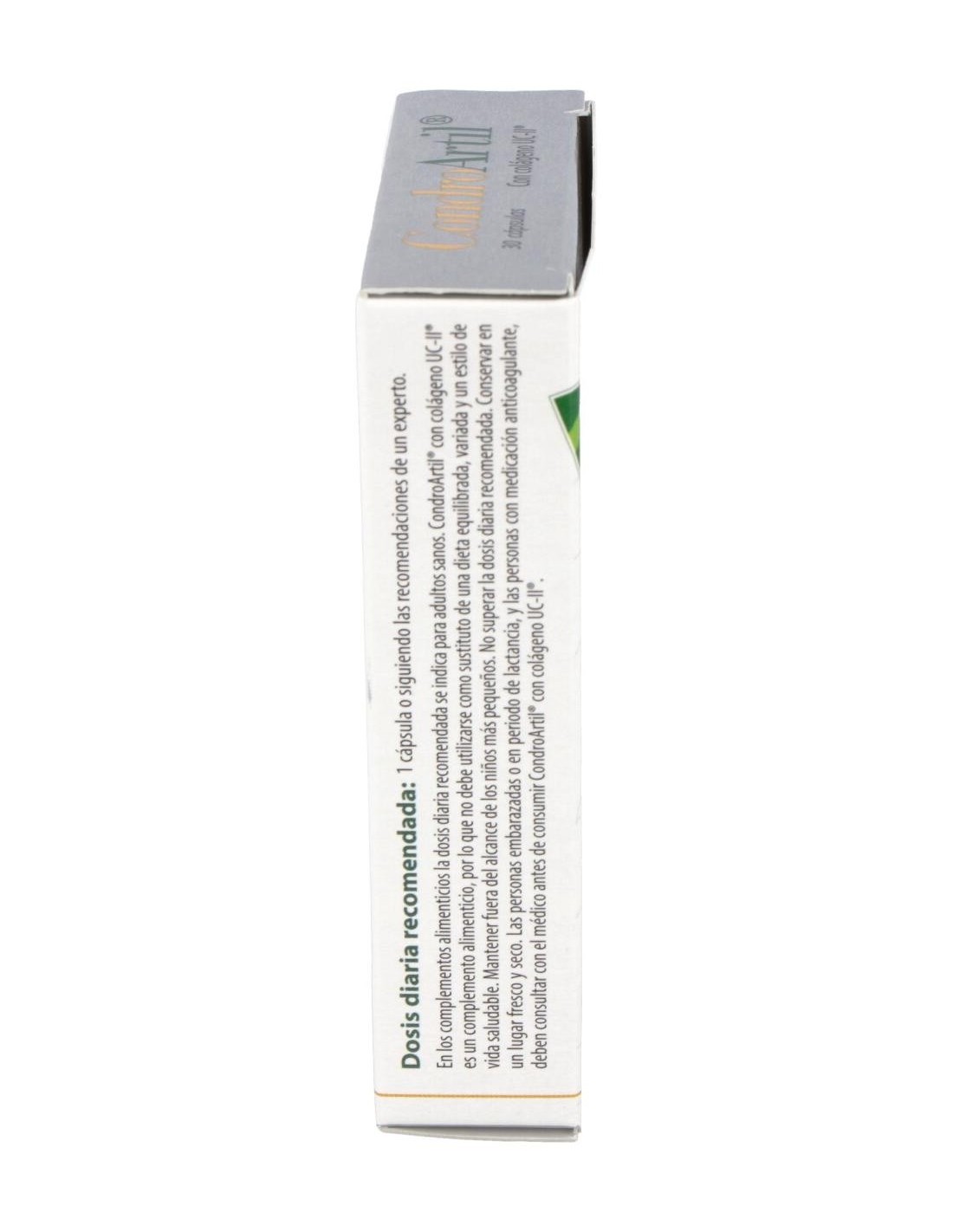 ¿Por que elegir CondroArtil con UC-II®?Contiene el ingrediente patentado y altamente innovador UC-II®, en el que se ha prestado un cuidado especial en conservar su estructura y configuración natural. Triple hélice de colágeno, difícil de destruir por los ácidos y las proteasas del estómago. UC-II® presenta un mecanismo de acción único a través del desencadenamiento de una respuesta inmunitaria. En CondroArtil® con colágeno UC-II®, a diferencia de los colágenos convencionales, la dosis recomendada es significativamente pequeña, una sola cápsula al día. CondroArtil® es una completa fórmula para el cuidado de cartílagos y articulaciones en la que se incluye: UC-II®, vitaminas C y D, manganeso y cobre. Composición activa por cápsula: