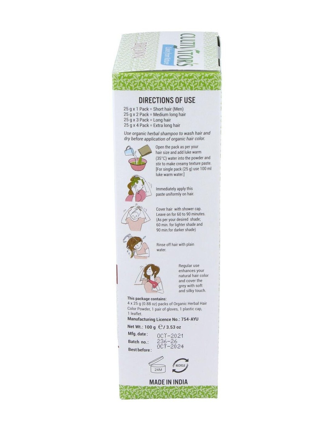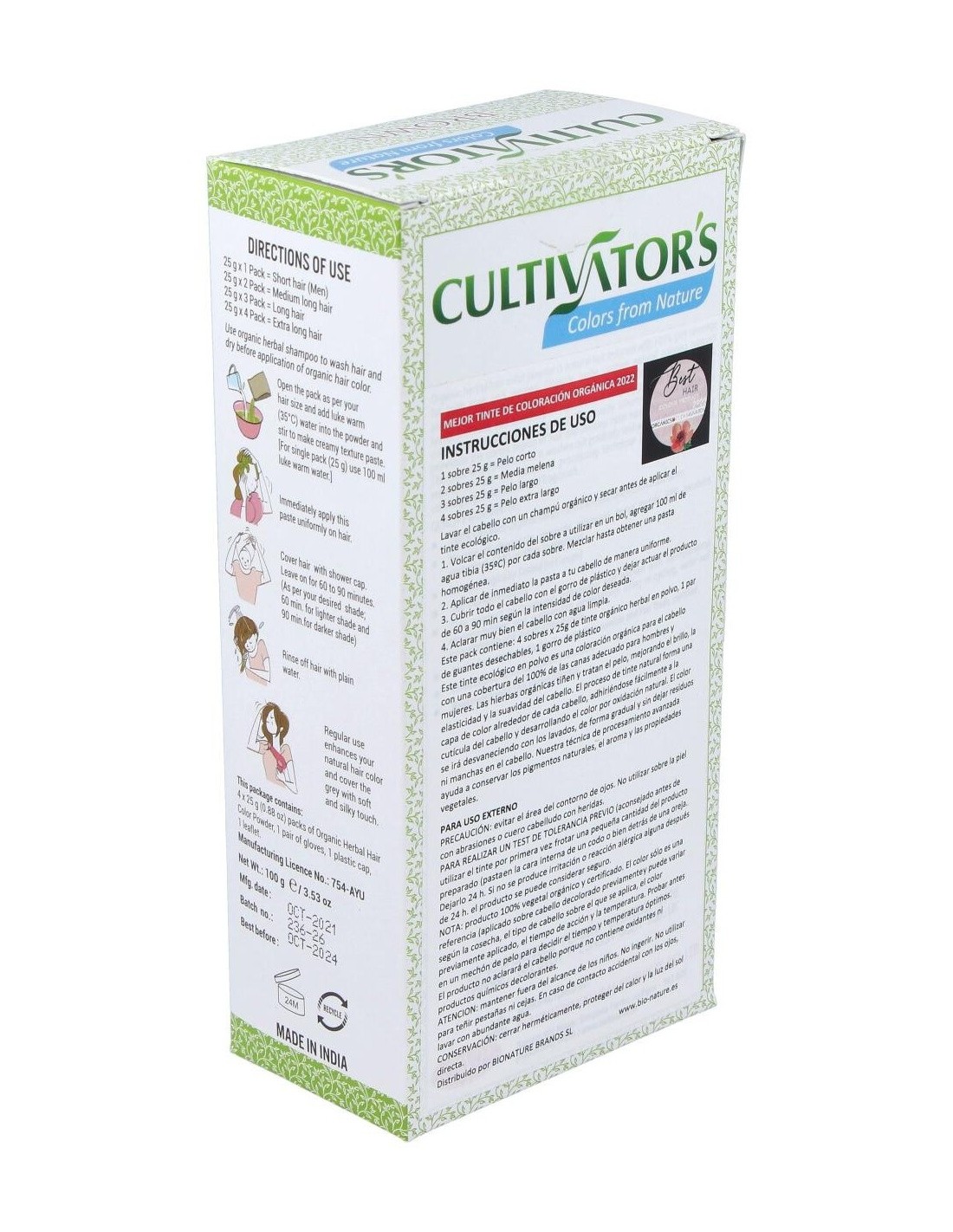 Lavar el cabello con un champú orgánico y secar antes de aplicar el tinte ecológico. Abrir el sobre o los sobres a utilizar según largo del pelo y volcar el contenido en un bol, agregar 100 ml de agua tibia (35ºC) por cada sobre. Mezclar hasta obtener una pasta homogénea. Aplicar de inmediato la pasta a tu cabello de manera uniforme. Cubrir todo el cabello con el gorro de plástico y dejar actuar el producto de 60 a 90 min según intensidad de color deseada (60 min para obtener un tono más claro y 90 min para la máxima intensidad de cada color). Aclarar muy bien el cabello con agua limpia.