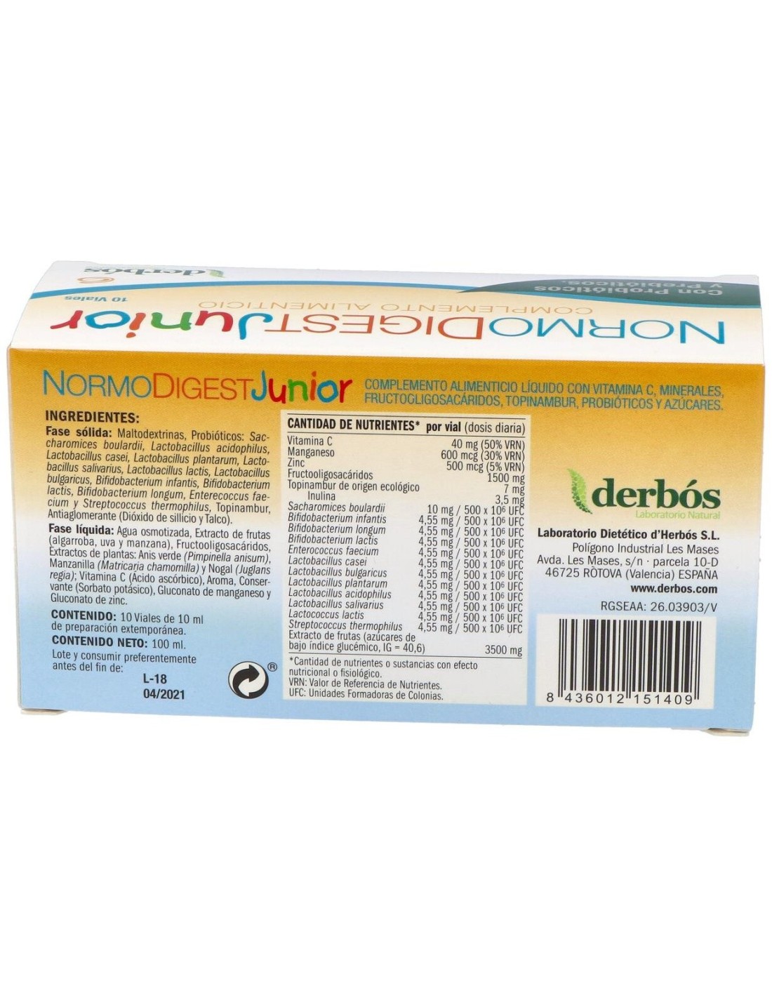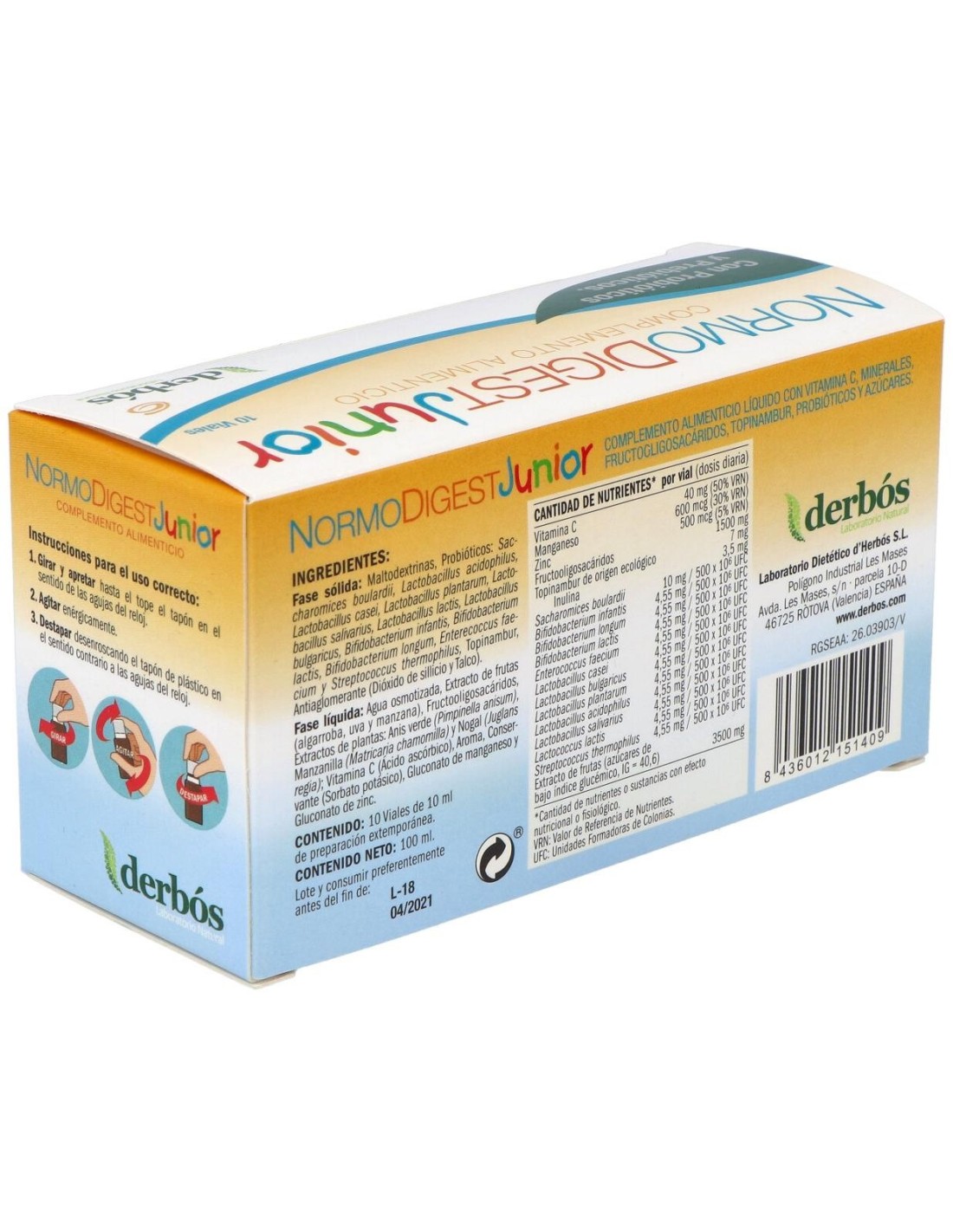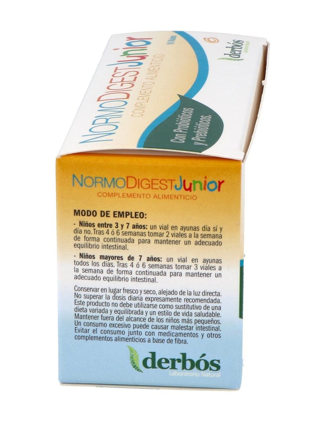 DERBOSNormodigest Junior 10Viales de Derbos es un complemento digestivo para niños que favorece el bienestar intestinal, formulado con ingredientes que apoyan la función digestiva diaria.