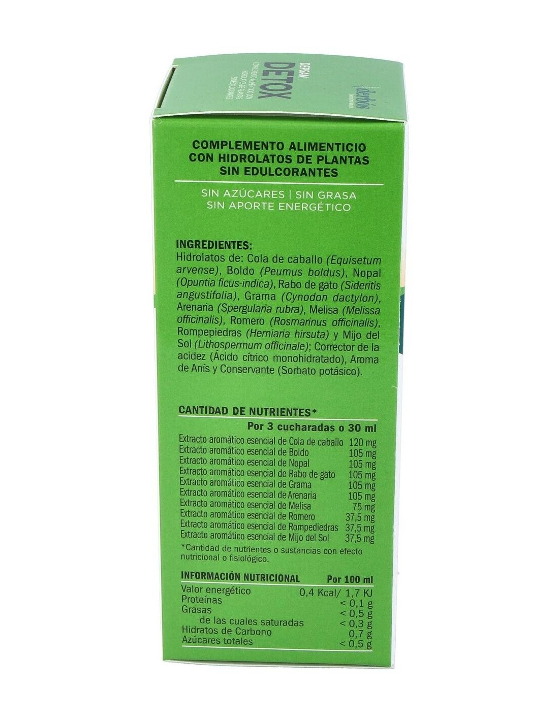 Hidrolatos de: Boldo (Peumus boldus), Cola de caballo (Equisetum arvense), Nopal (Opuntia ficus-indica), Melisa (Melissa officinalis), Rabo de gato (Sideritis angustifolia), Romero (Rosmarinus officinalis), Grama (Cynodon dactylon), Rompepiedras (Herniaria hirsuta), Arenaria (Spergularia rubra), Mijo del Sol (Lithospermum officinale), Corrector de la acidez (Ácido cítrico monohidratado), Aroma de Anís, Conservante (Sorbato potásico)