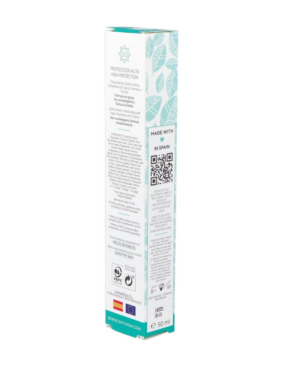Eco Suncare® Protector Solar Spf50 de Dhyvana es un filtro solar físico que proporciona una fotoprotección de amplio espectro frente a las radiaciones UVA y UVB para todos los fototipos. Gracias a su alto factor de protección, ayuda eficazmente a prevenir quemaduras causadas por el sol, así como la oxidación y el envejecimiento cutáneo. Su composición natural, 100% mineral y sin nanopartículas, es respetuosa con el medio ambiente y puede utilizarse en ecosistemas acuáticos protegidos.