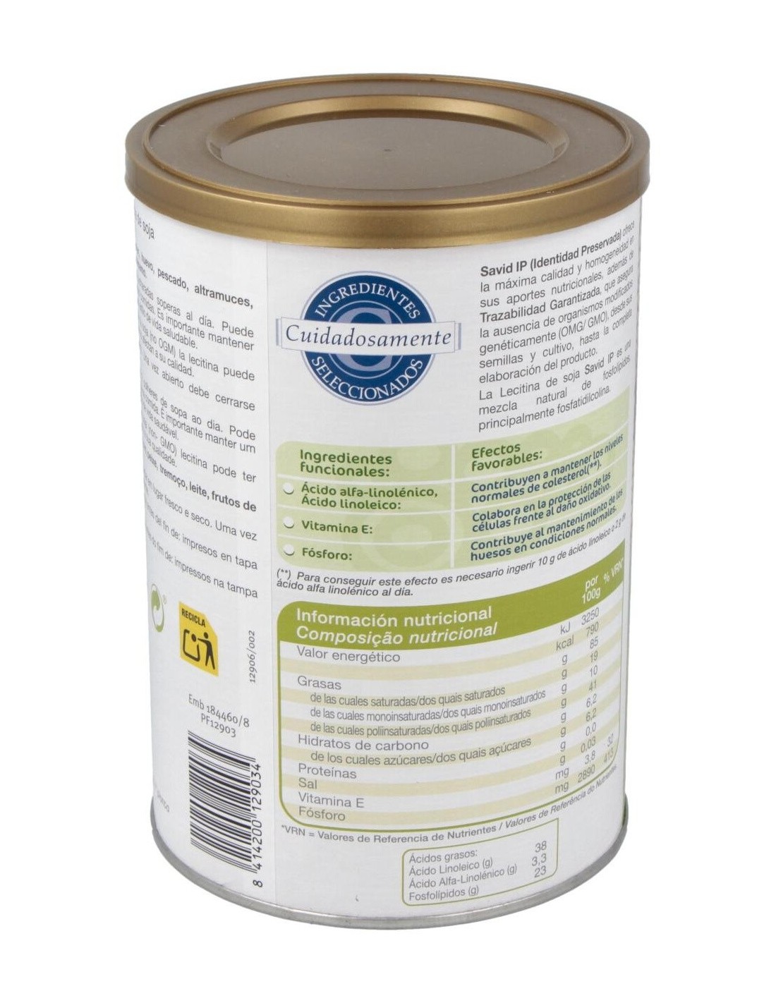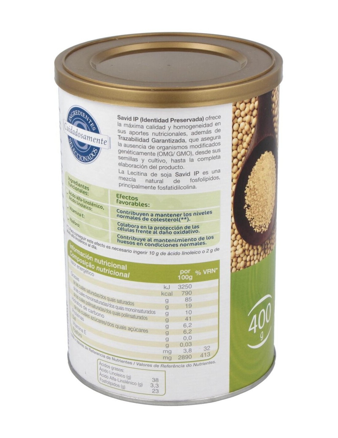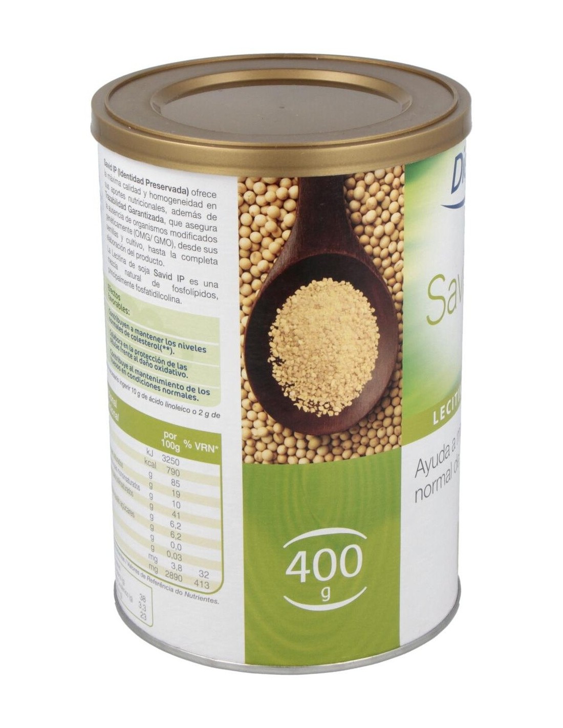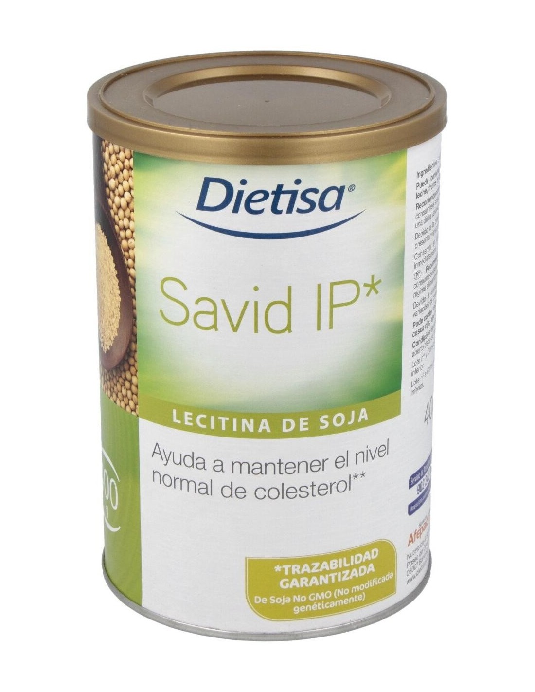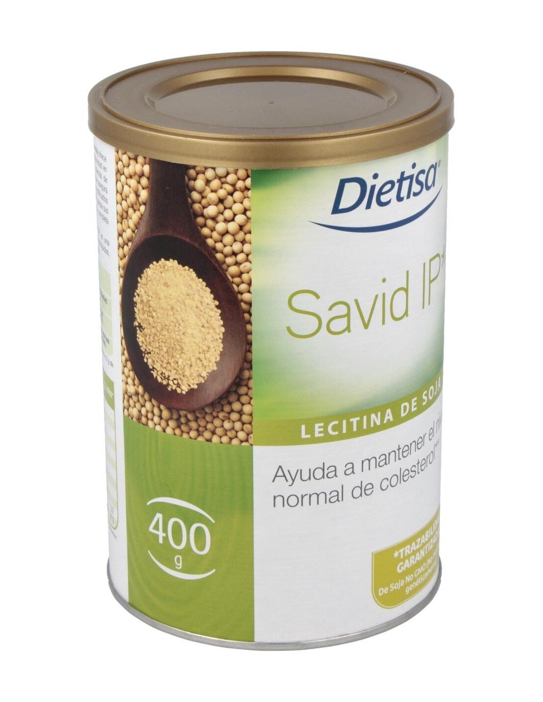 DIELISA®Dietisa Savid Ip Lecitina De Soja 400g es un complemento alimenticio a base de lecitina de soja que contribuye a mantener niveles normales de colesterol. Savid IP (Identidad preservada) es una mezcla natural de fosfolípidos que ofrece la máxima calidad y homogeneidad, además de trazabilidad garantizada, pues este producto asegura que no contiene organismos modificados genéticamente (OMG/GMO) de ningún tipo y en todos los procesos, desde el cultivo y las semillas hasta la completa e.