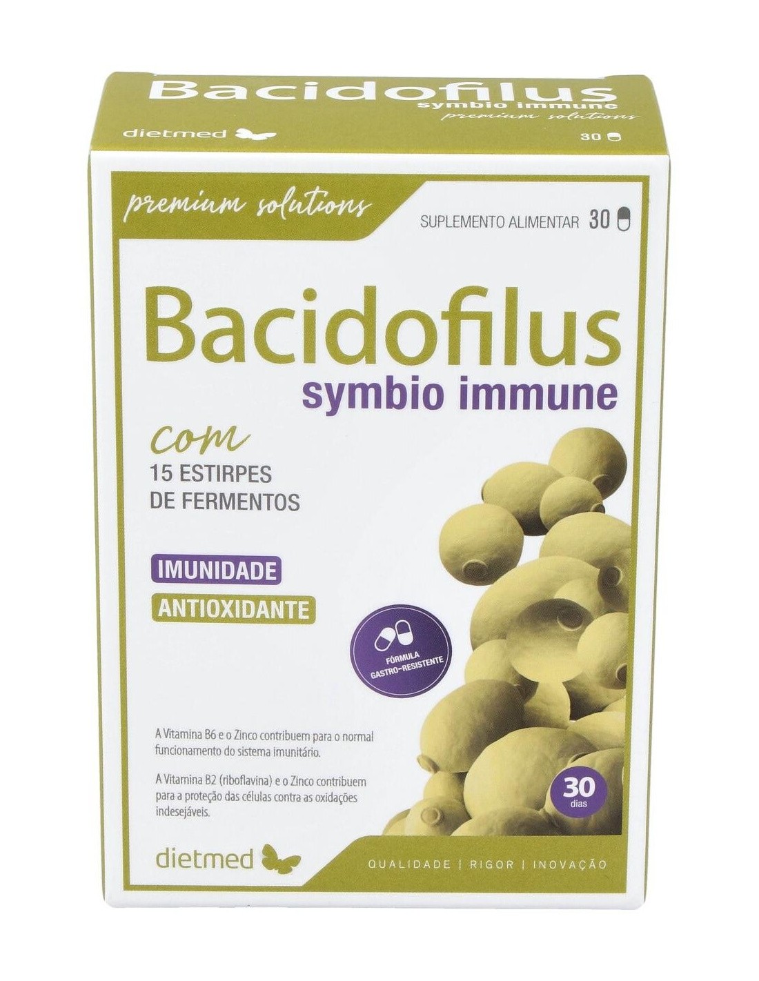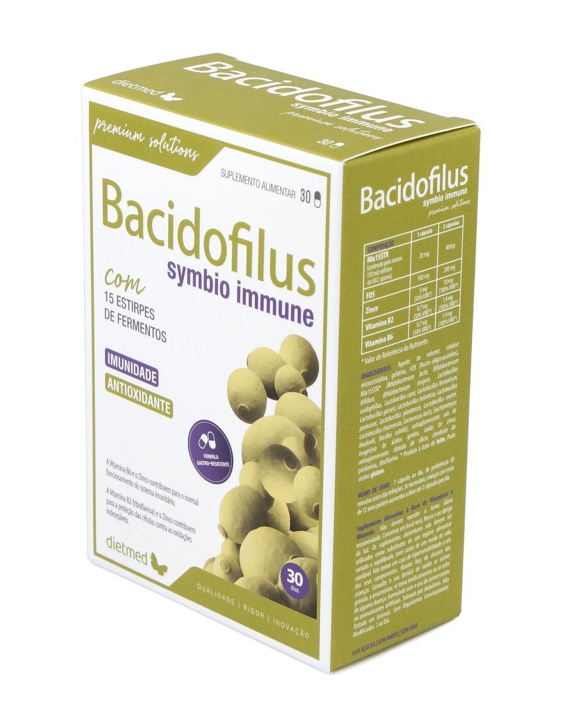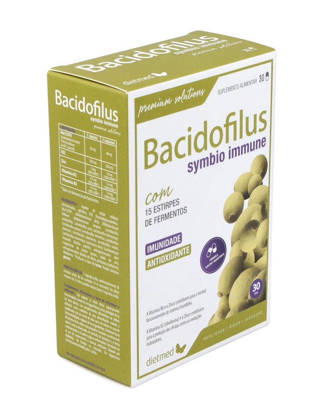 DIETMEDEl producto Bacidofilus Symbio presenta en su composición un conjunto de 15 estirpes de fermentos lácticos, siendo estos essenciales para una correcta