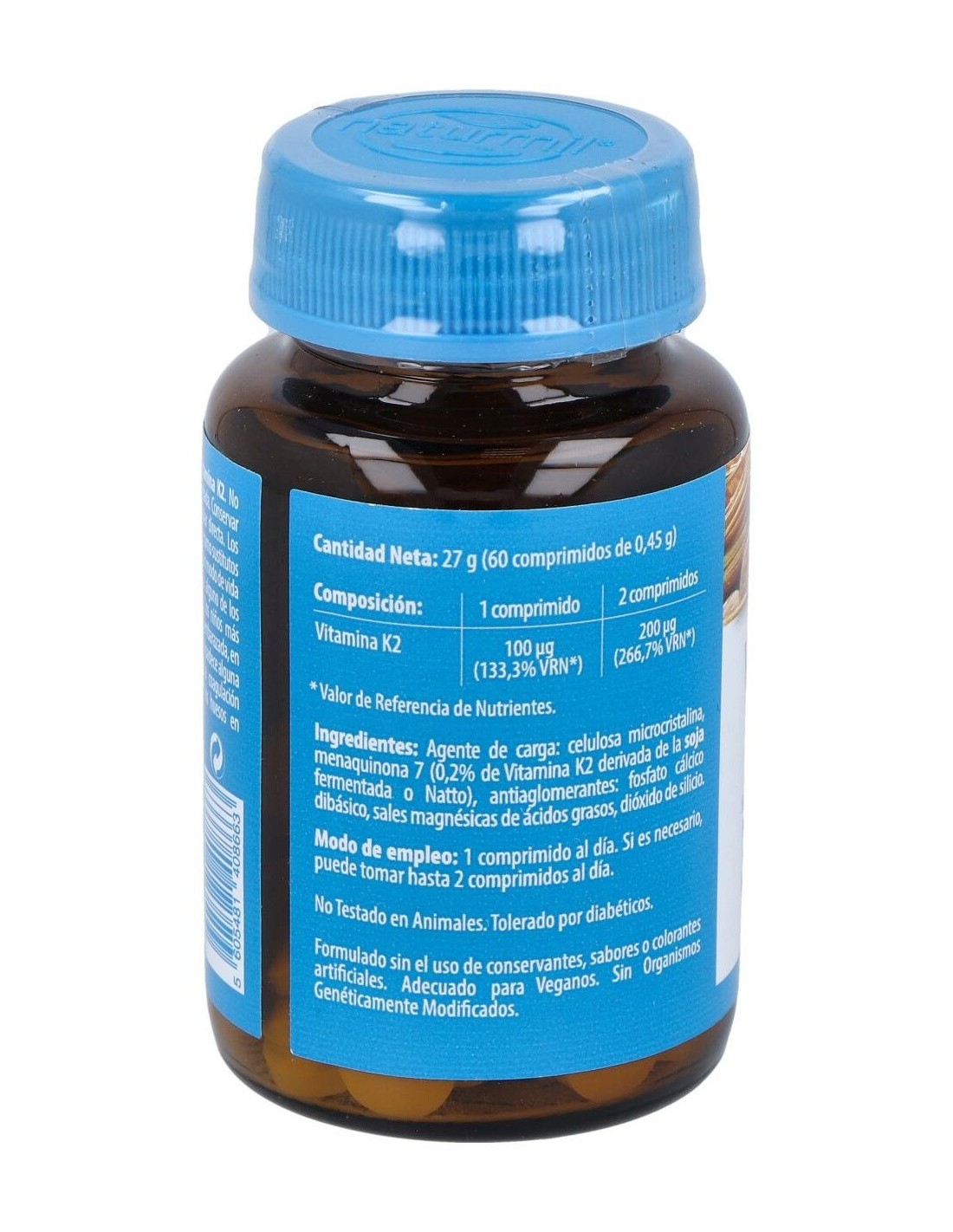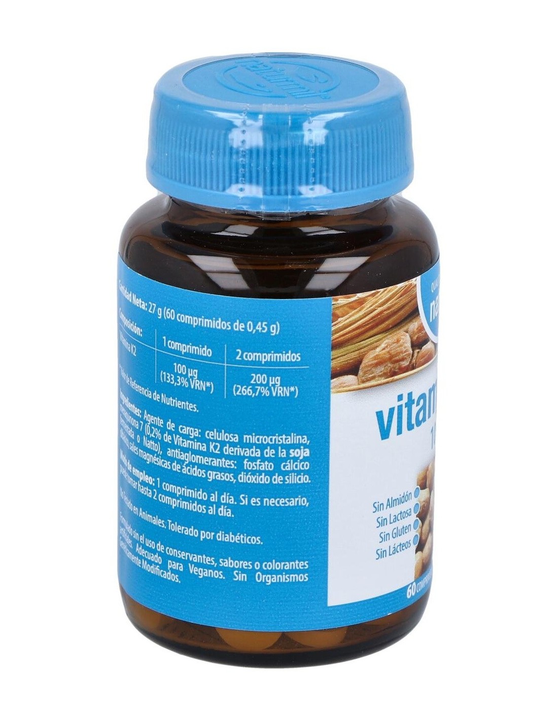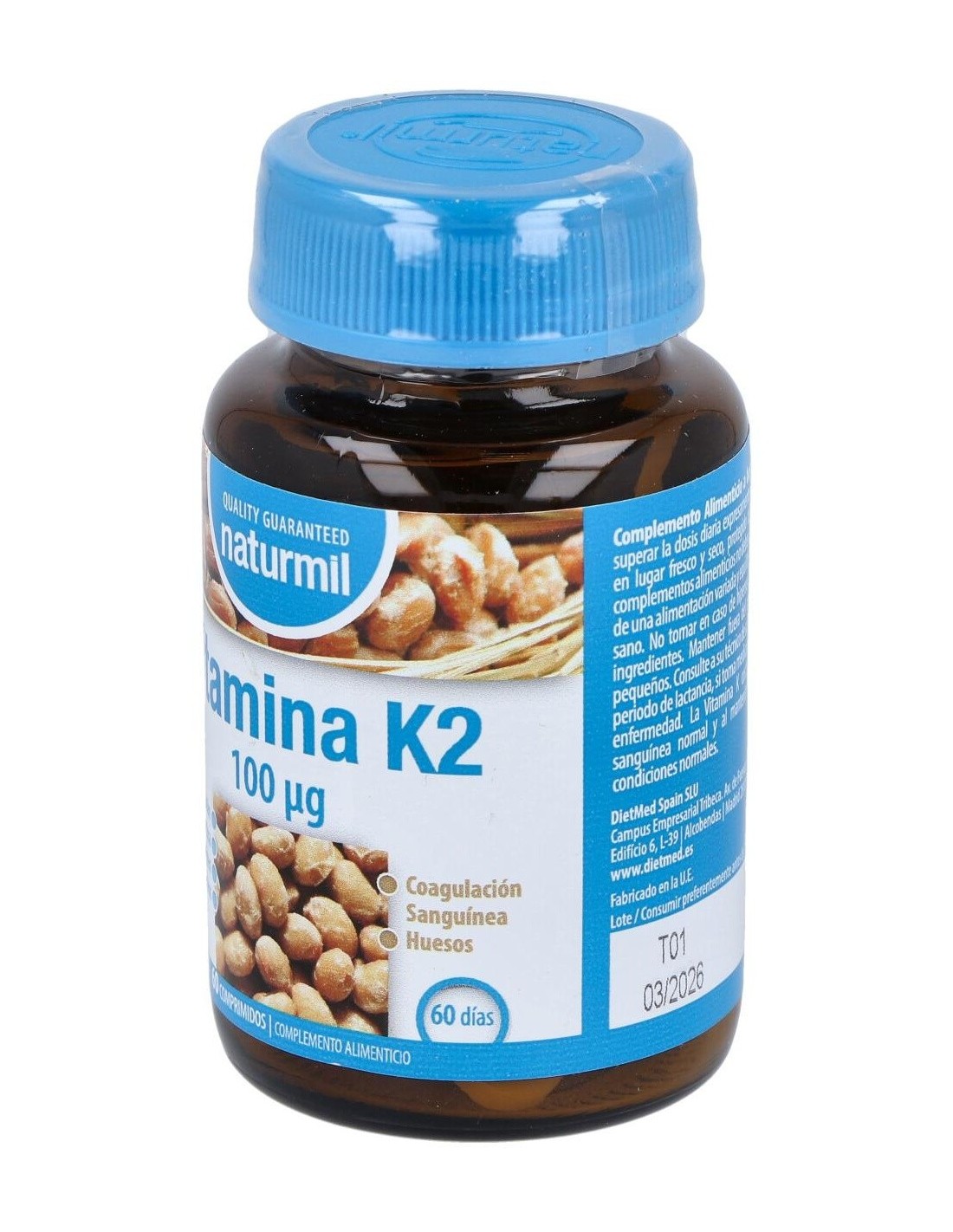 La Vitamina K contribuye a la coagulación sanguínea normal y al mantenimiento de los huesos en condiciones normales. Es recomendado en casos de anomalías en el metabolismo óseo, como osteopenia y osteoporosis, aterosclerosis y para normalización de la coagulación sanguínea.Composición activa por comprimido:100 mcg de vitamina K2.Ingredientes:Agente de carga: celulosa microcristalina, menaquinona 7 (0,2% de Vitamina K2 derivada de la soja fermentada o Natto), antiaglomerantes: fosfato cálcico dibásico, magnesio estearato, dióxido de silicio.Modo de empleo:Tomar 1 comprimido al día, antes de la comida.Presentación:Envase de 60 comprimidos.Recomendaciones y advertencias:No contiene gluten ni lactosa.