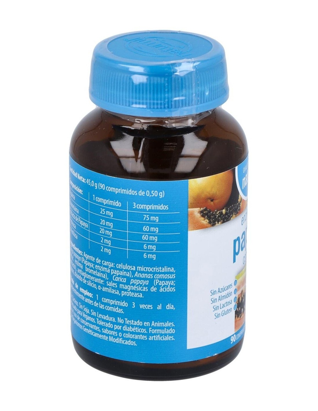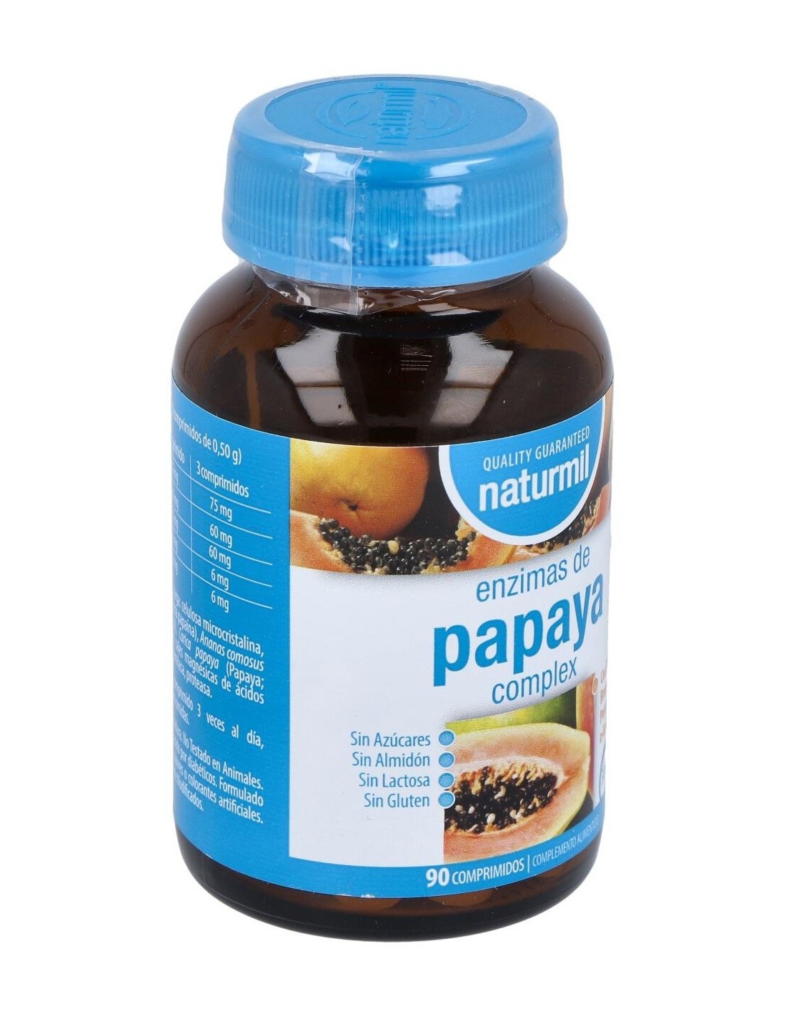 - Contiene enzimas naturales extraídas de la papaya, que contribuyen a la descomposición de proteínas en el proceso digestivo.