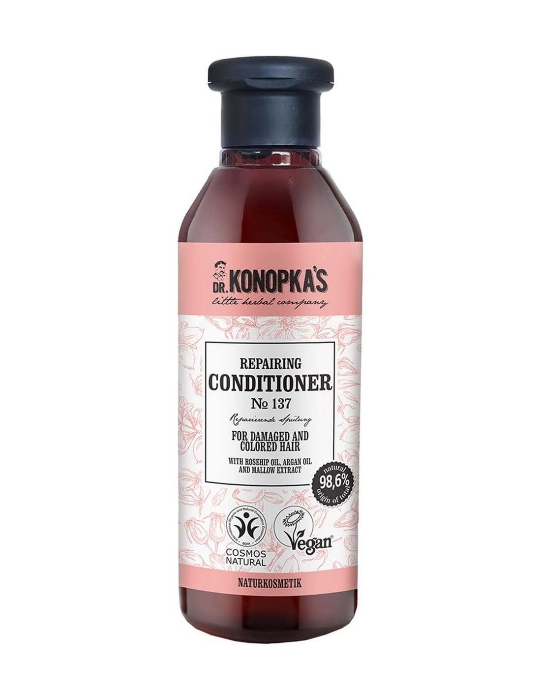 DR. KONOPKA´SEste rico acondicionador está formulado para reavivar el cabello severamente dañado y teñido. El aceite de argán, aceite de escaramujo y extracto de malva orgánicos reparan intensamente el cabello quebradizo, suavizan y desenredan, dejando el cabello fuerte y brillante. Certificado BDIH Cosmos Natural y Vegan.