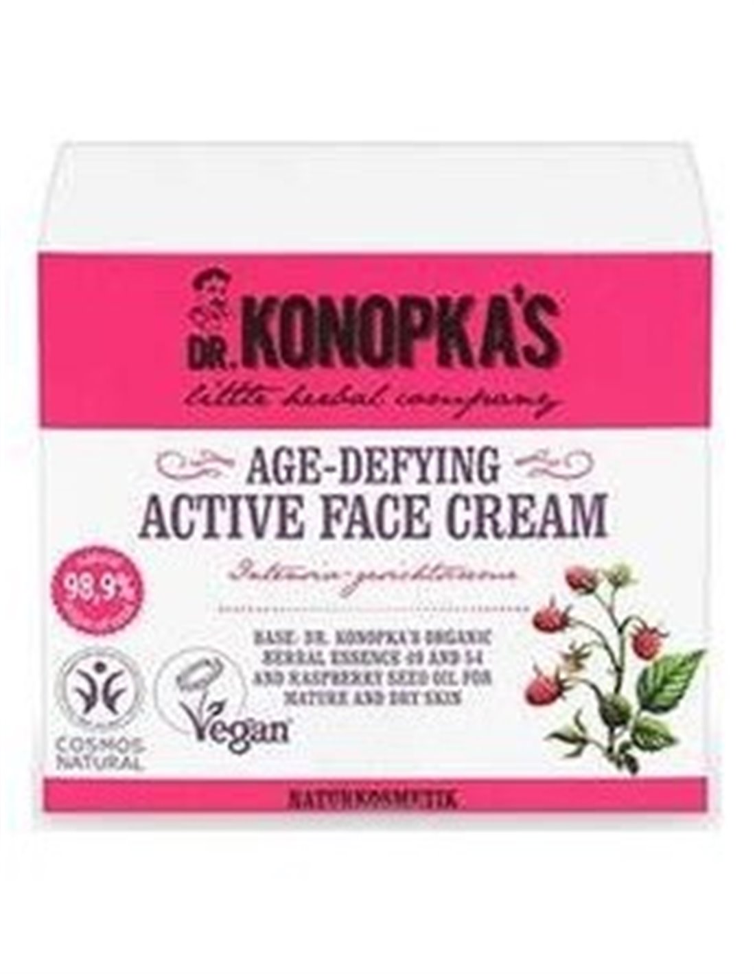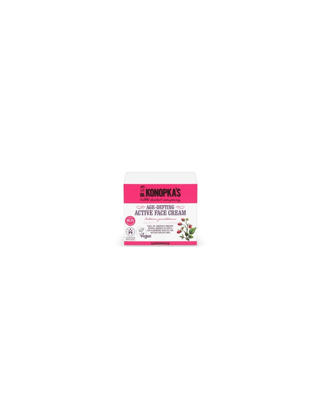 DR. KONOPKA´SLa crema facial intensiva anti-age está compuesta por las especiales esencias orgánicas herbales nº 49 y nº 54. Contiene vitaminas y nutrientes minerales que proporcionan a la piel madura y seca una nutrición extra e hidratación que ayudan a prevenir el envejecimiento prematuro de la piel. En combinación con las frambuesas estimula la regeneración de la piel y la reconstrucción de su equilibrio energético, reafirmándola y aportándole elasticidad. Producto vegano. Cosmos Natural.