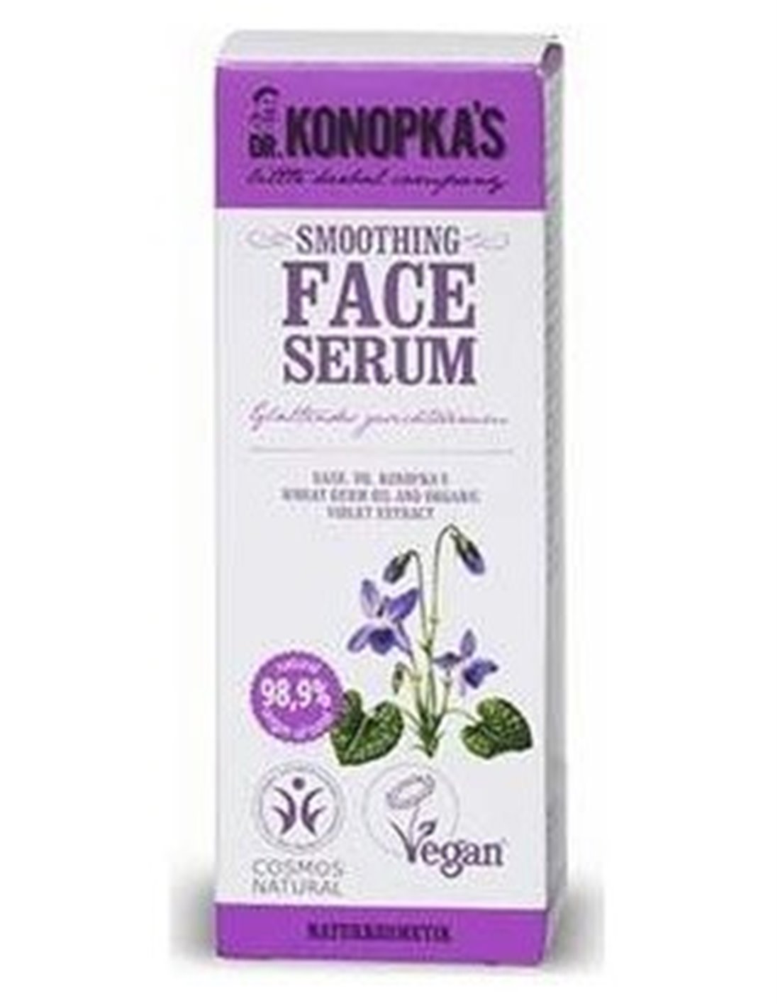 DR. KONOPKA´SEl sérum facial suavizante contiene germen de trigo que posee un alto contenido en vitamina E y ácidos poliinsaturados esenciales para completar la rutina de cuidado facial y proporcionar beneficios hidratantes y reconstituyentes para la piel. En combinación con el extracto de violeta promueve el rejuvenecimiento de la textura y el tono de la piel, corrigiendo las imperfecciones. Producto vegano. Cosmos Natural.