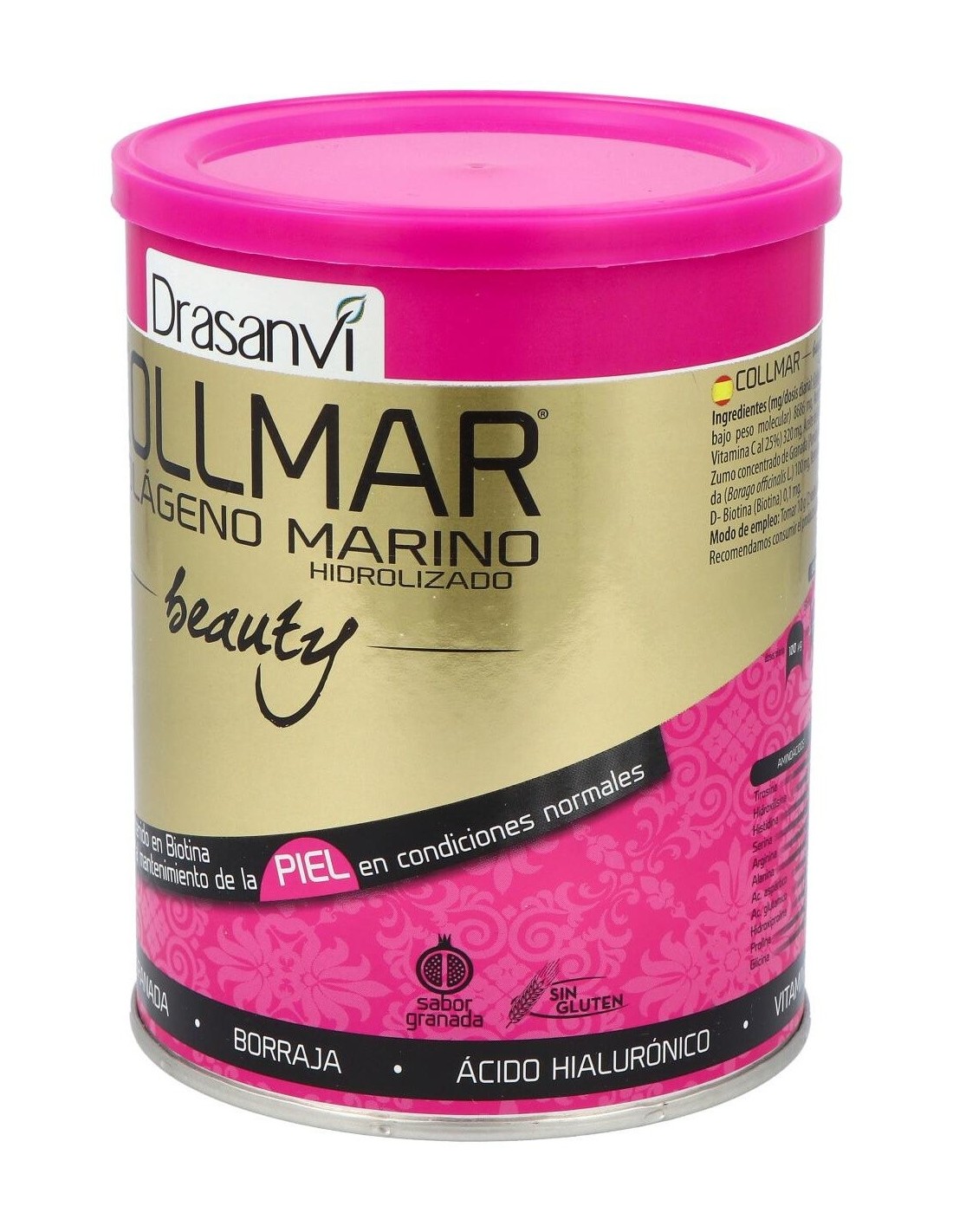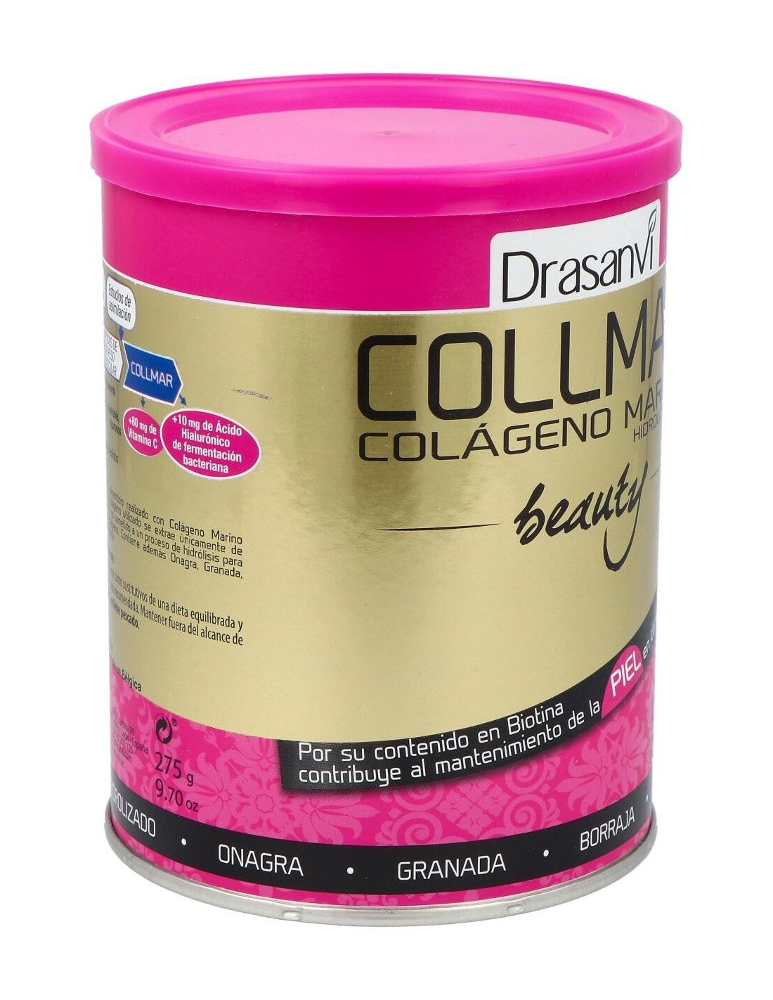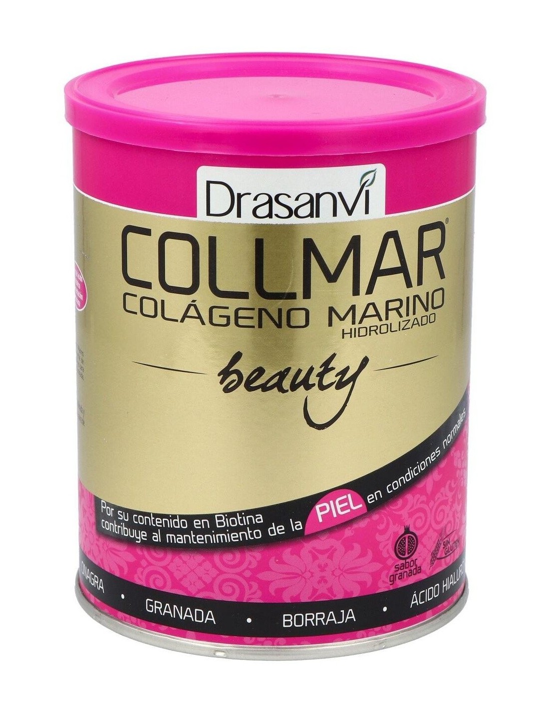 Collmar® Beauty, una estudiada composición, cuyo ingrediente principal es el colágeno marino hidrolizado, el cual ha sido reforzado con vitaminas como la biotina y la vitamina C, ácidos insaturados provenientes del aceite de borraja y onagra, y potenciado con las propiedades de la granada.