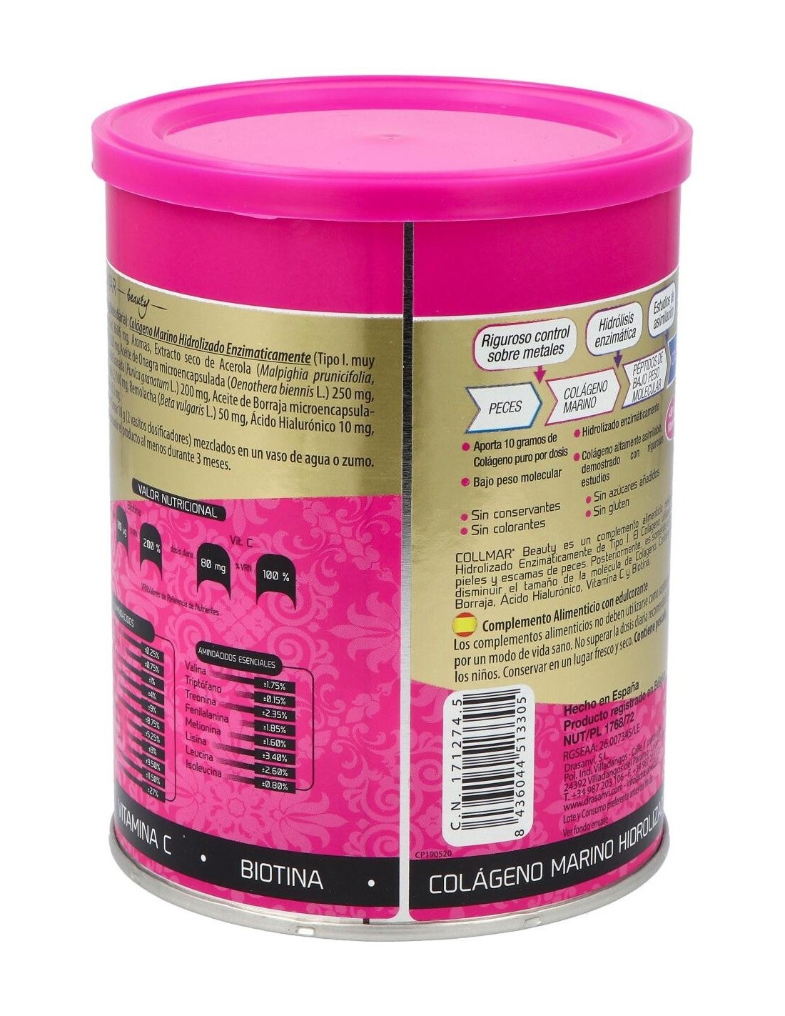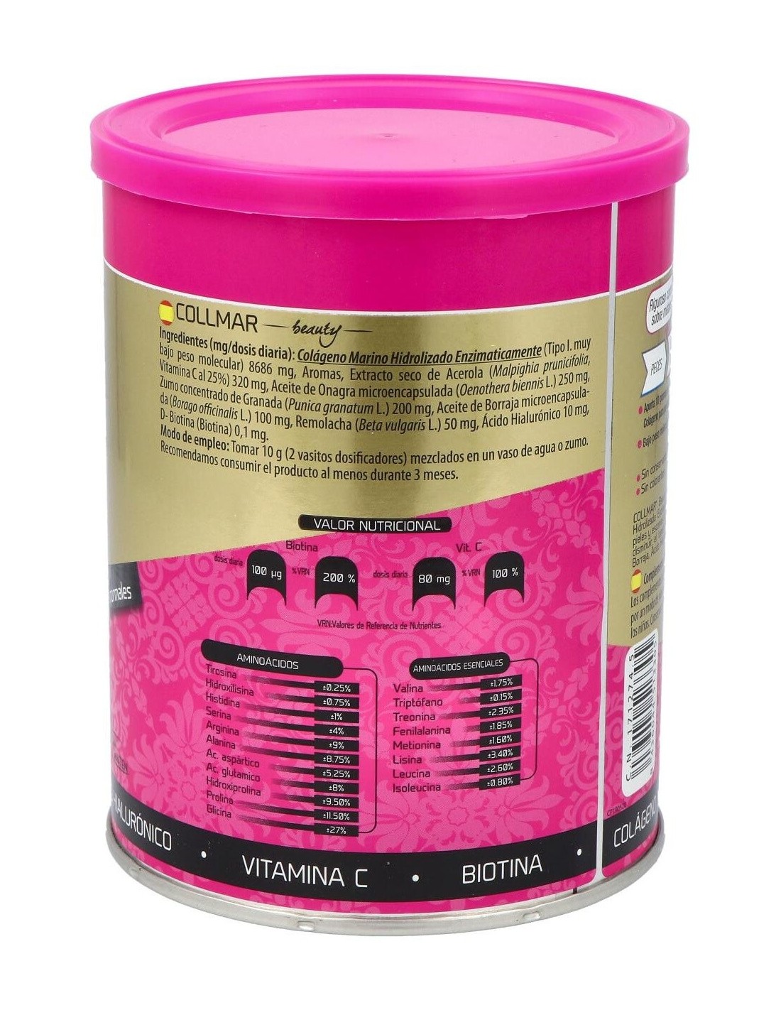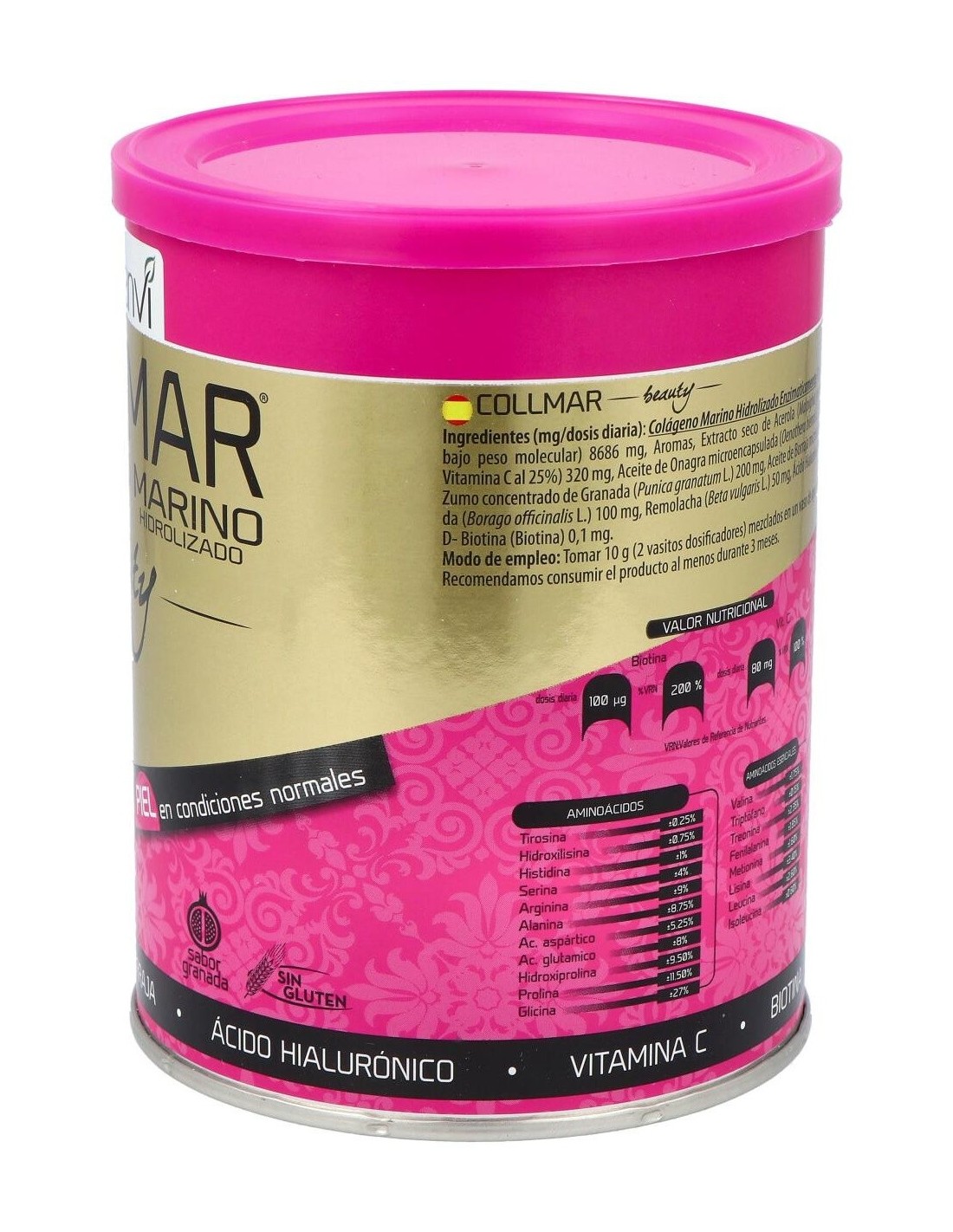 Collmar® Beauty, una estudiada composición, cuyo ingrediente principal es el colágeno marino hidrolizado, el cual ha sido reforzado con vitaminas como la biotina y la vitamina C, ácidos insaturados provenientes del aceite de borraja y onagra, y potenciado con las propiedades de la granada.
